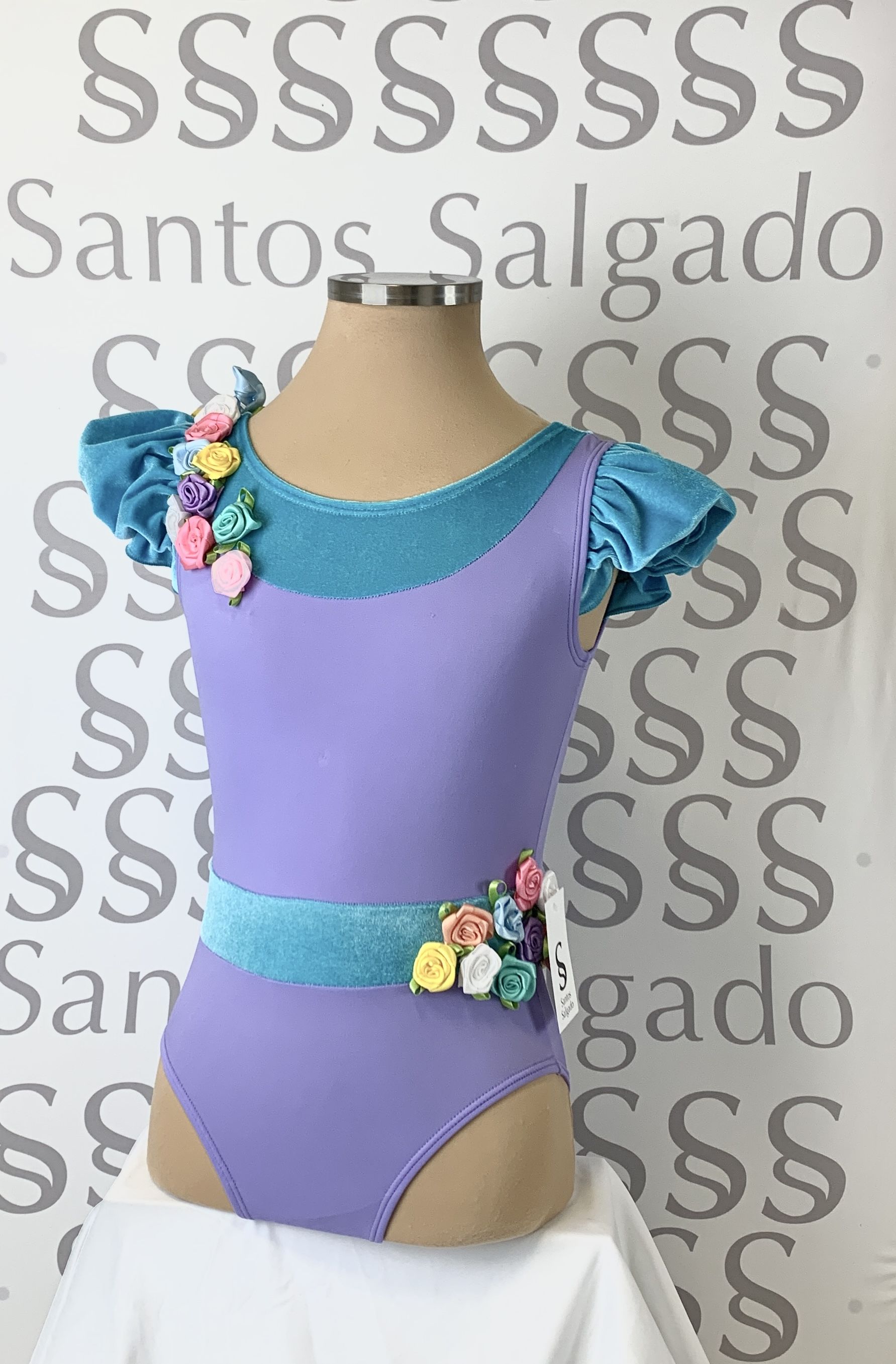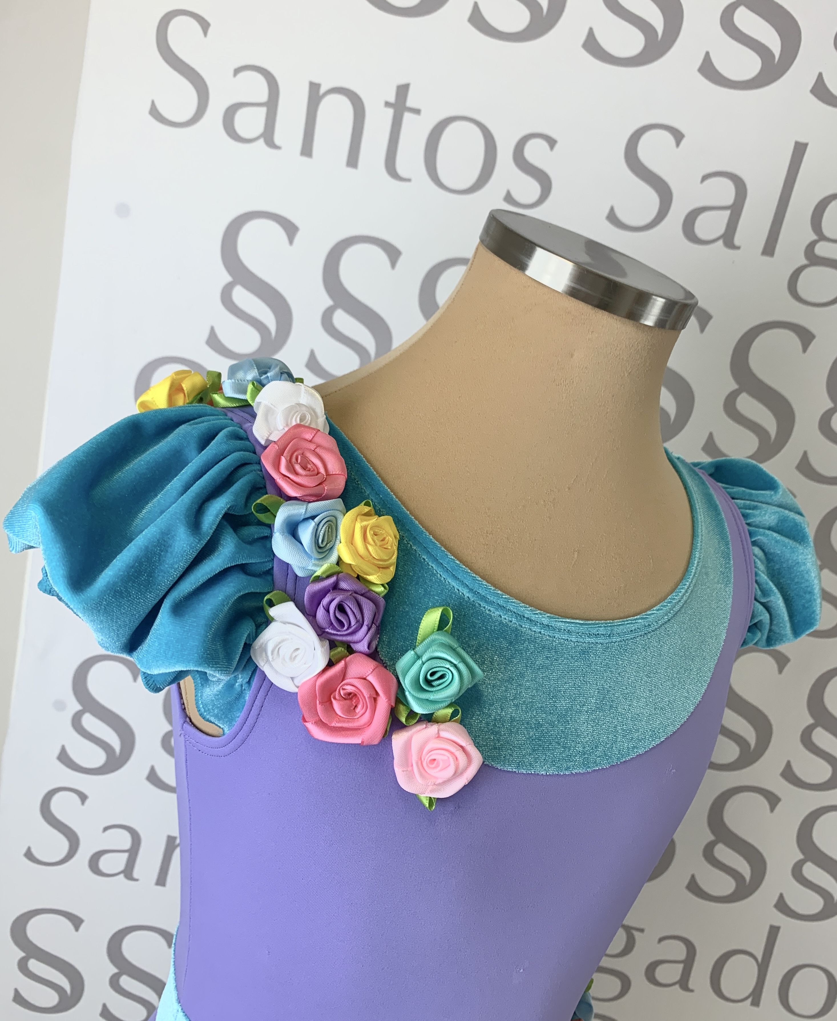 Body malva clarito con pechera, cinturón y mangas tipo farol en terciopelo azul turquesa. Adorno de flores de colores en cinta de raso en hombro y lateral cadera