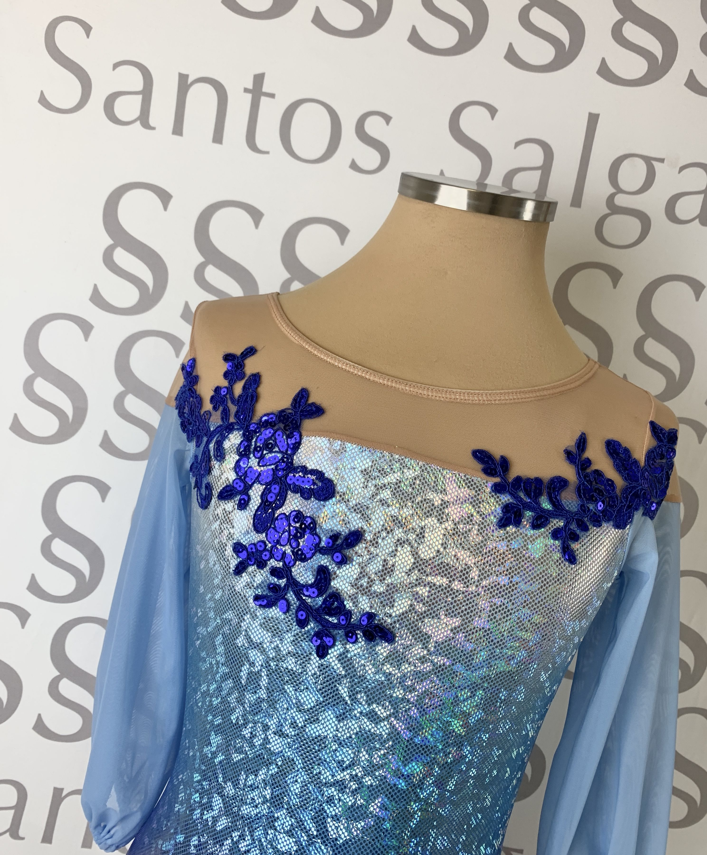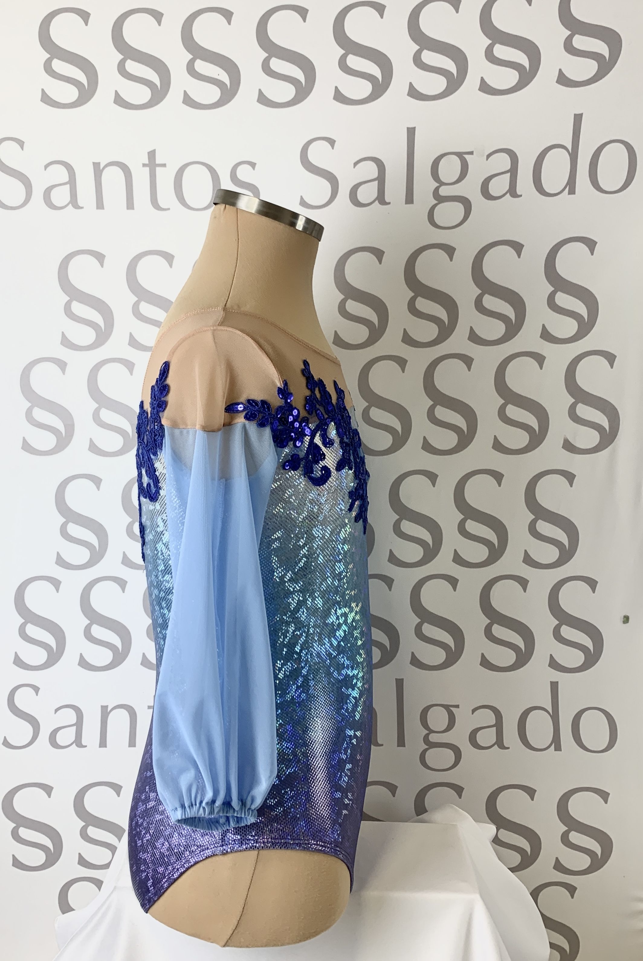 Body en tejido de holograma degradado, de morado a azul clarito, con escote bañera con gasa color carne en hombros. Mangas 3/4 en gasa abullonadas.