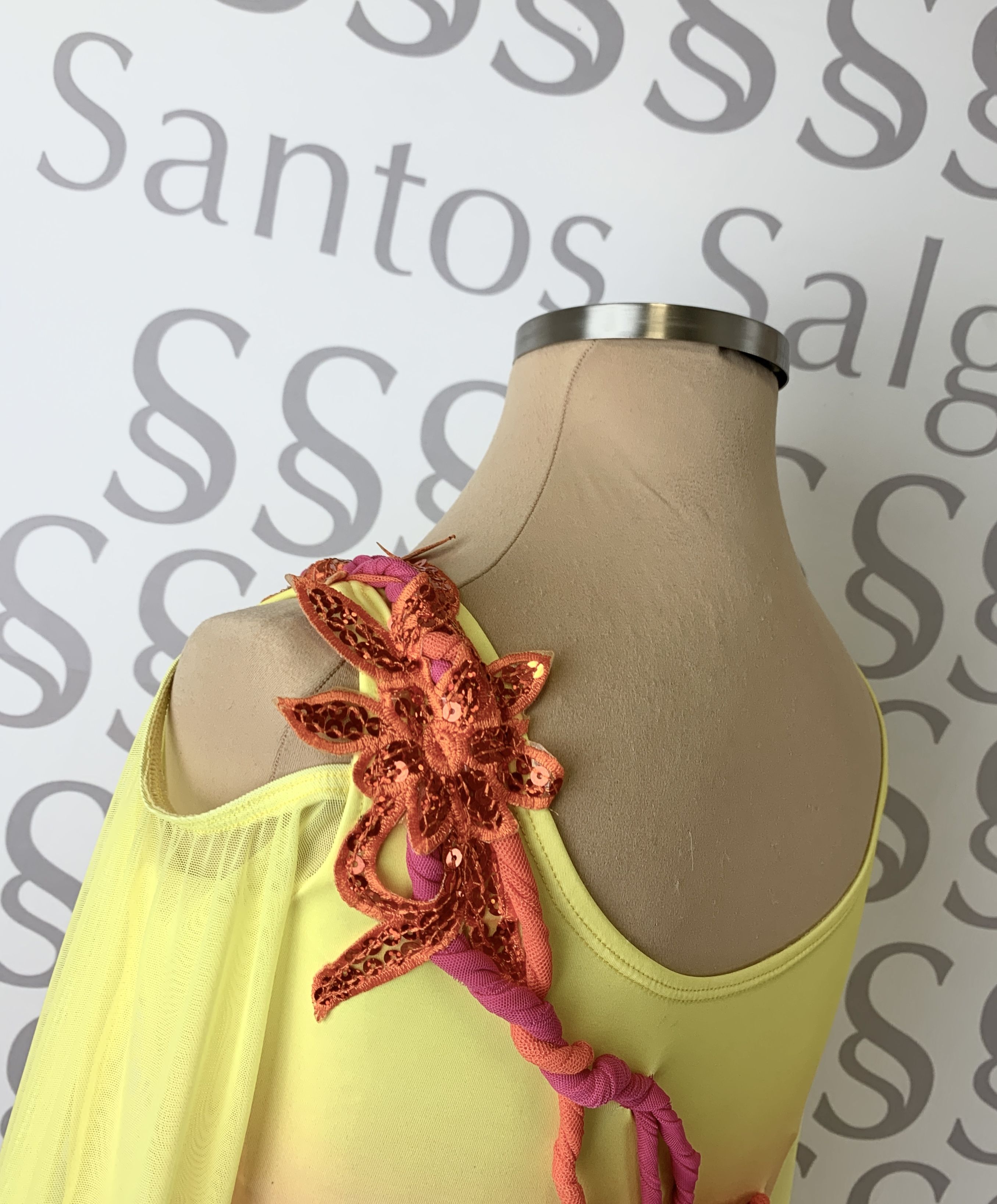 Detalle de aplicación de lentejuelas en hombro de donde salen gasas, en distintos tonos, enroscadas que acaban en un lateral, abriéndose