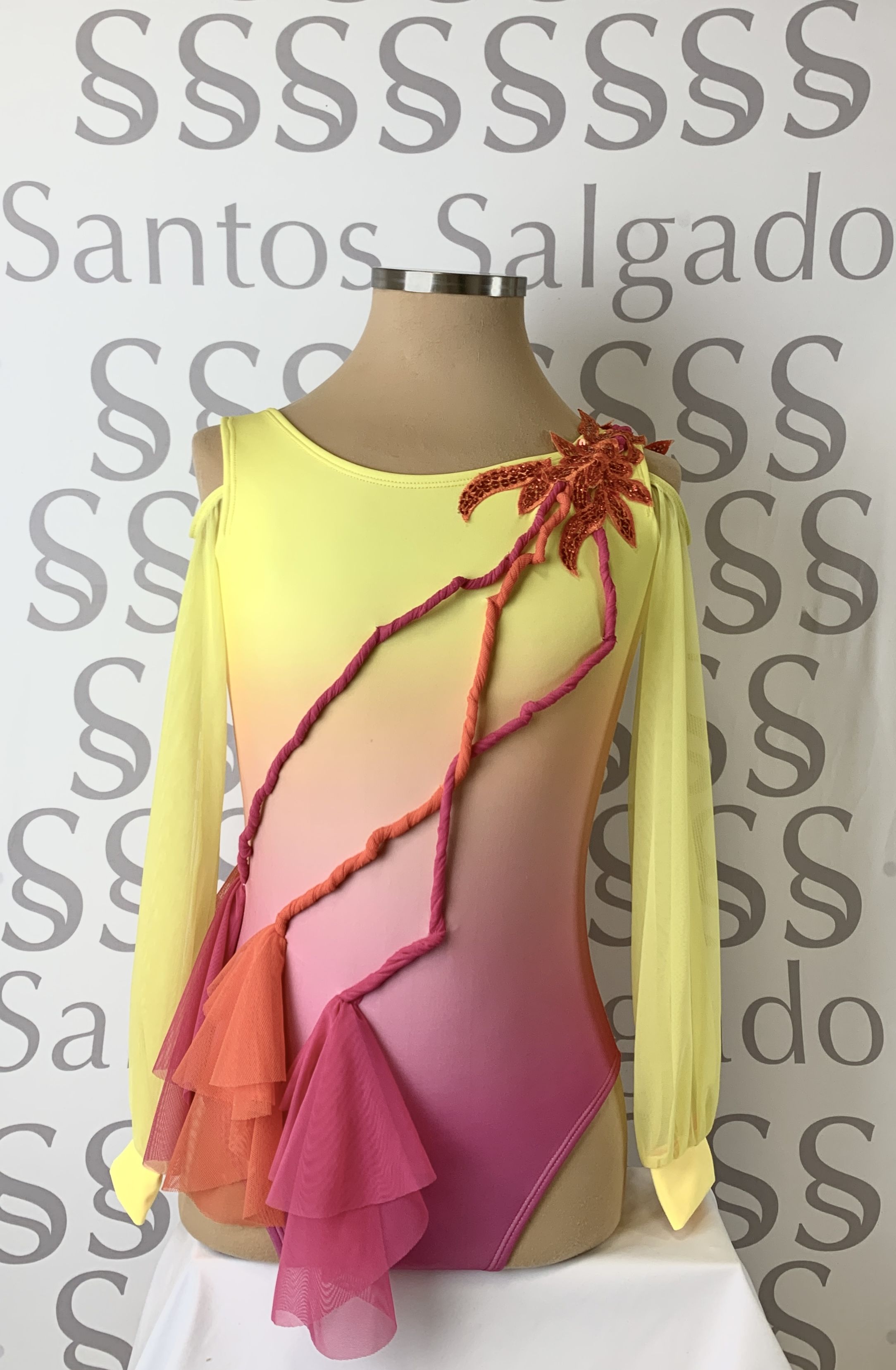 Body degradé de rosa fuerte a amarillo con mangas largas de gasa abullonadas con puño dejando al descubierto los hombros.