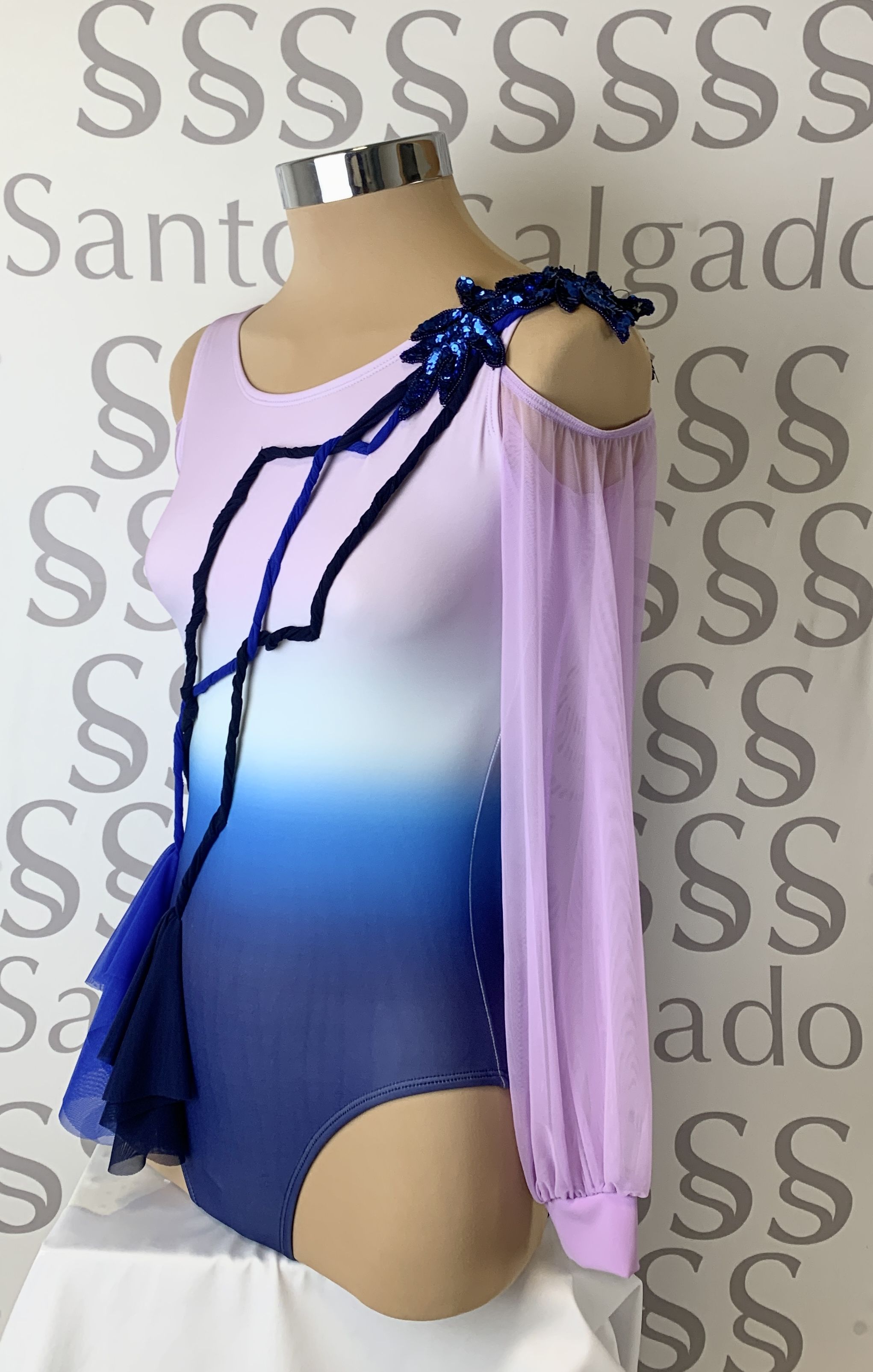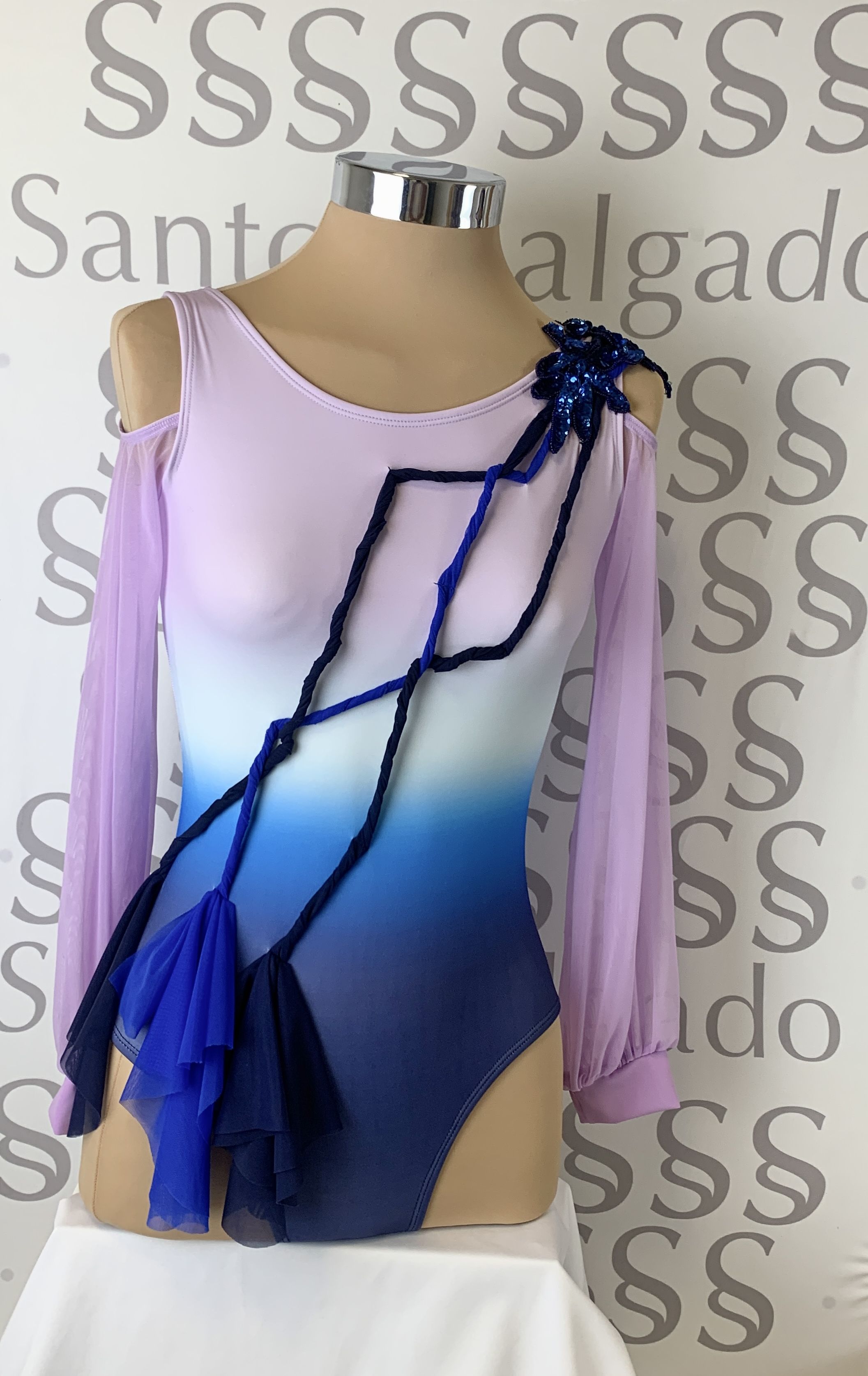 Body degradé  en varios tonos de azul oscuro a azul claro llegando al lila claro con mangas largas de gasa abullonadas con puño dejando al descubierto los hombros.