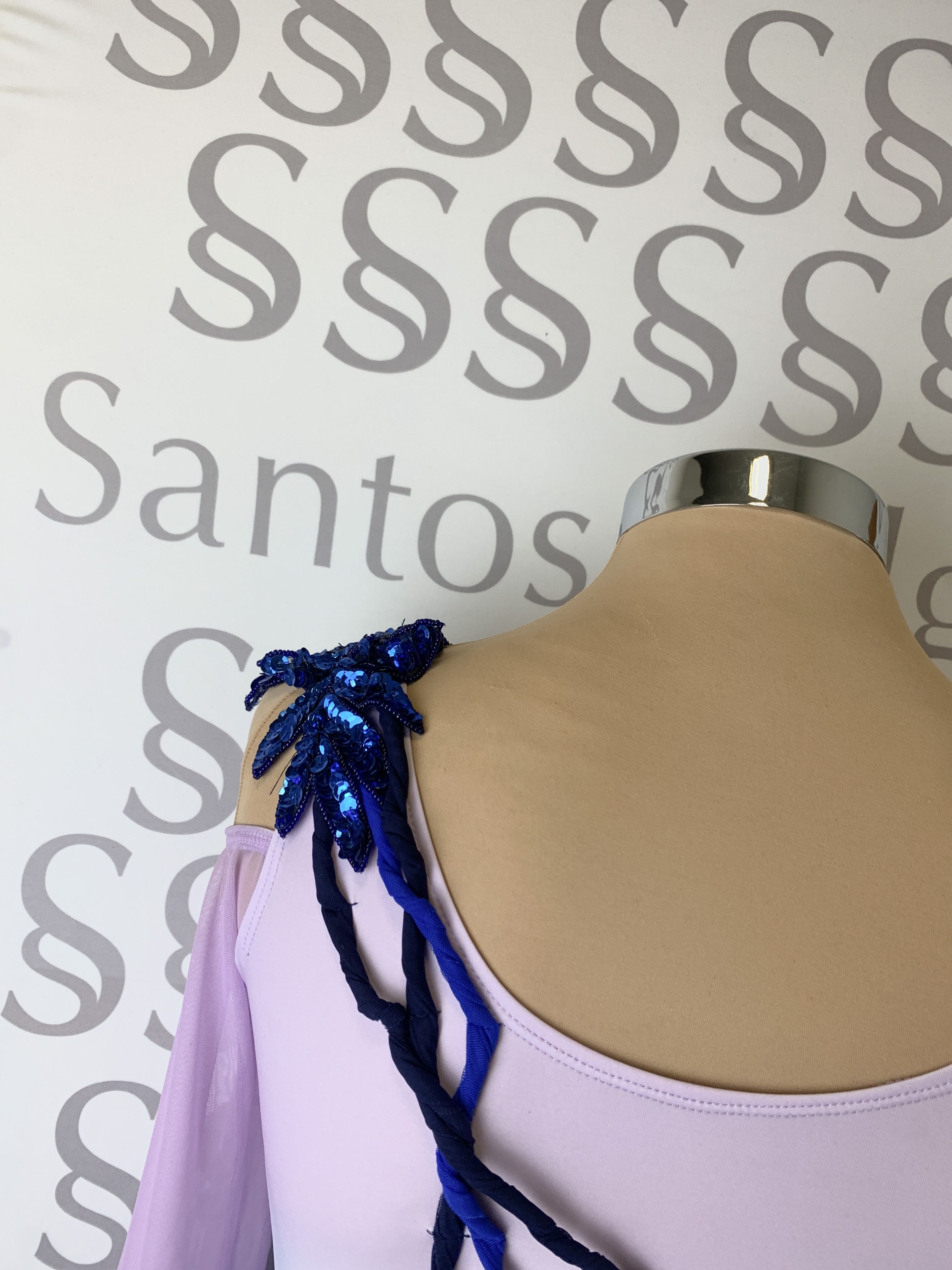 Detalle de aplicación de lentejuelas en hombro de donde salen gasas, en distintos tonos, enroscadas que acaban en un lateral, abriéndose