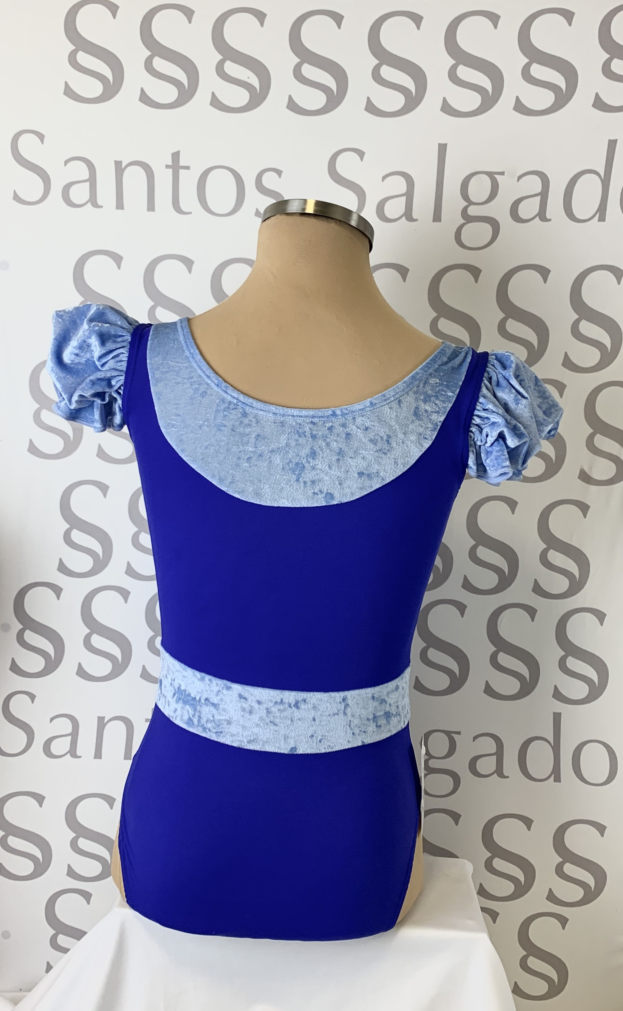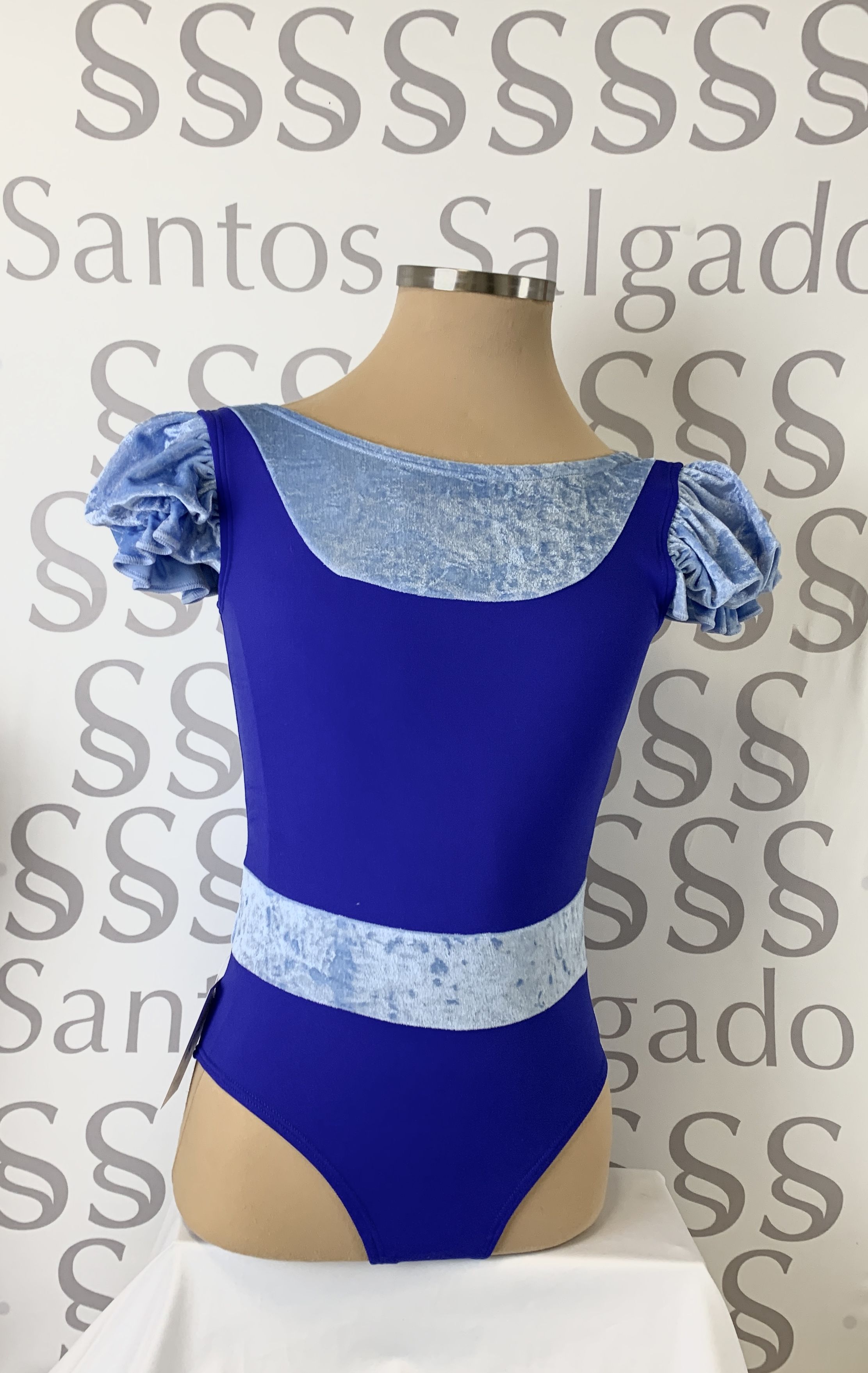 Body de licra azulón con cinturón, escote y mangas tipo farol en terciopelo azul índigo.