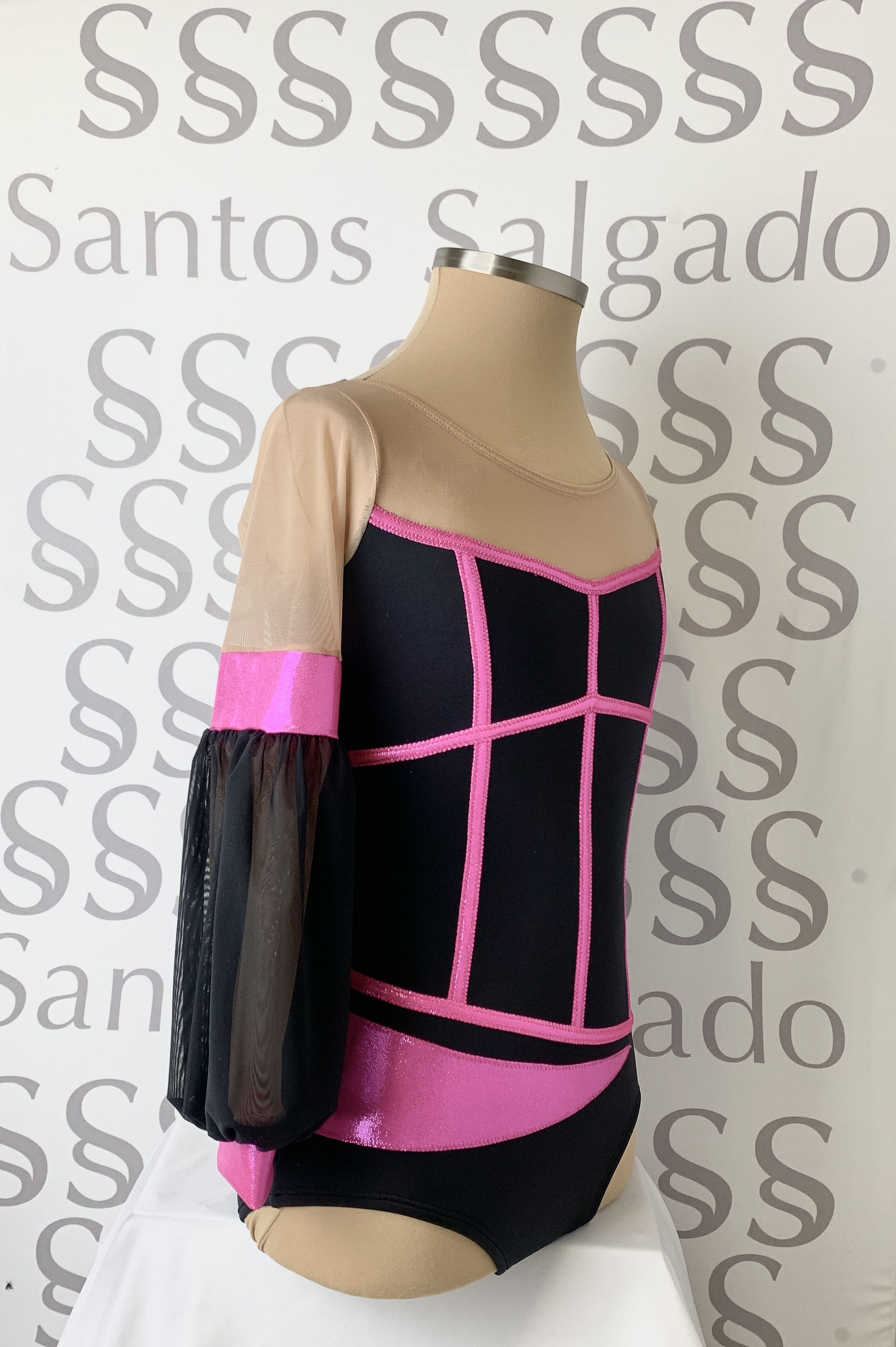 Detalles en tejido rosa brillante simulando tipo corsé y brazaletes y puños en mangas
