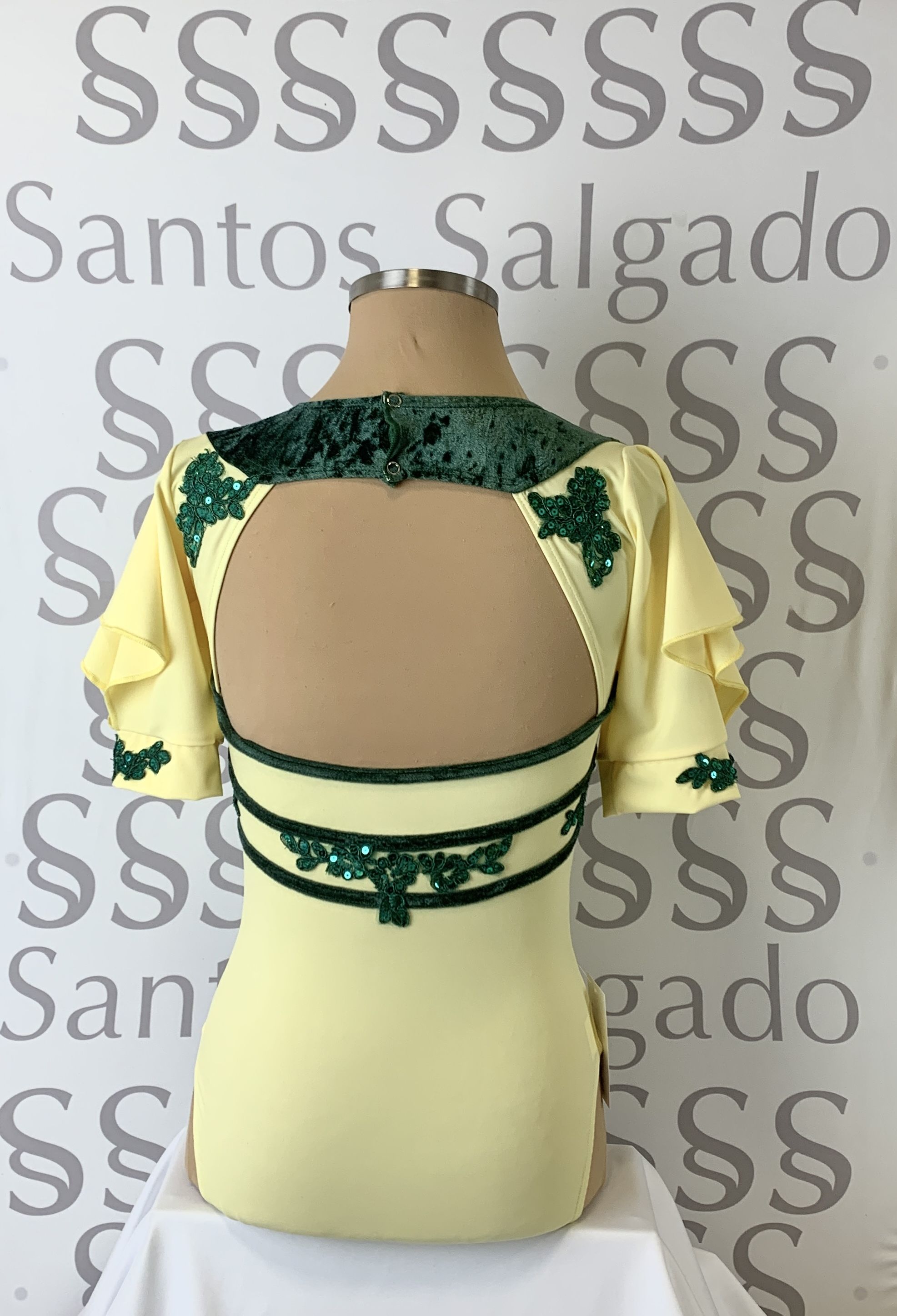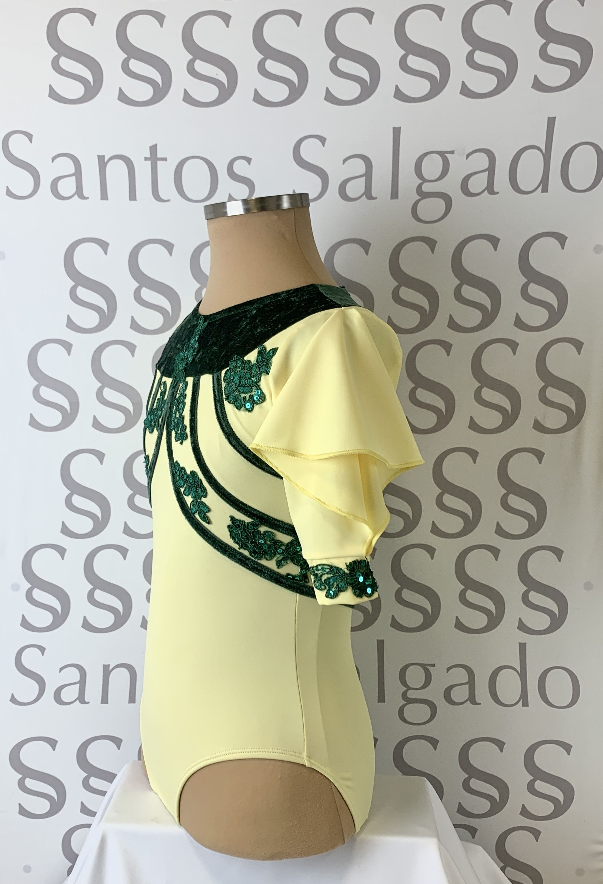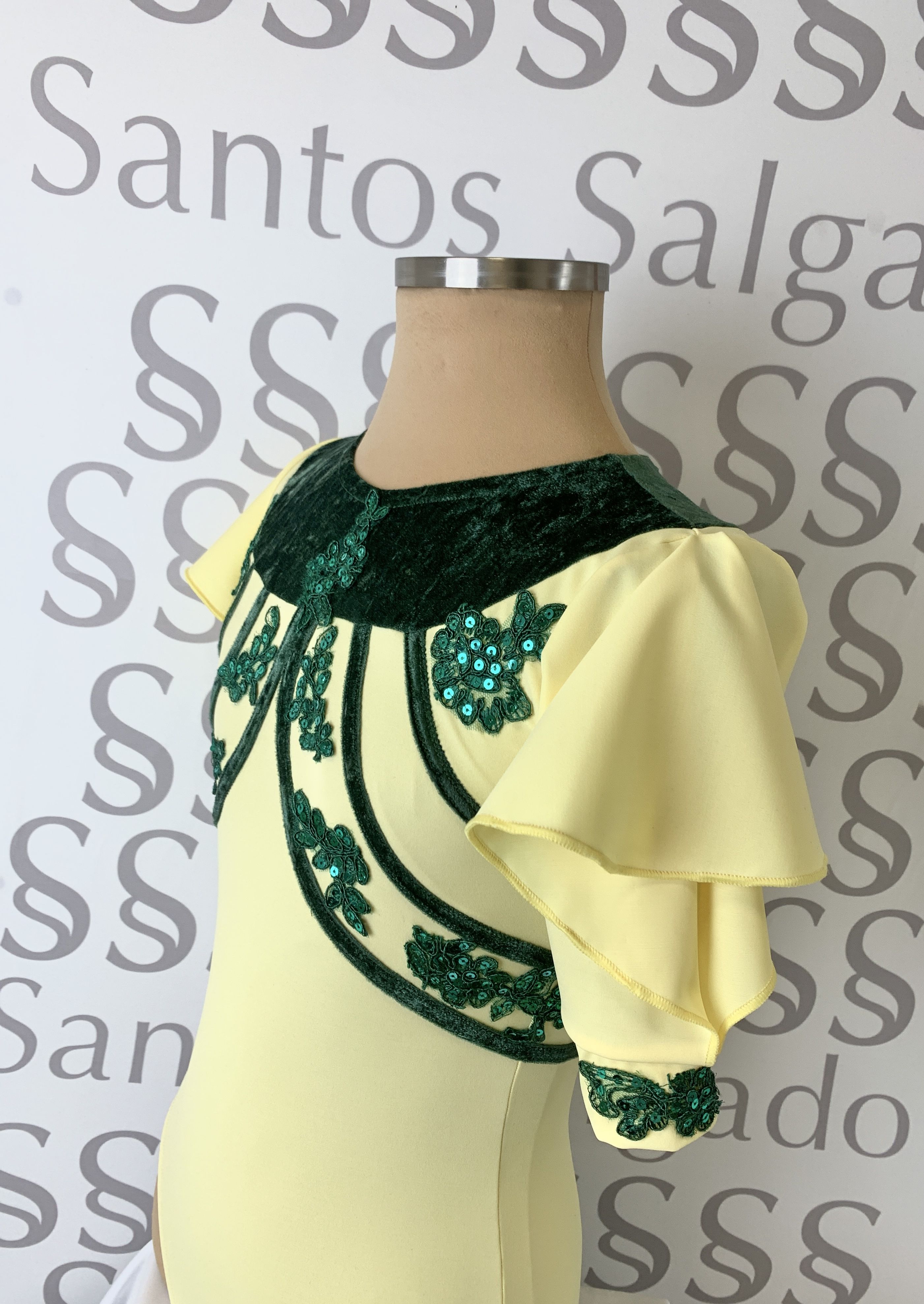 Detalle de bordados en lentejuela en color verde a tono