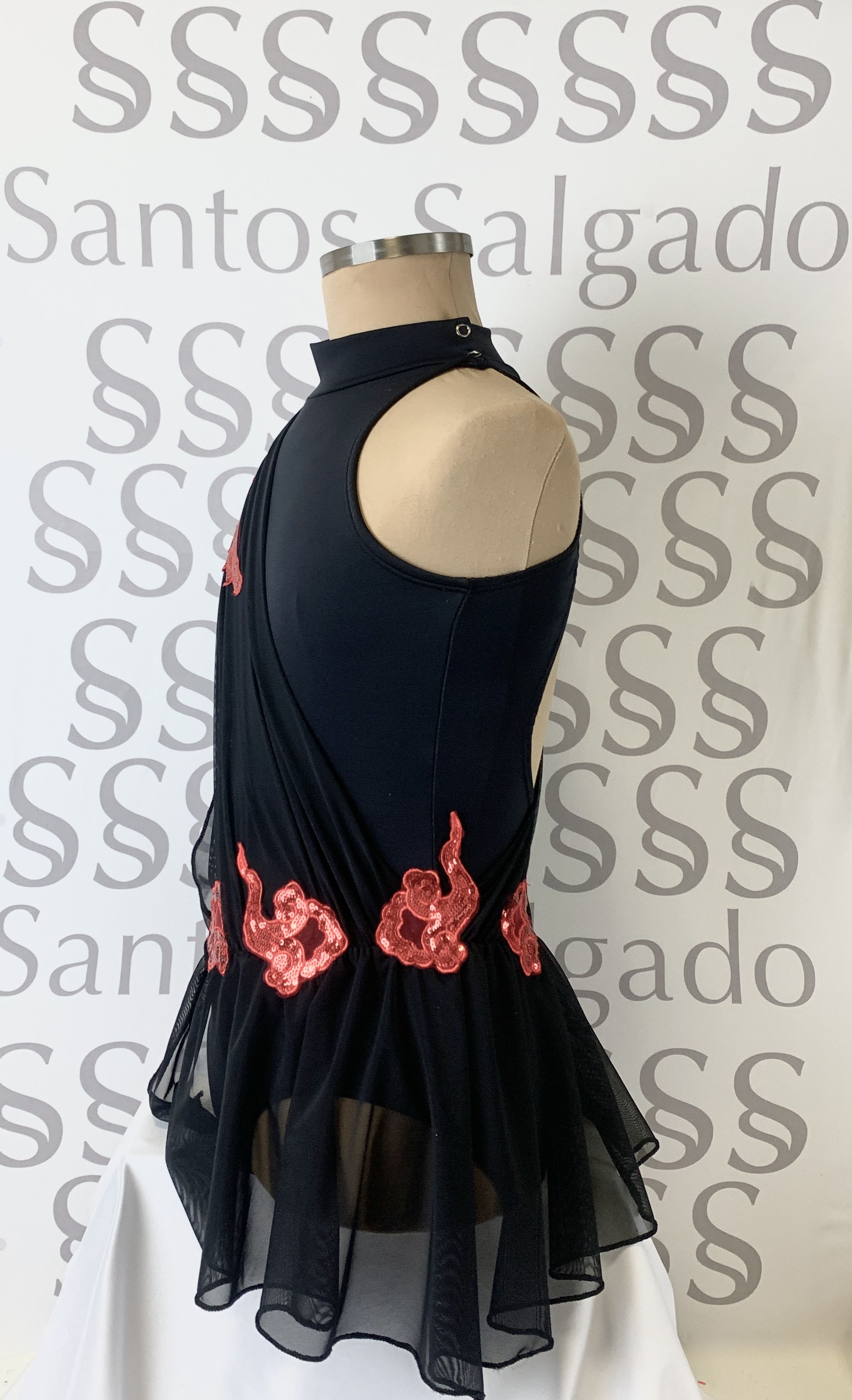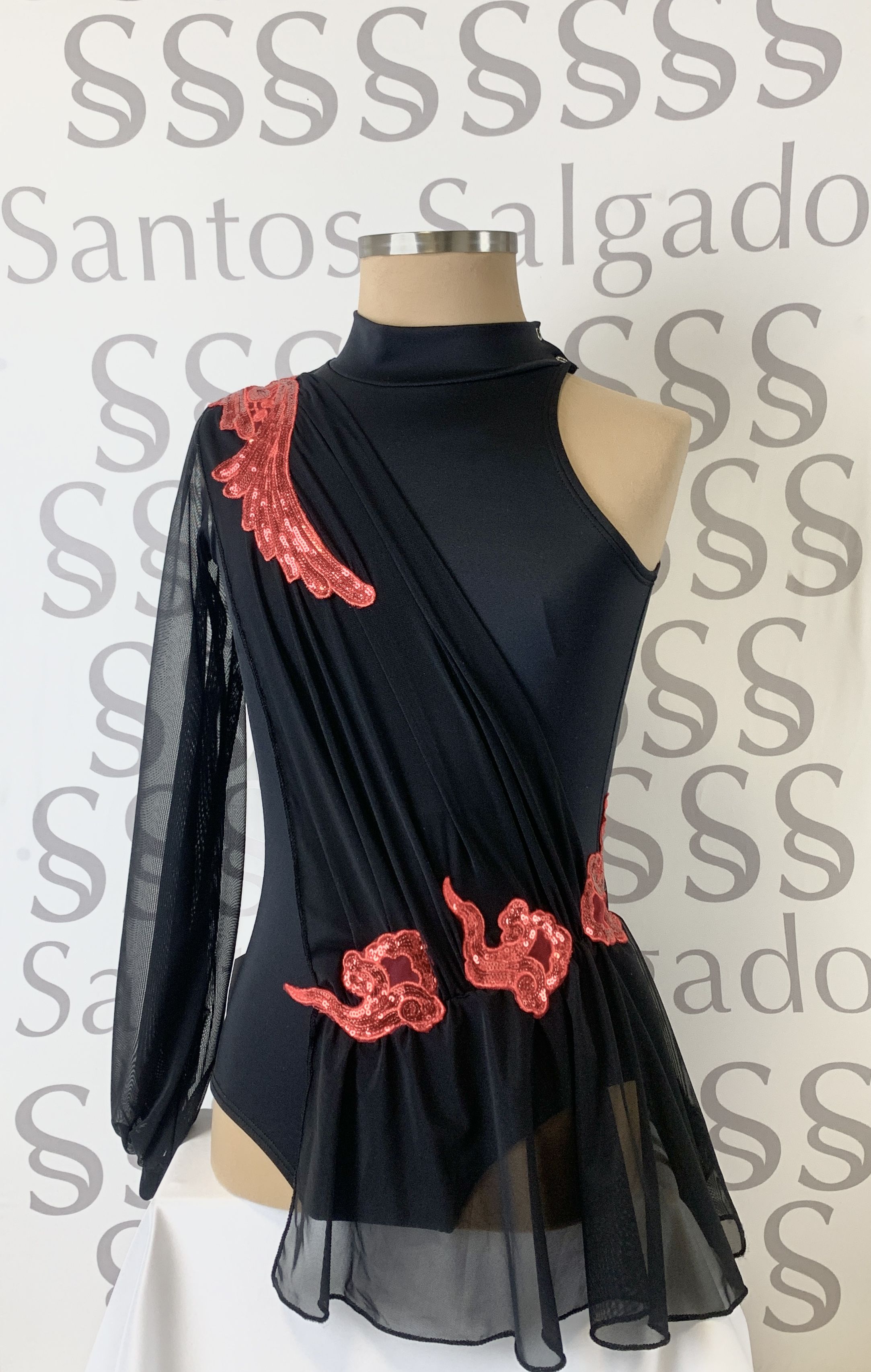 Body asimétrico con cuello alto con gran lágrima en espalda y una manga larga abullonada con puño,  abrochado en lateral.