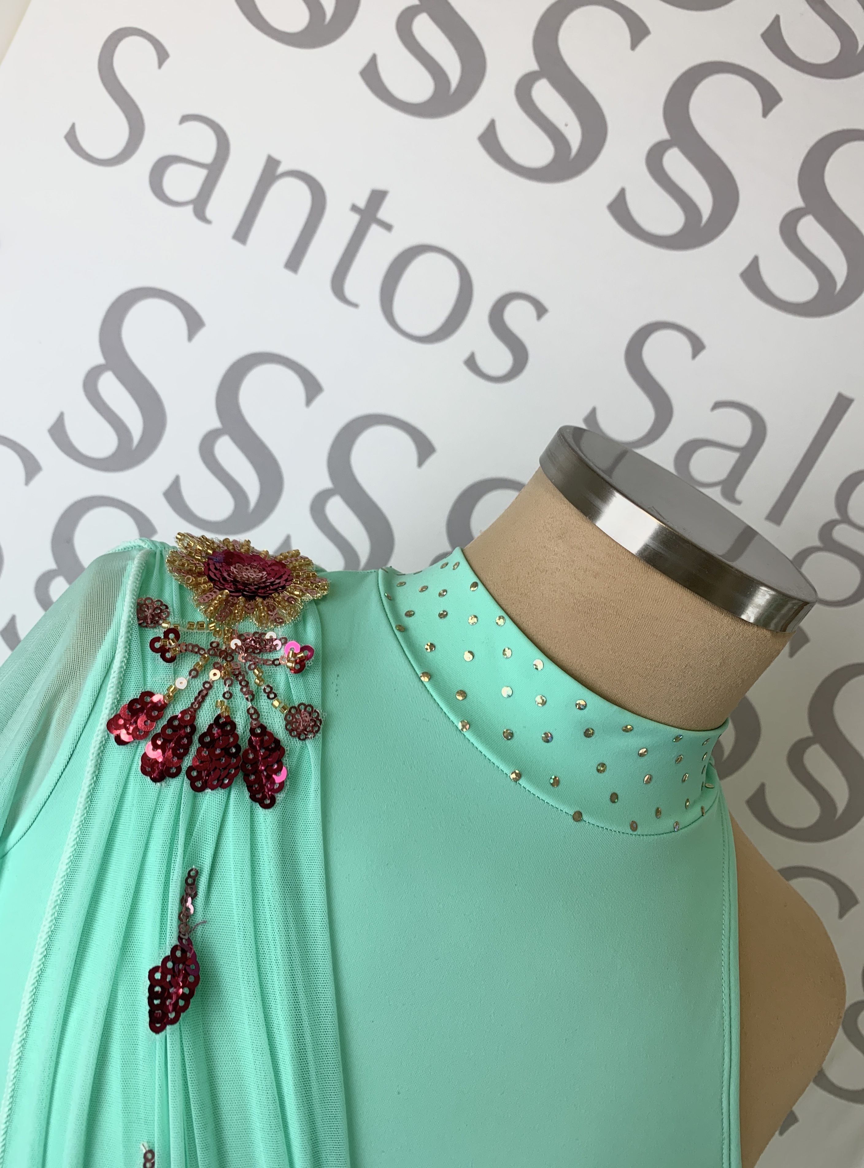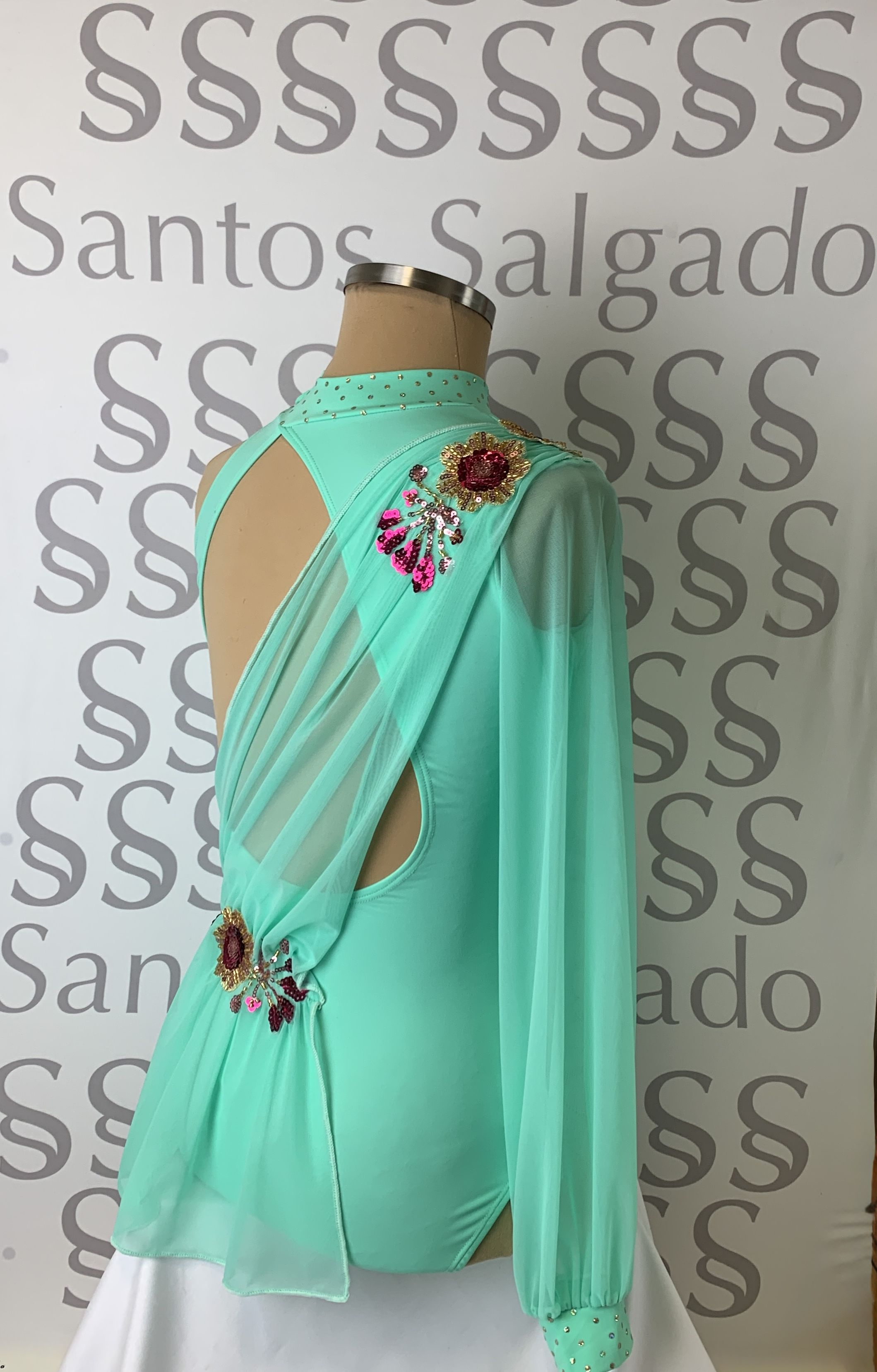 Talla 4 Body asimétrico verde agua con cuello alto con gran lágrima en espalda y una manga larga abullonada con puño, abrochado en lateral. Detalle de gasa drapeada desde un hombro hasta cadera contraria formando especie de pequeña falda. Adornos con aplicaciones de lentejuela dorado y rosa. Cuello y puño salpicados de lentejuela dorada.