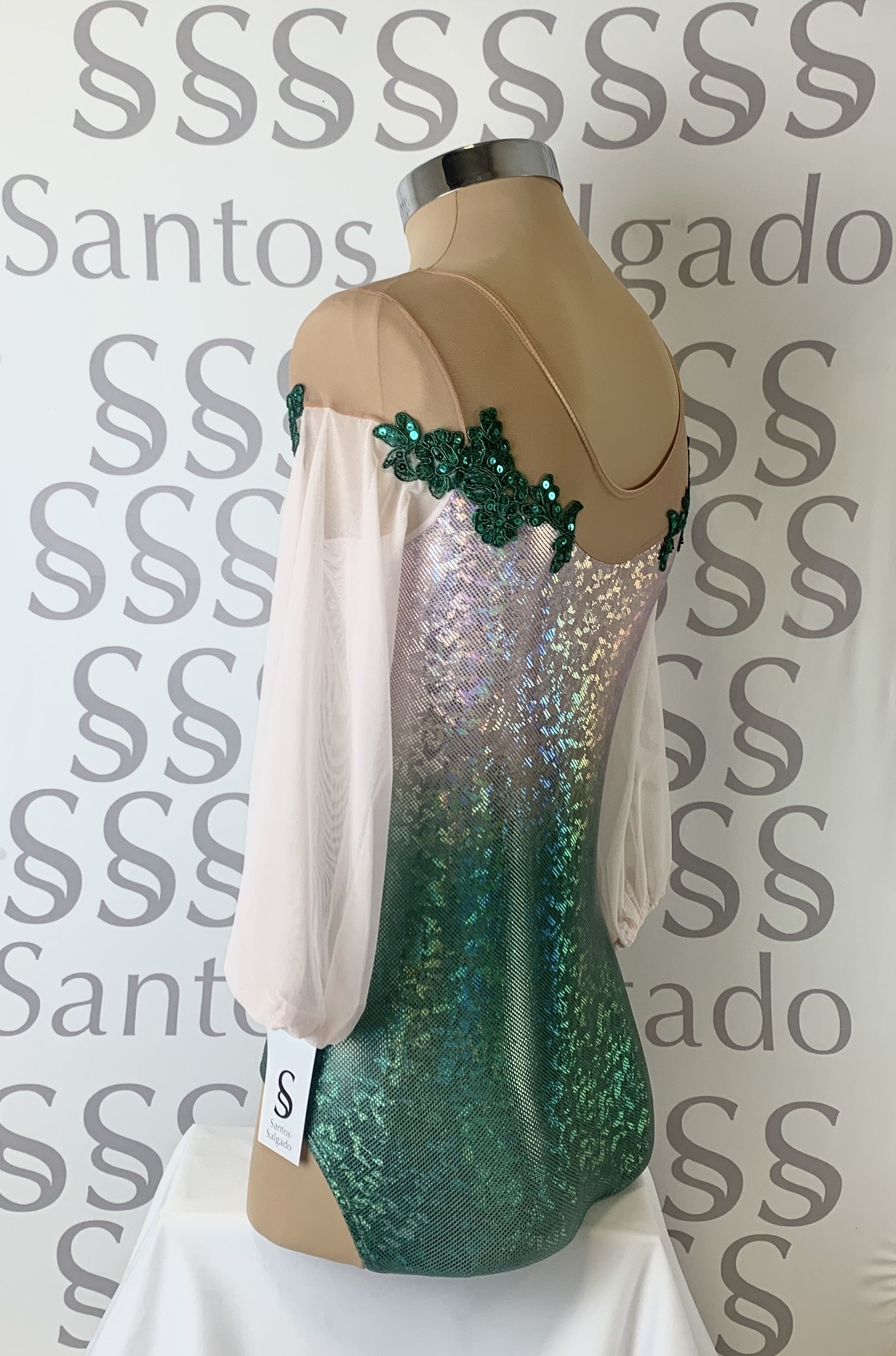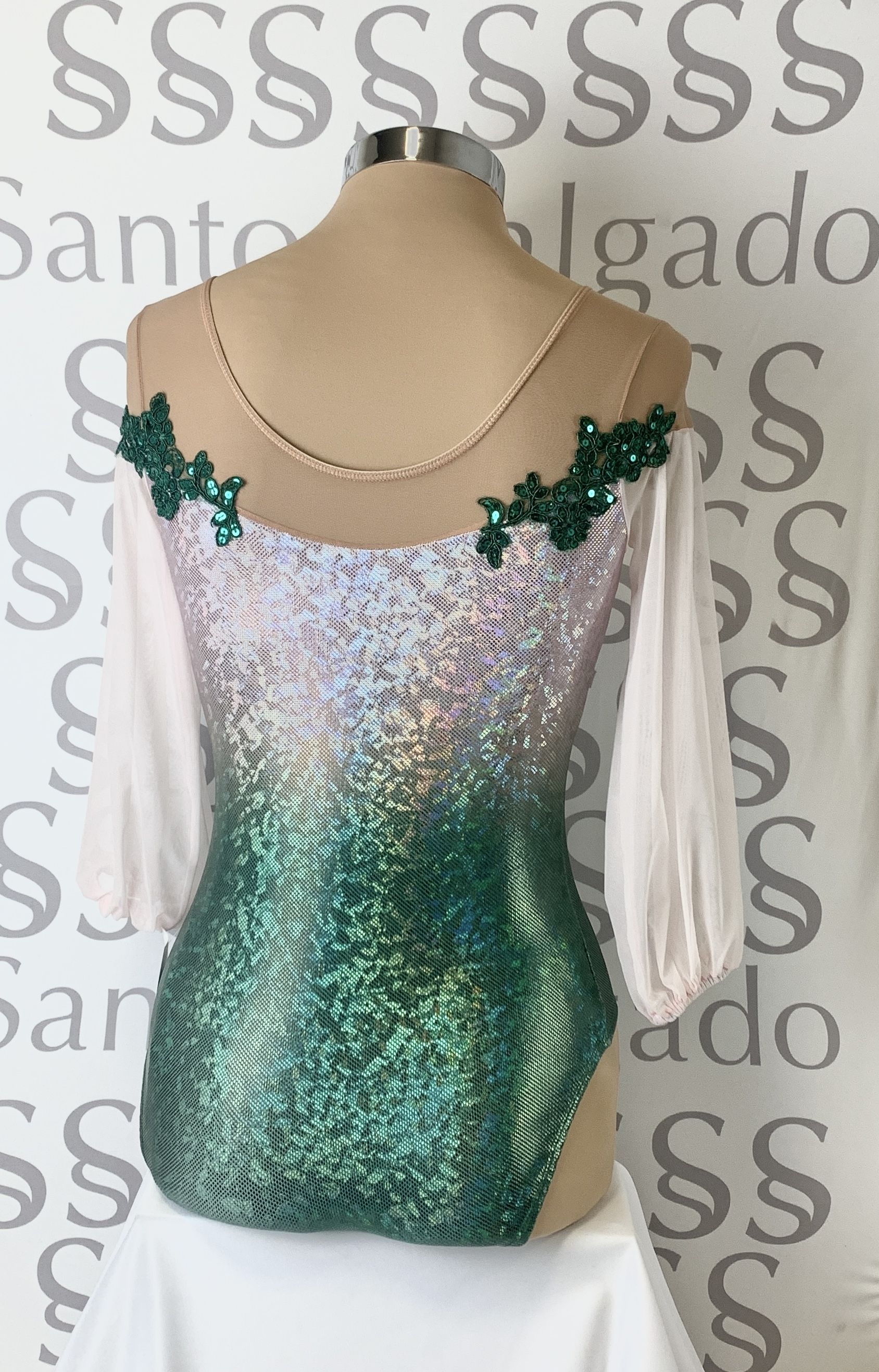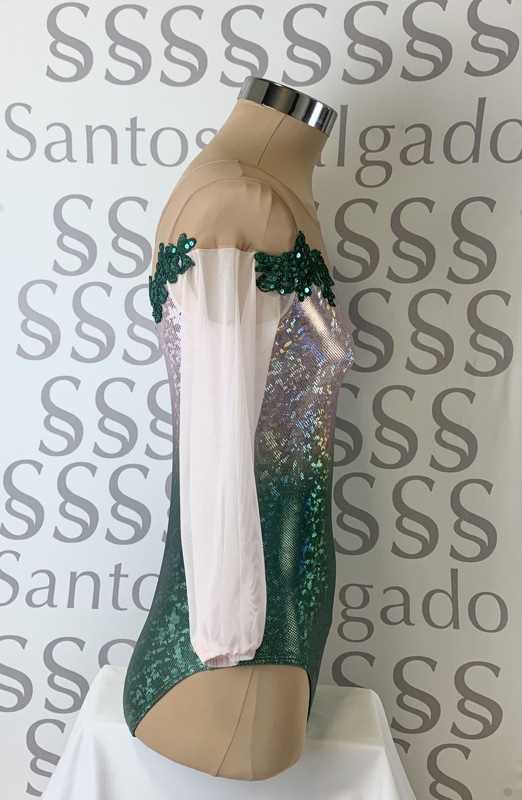 Body en tejido de holograma degradado, de verde hierba a rosa bebé, con escote bañera con gasa color carne en hombros. Mangas 3/4 en gasa abullonadas.