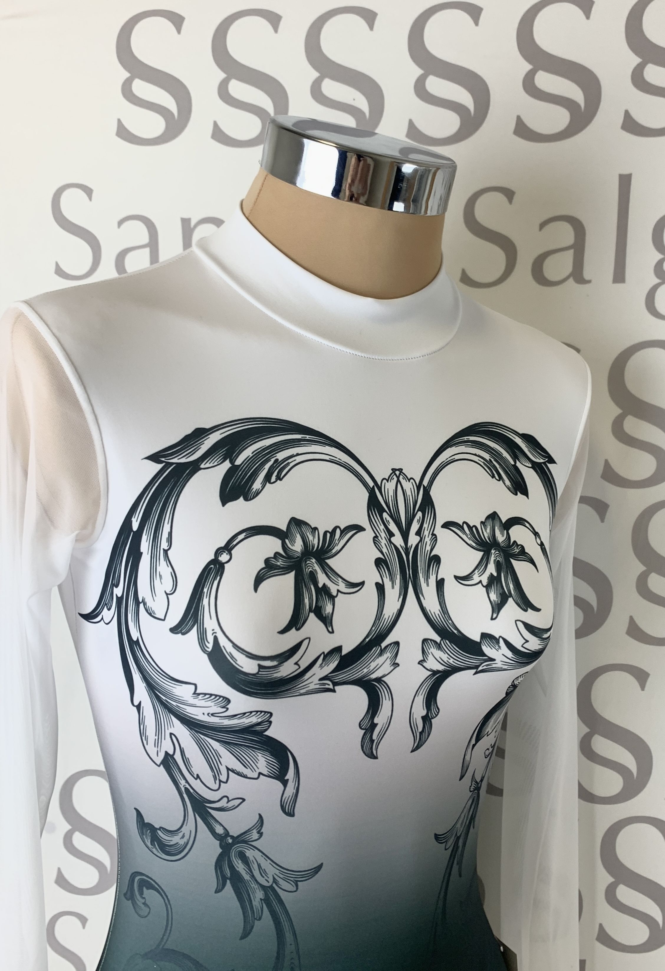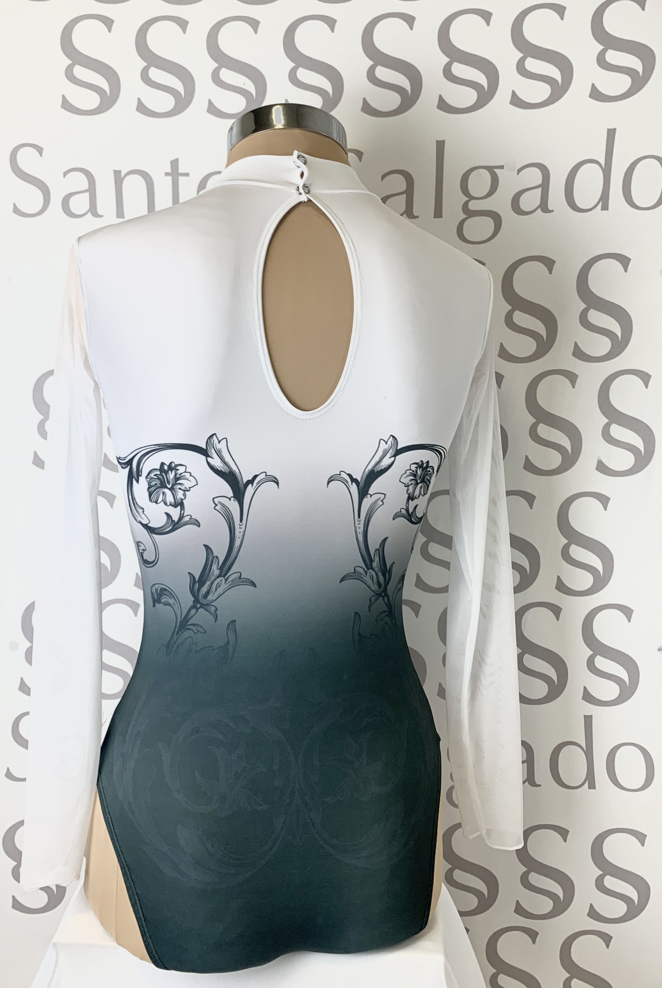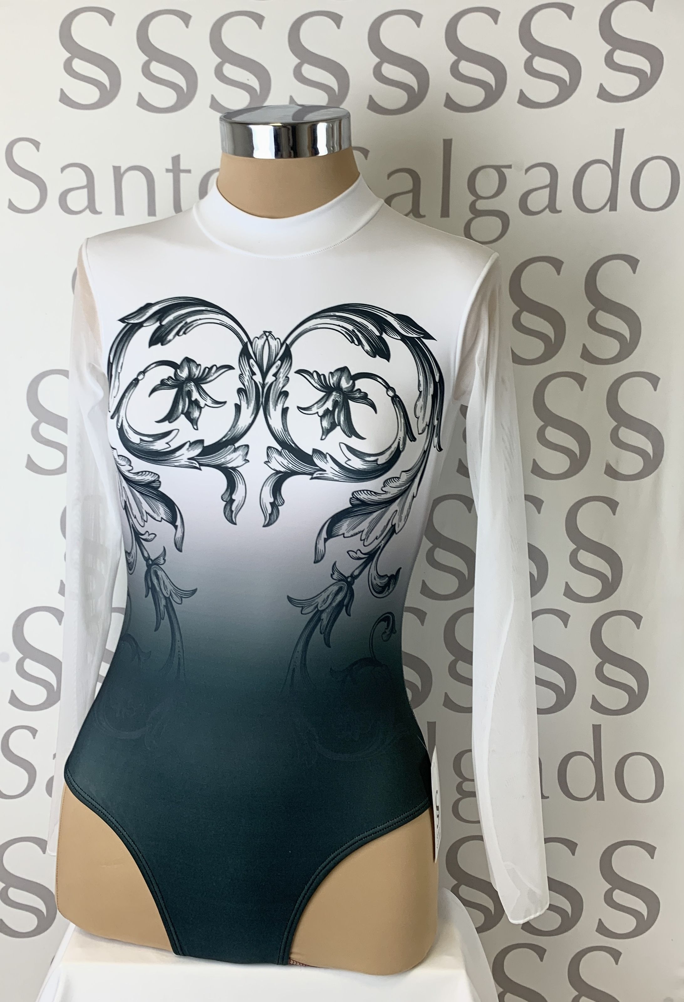 Body sublimado degradado de negro a blanco con precioso estampado de detalle ornamental barroco