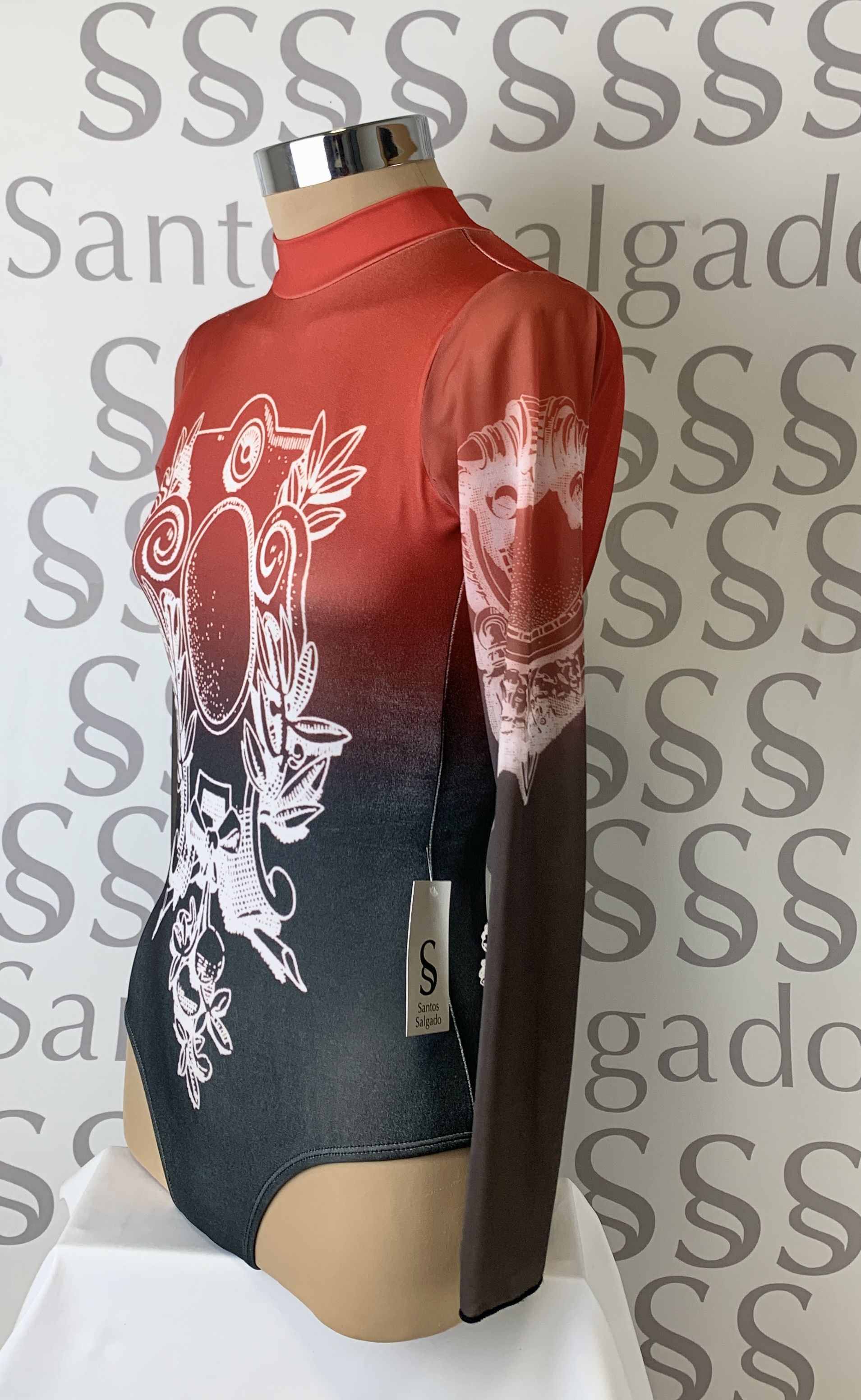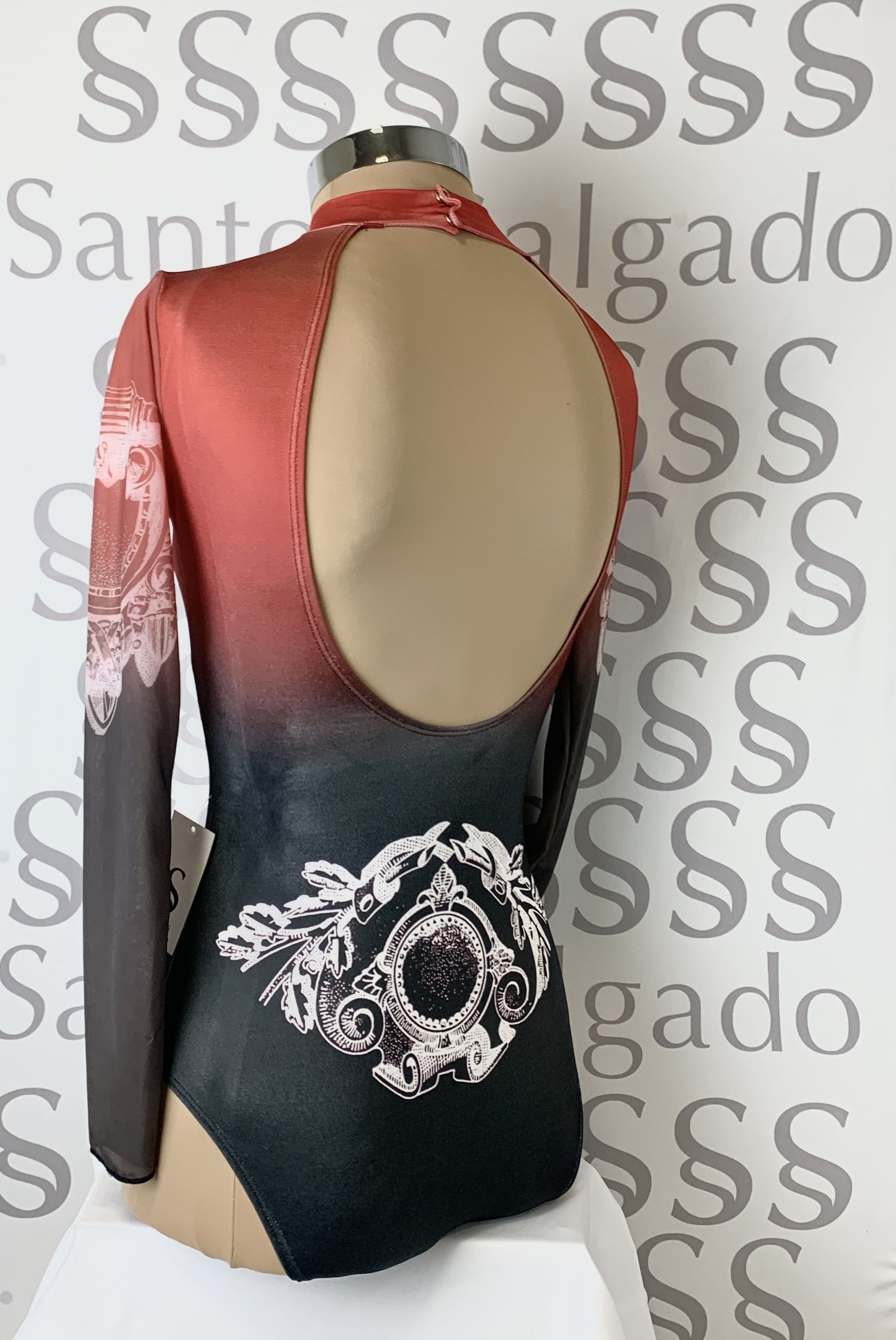 Body de cuello alto y gran escote en espalda con mangas largas de gasa. Todo degradado de negro a caldero.