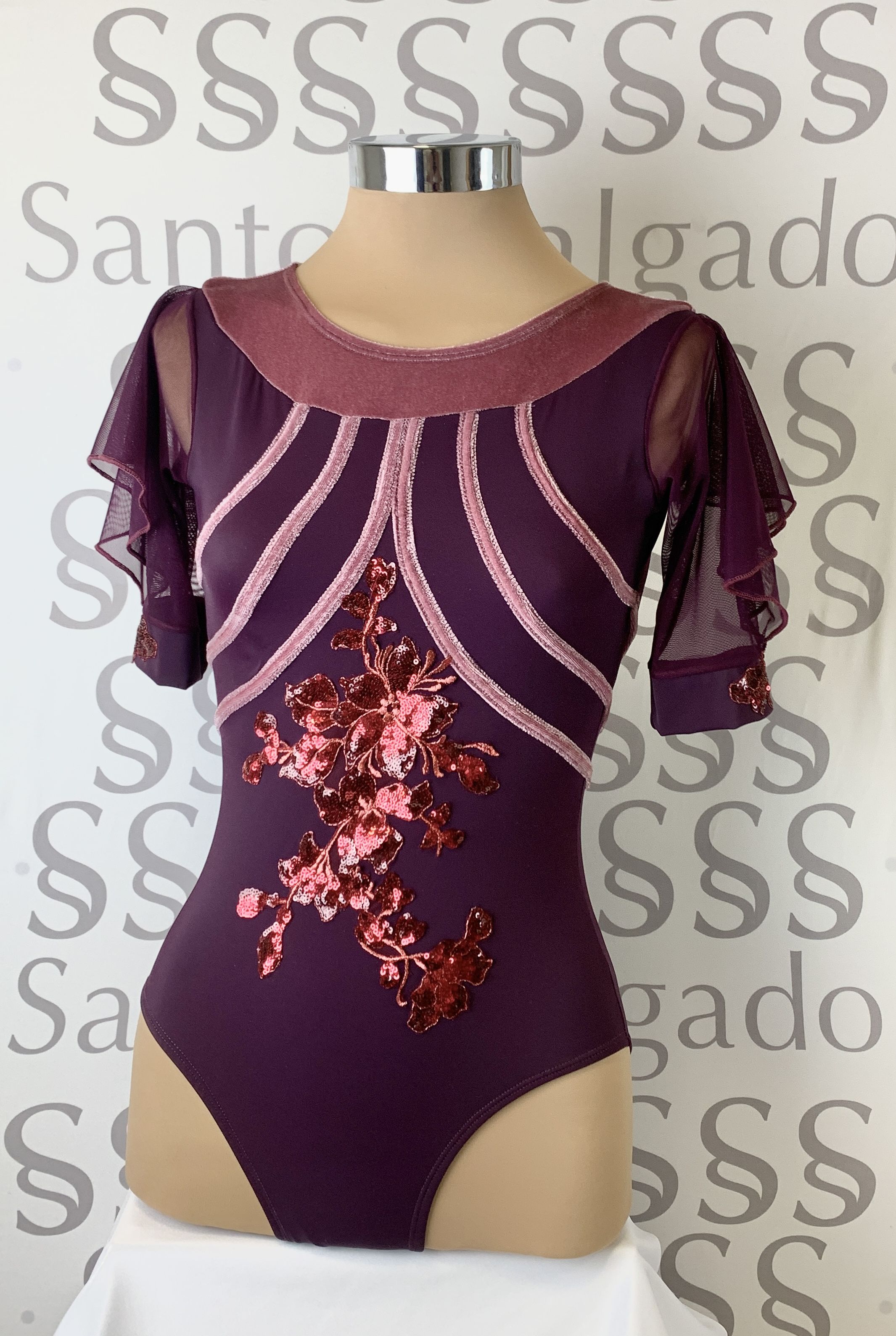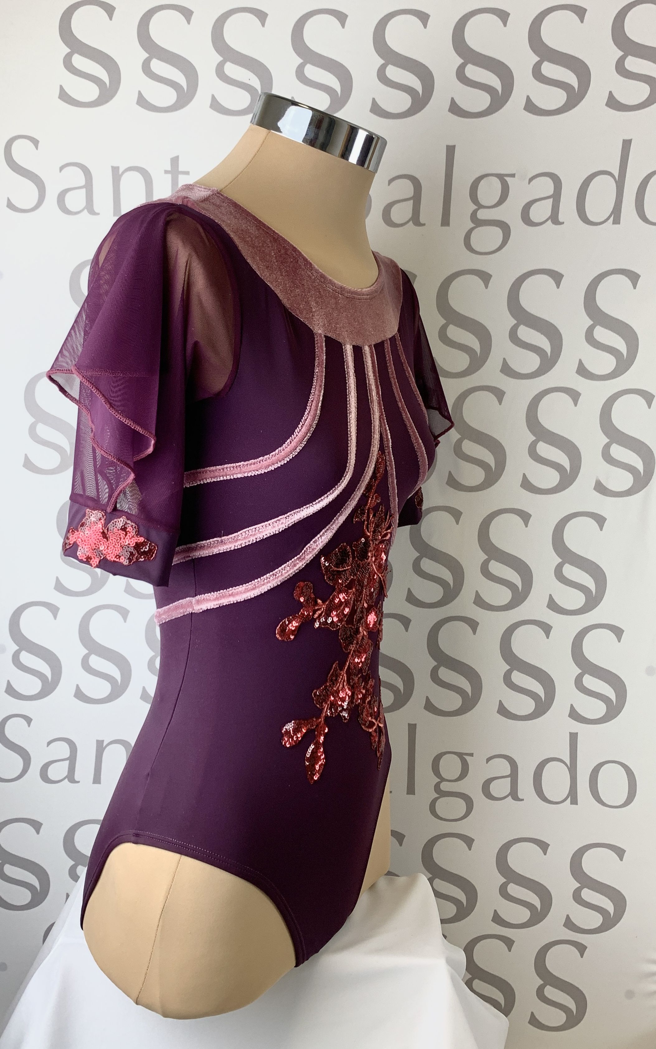 Talla 5 Maillot de falda de gasa y original manga corta con abertura y puño en berenjena. Escote delantero en terciopelo en color rosa empolvado con tiras a ambos lados que atraviesan la espalda, con gran escote. Detalle de aplicaciones en lentejuela a tono