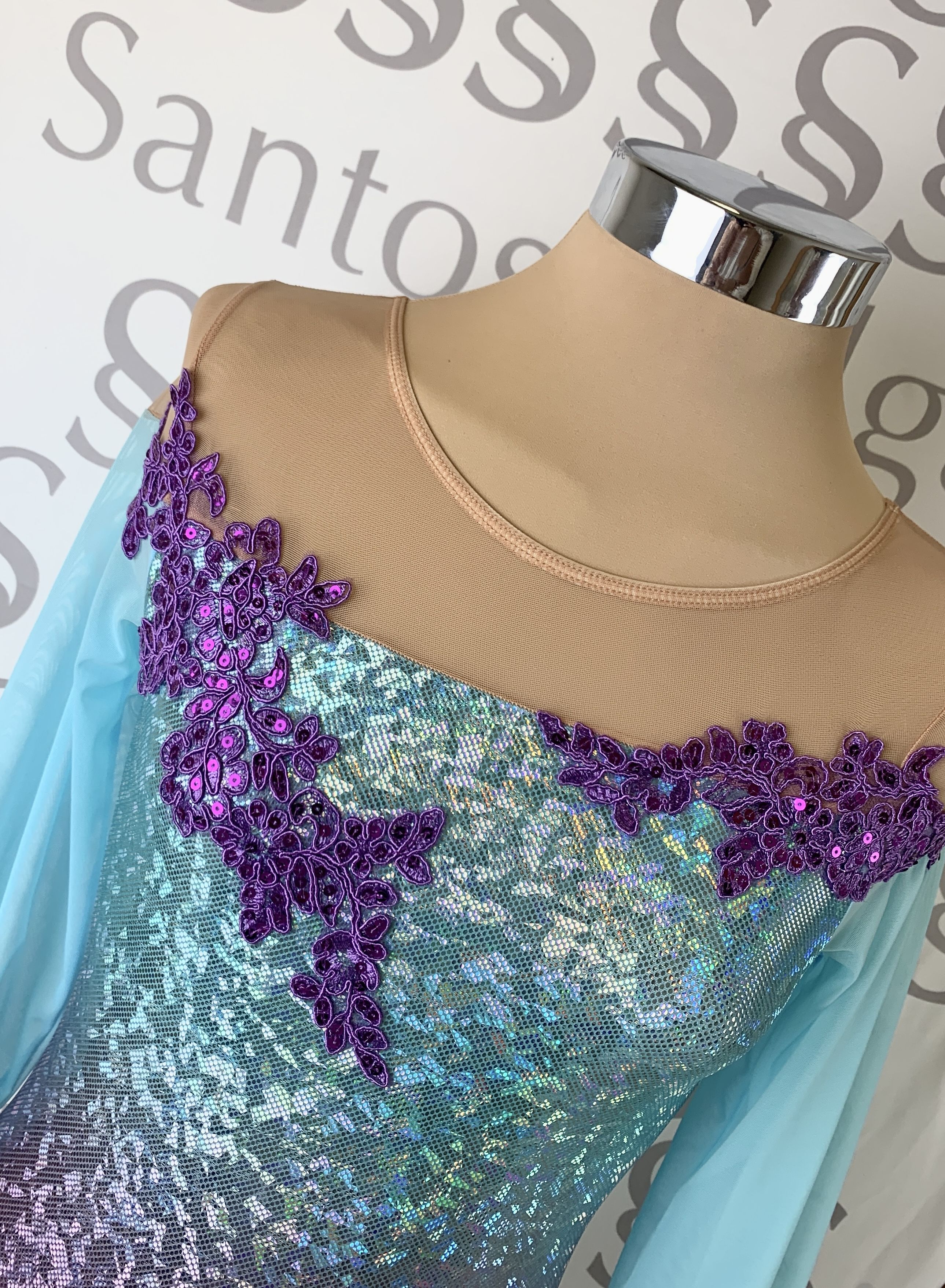 Body en tejido de holograma degradado, de morado a azul clarito, con escote bañera con gasa color carne en hombros. Mangas 3/4 en gasa abullonadas.