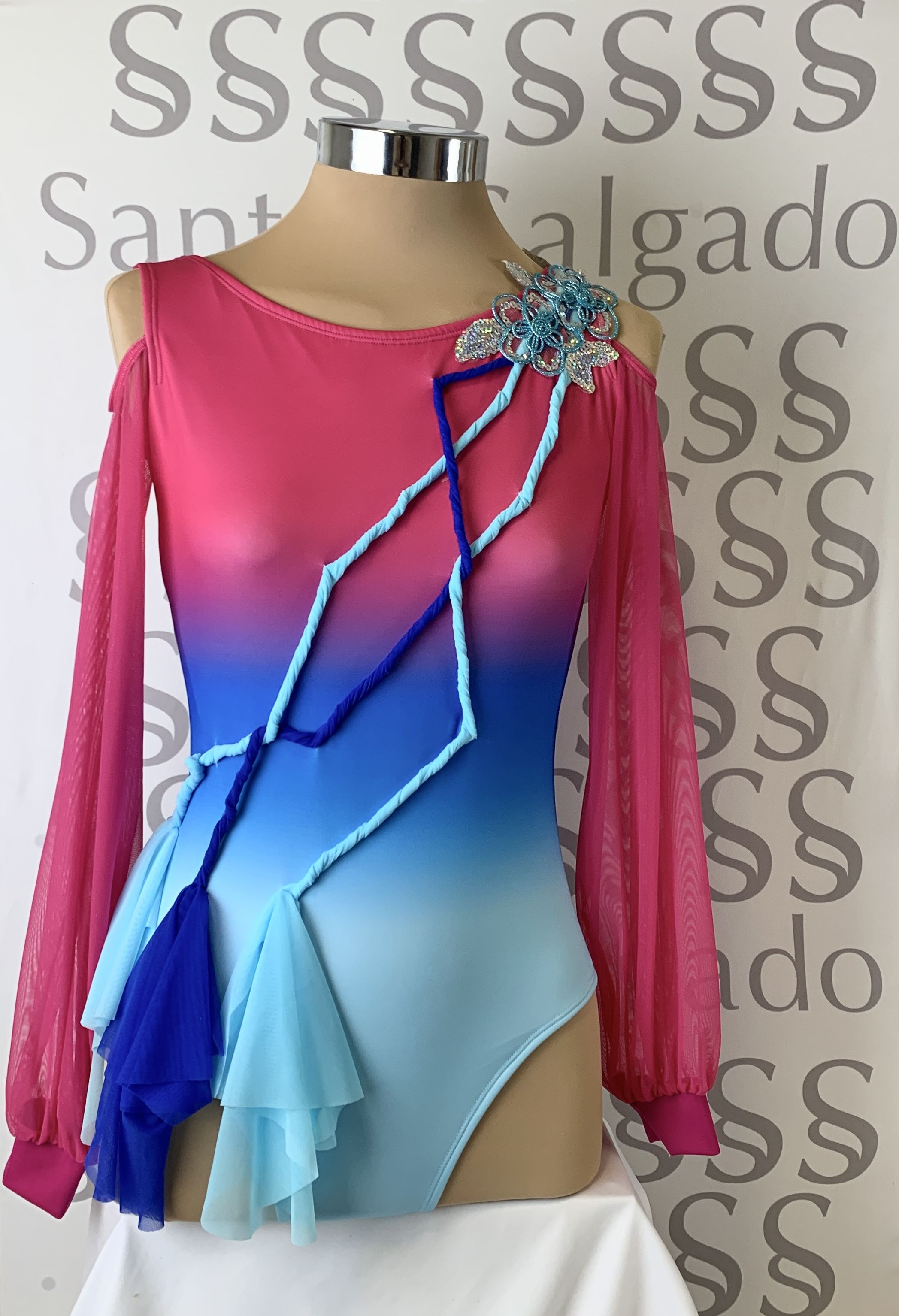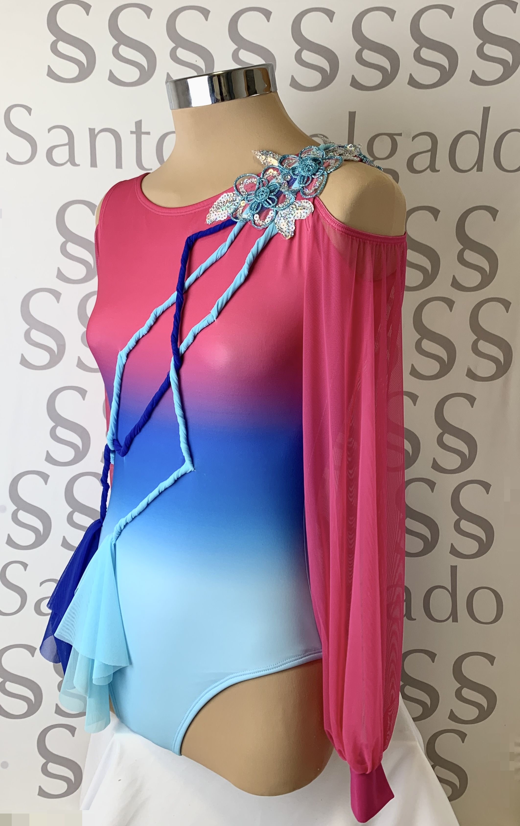 Body degradé  en varios tonos de azul a rosa con mangas largas de gasa abullonadas con puño dejando al descubierto los hombros.