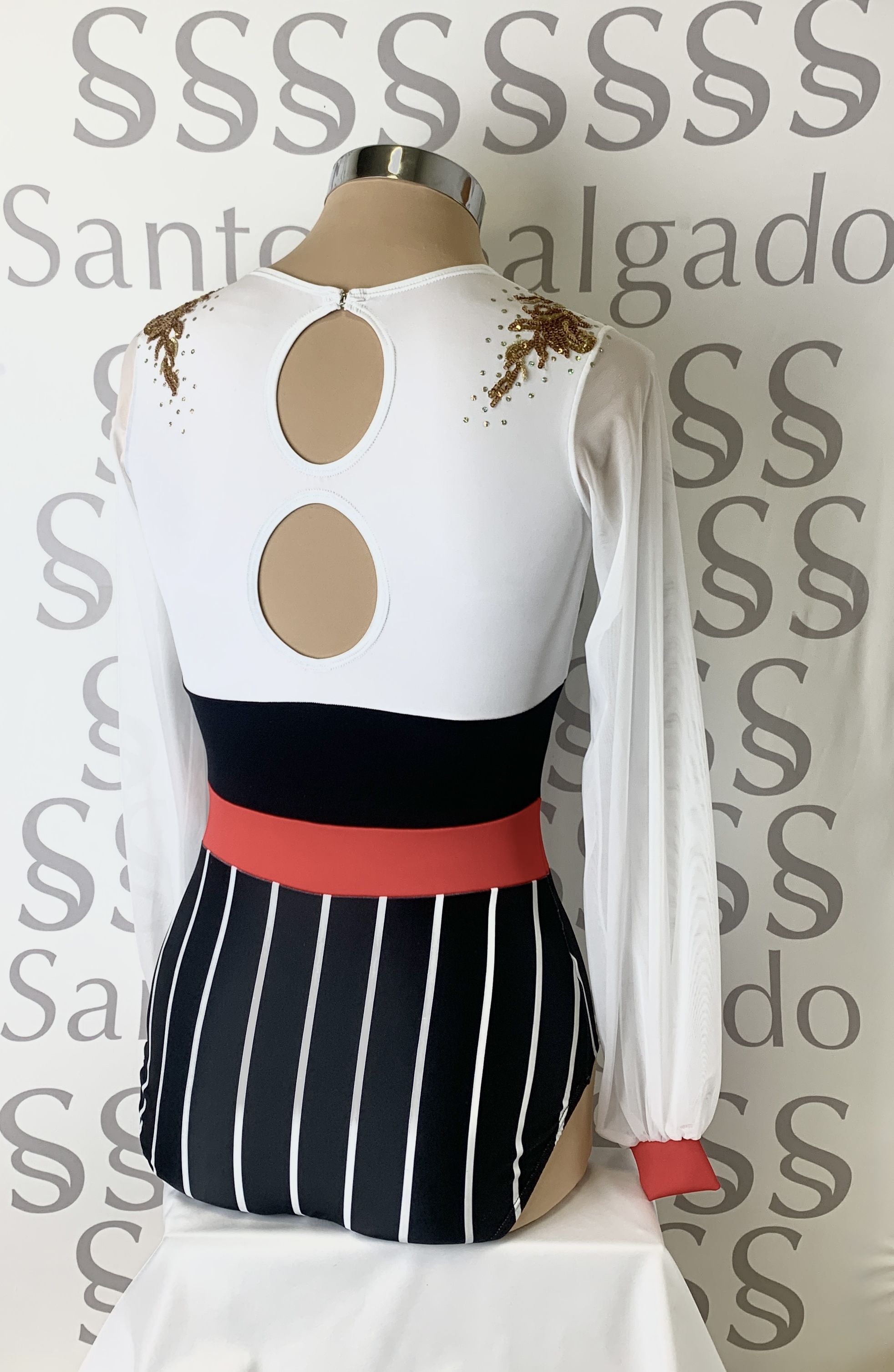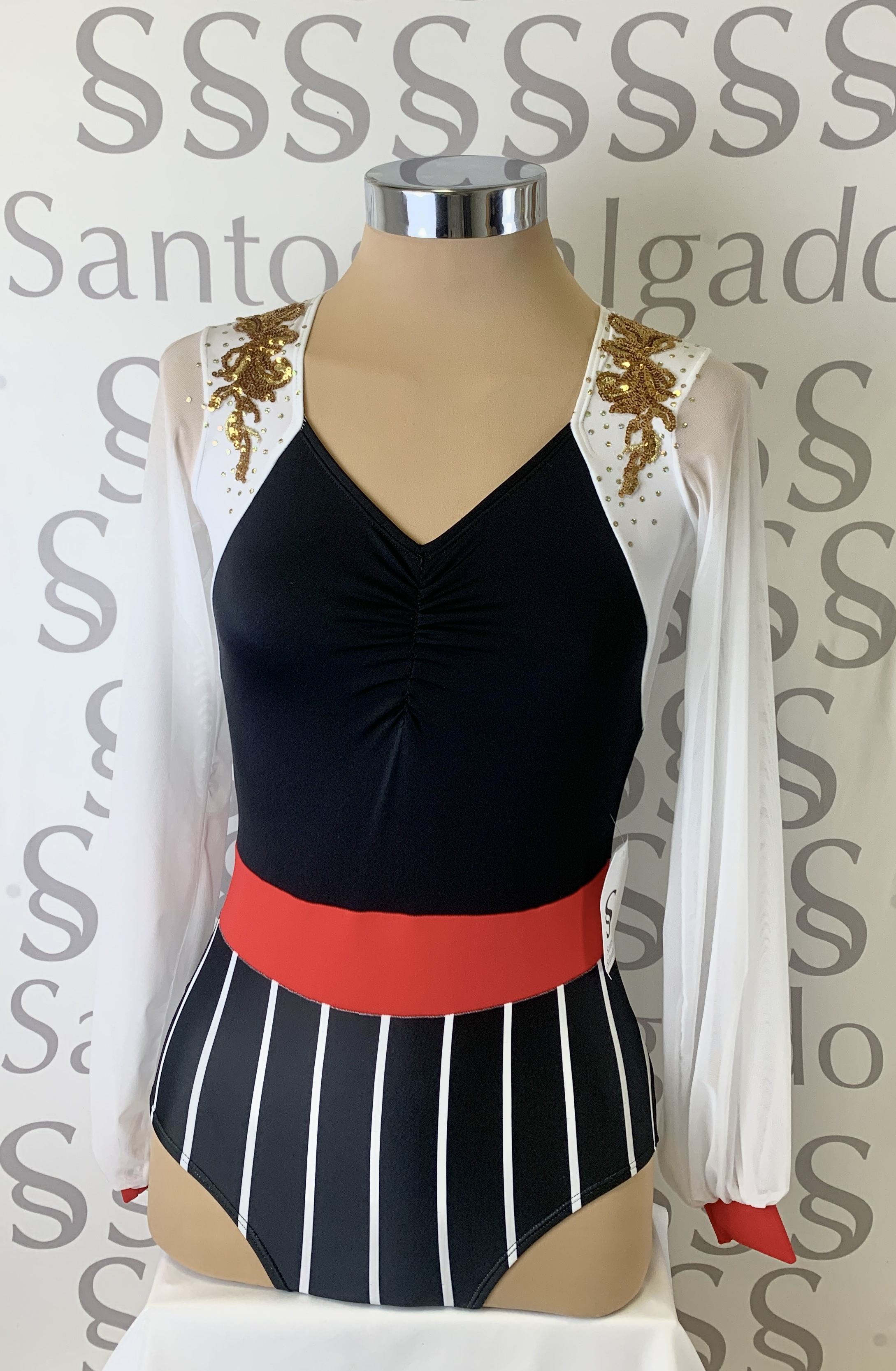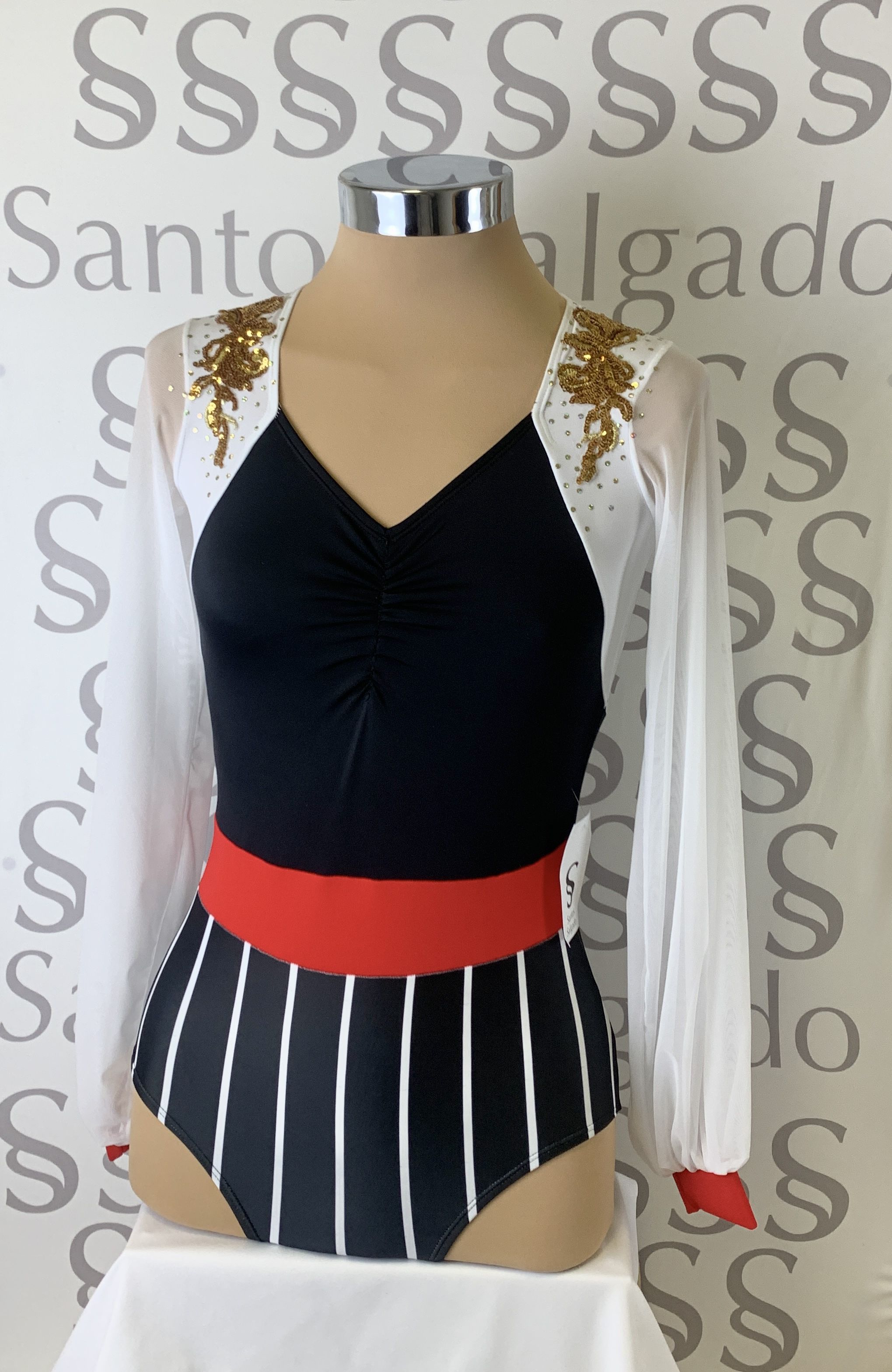 Talla 6 Body de braga alta con rayas verticales y cinturón ancho, escote delantero con frunce y hombros a contraste. Mangas de gasa abullonadas con puño. Espalda con cierre y original detalle de dos círculos. Aplicación en lentejuela dorada y salpicada en los hombros.