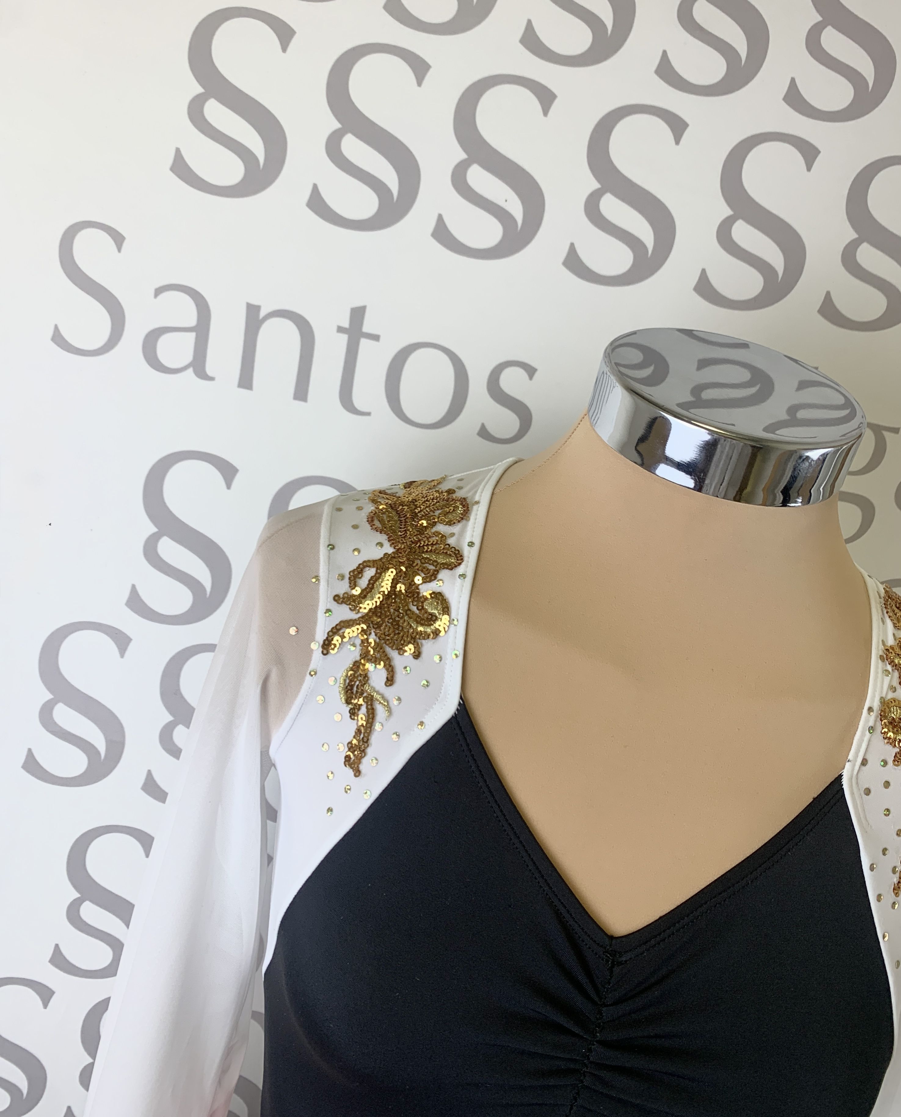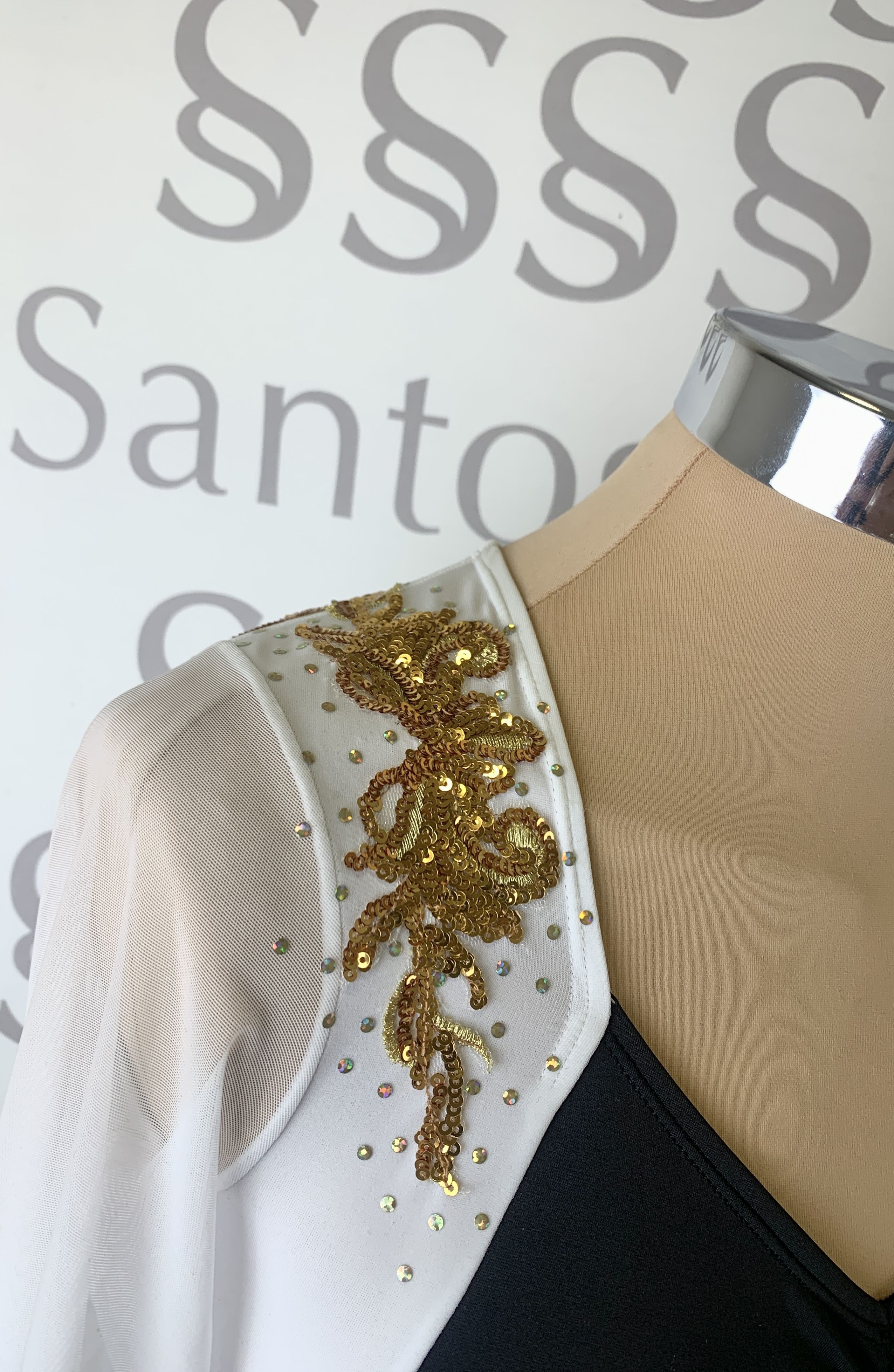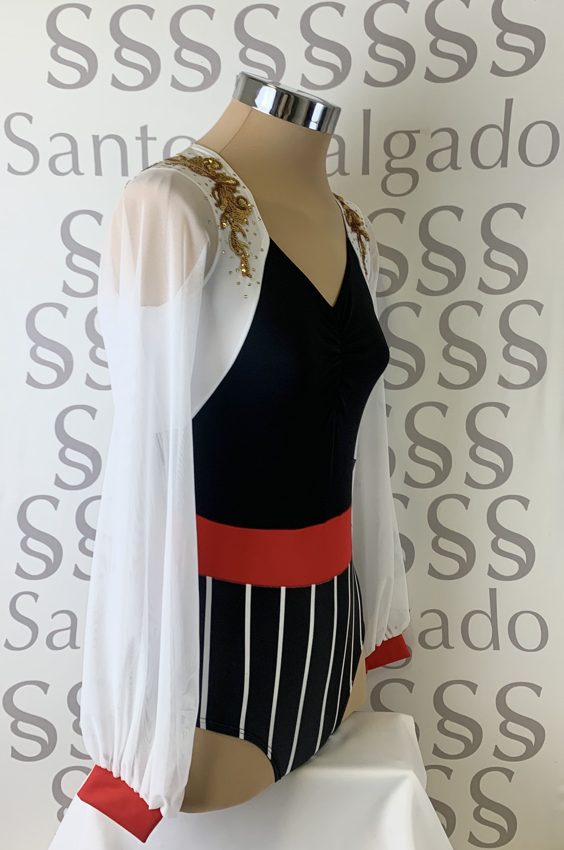 Talla 6 Body de braga alta con rayas verticales y cinturón ancho, escote delantero con frunce y hombros a contraste. Mangas de gasa abullonadas con puño. Espalda con cierre y original detalle de dos círculos. Aplicación en lentejuela dorada y salpicada en los hombros.