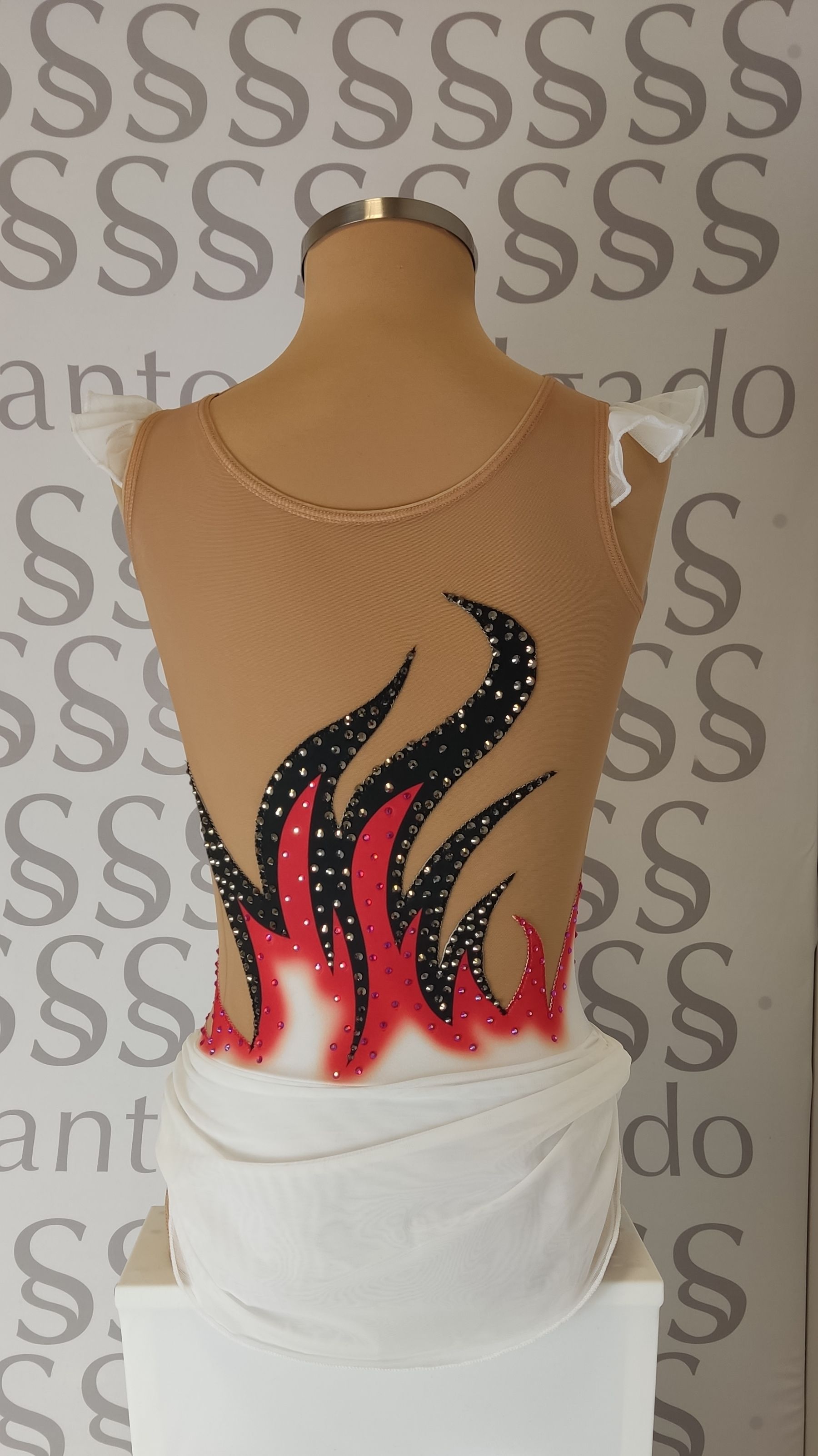 Maillot blanco con efecto llama en negro y rojo, falda degradé en gasa. Cristales ss20 y ss16