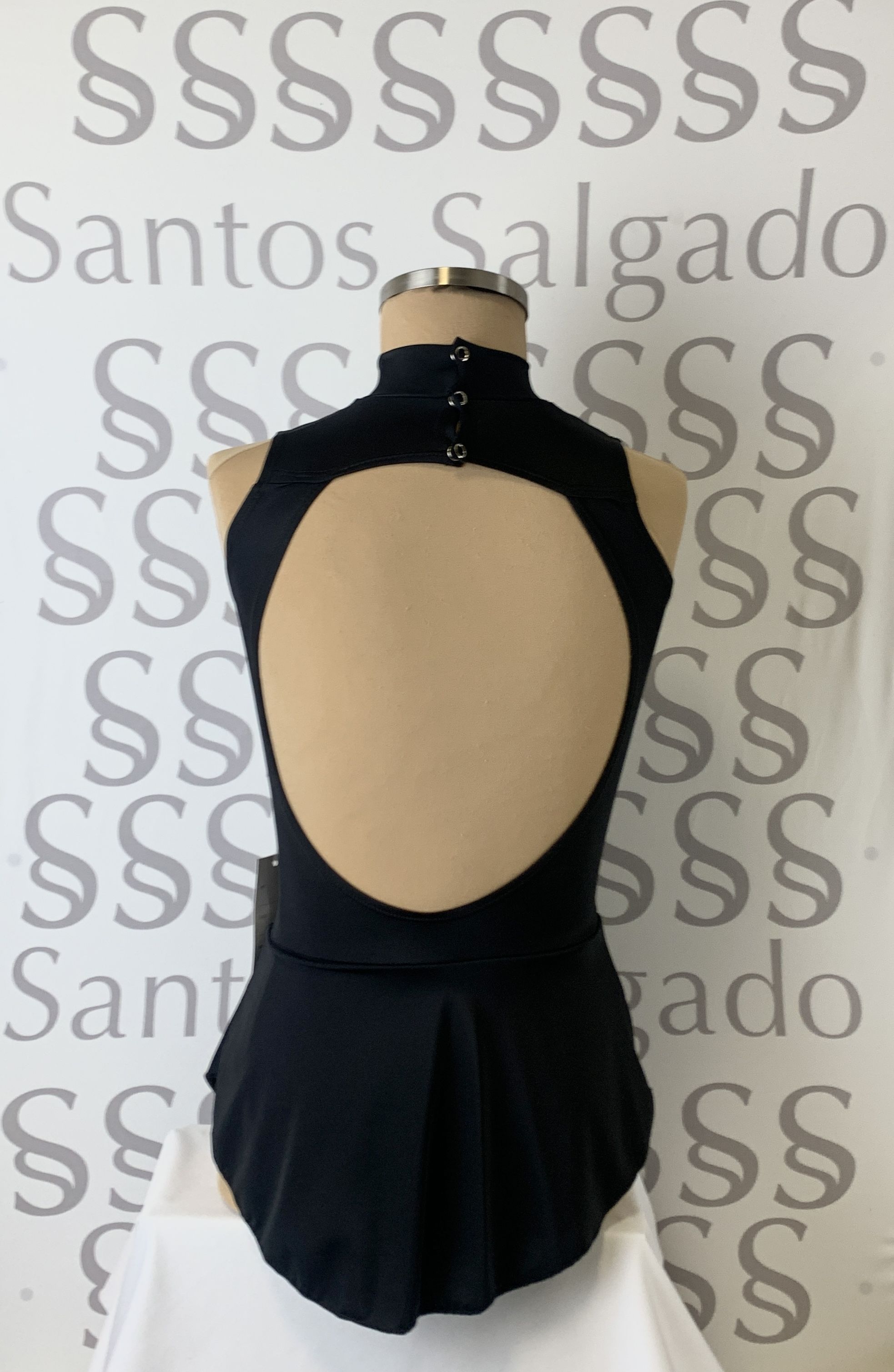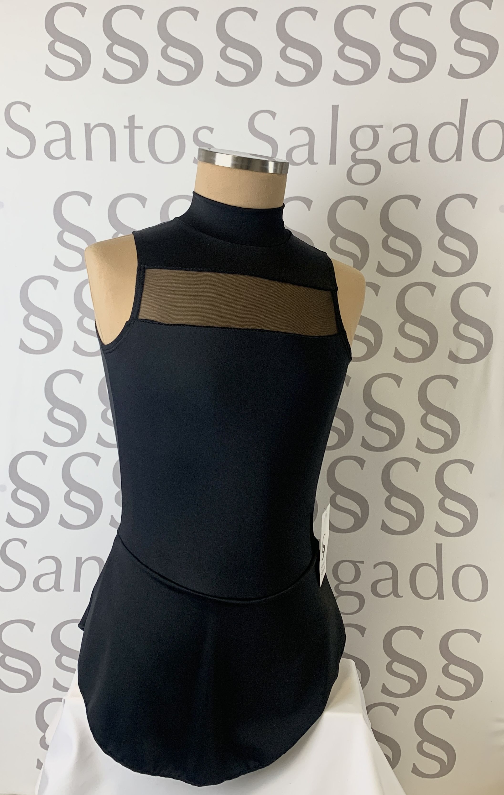 Maillot cuello alto con falda pegada de licra, gran escote en la espalda y franja transparente en escote delantero