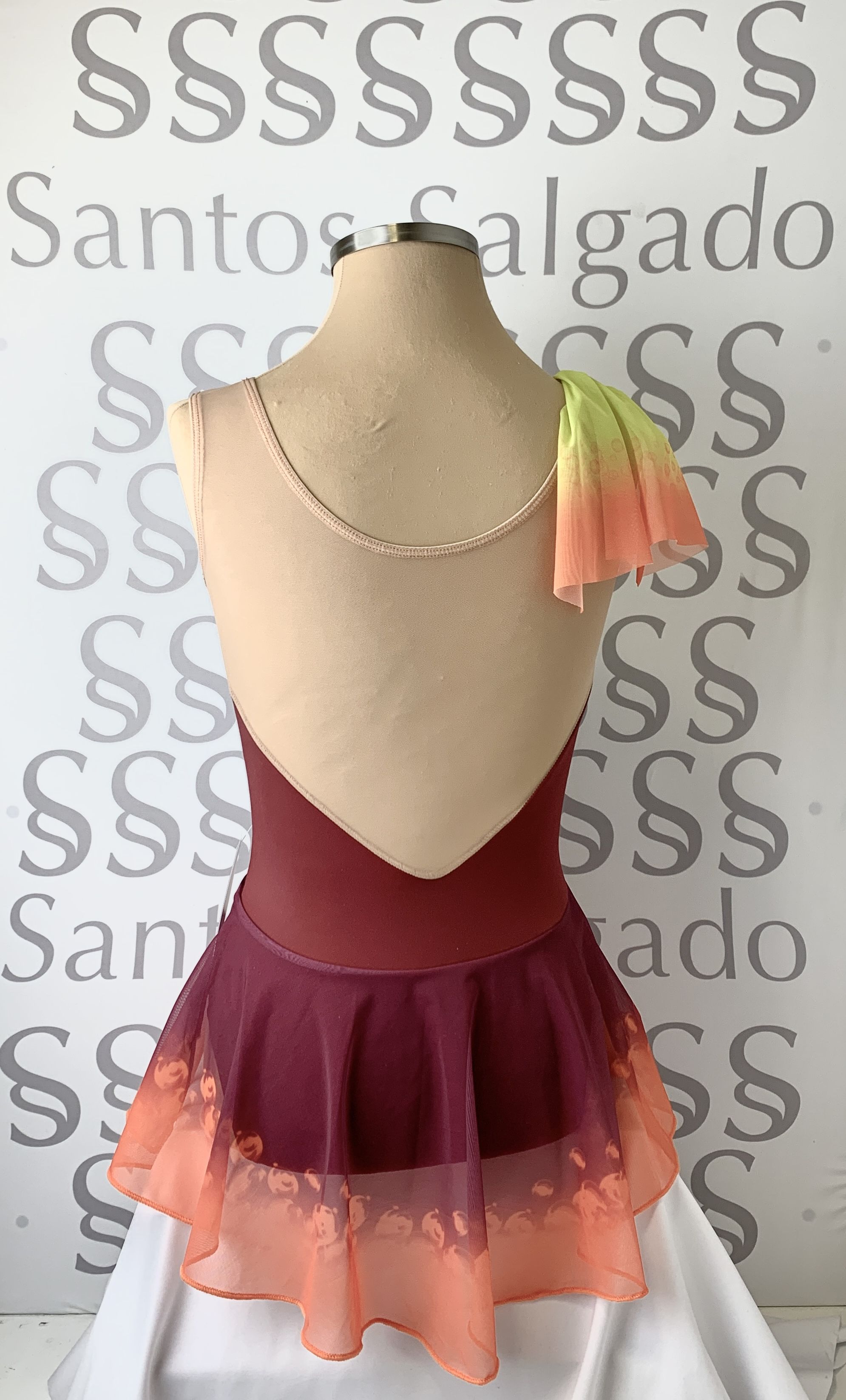 Maillot con falda de gasa sublimado bajo con burbujas a tono con el cuerpo. Franja drapeada de hombro a cadera en distintos tonos en el delantero y espalda libre