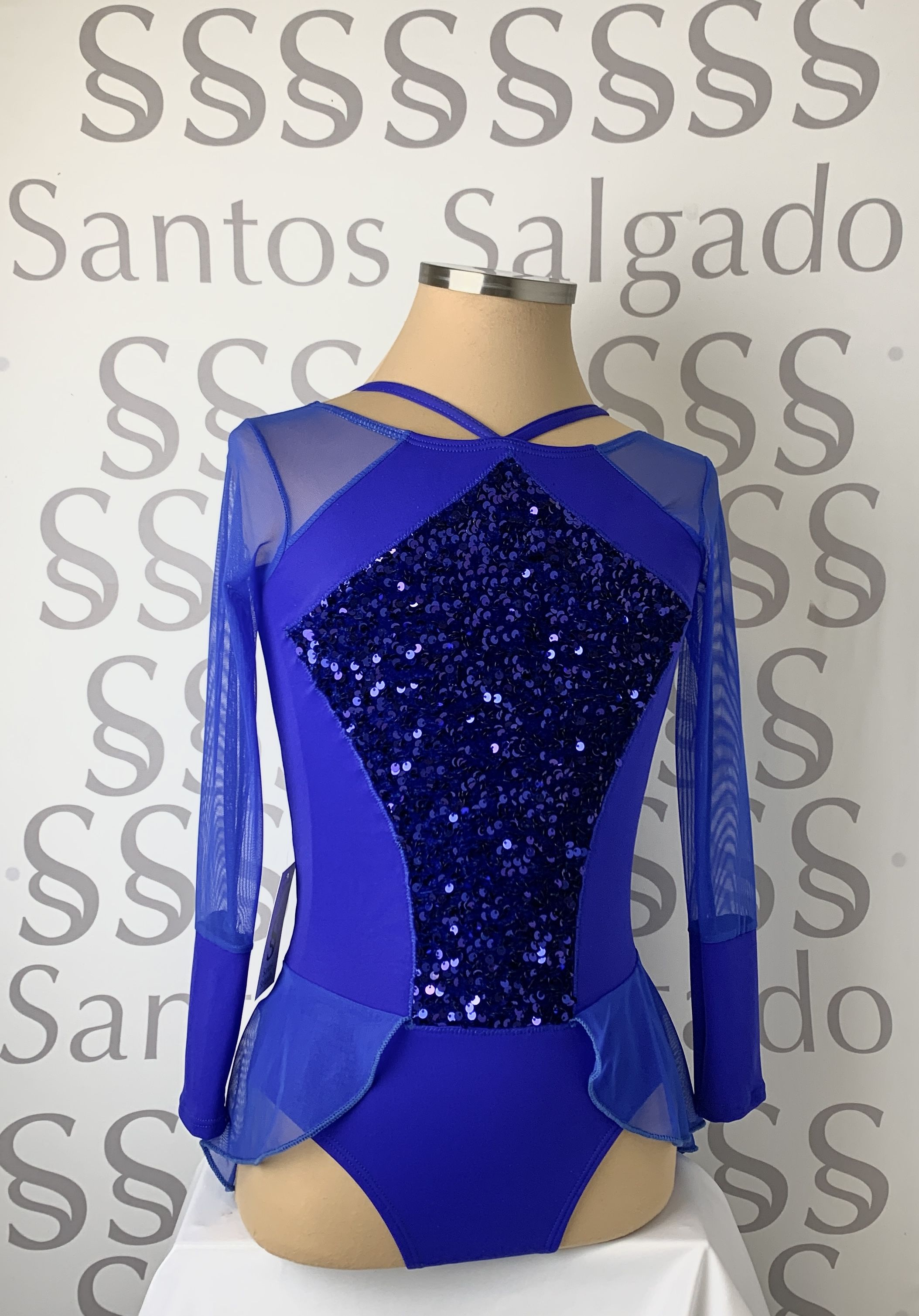 Maillot azulón con falda no completa en gasa y escote barco con tirante fantasía que sale del delantero, mangas de gasa con gran puño.