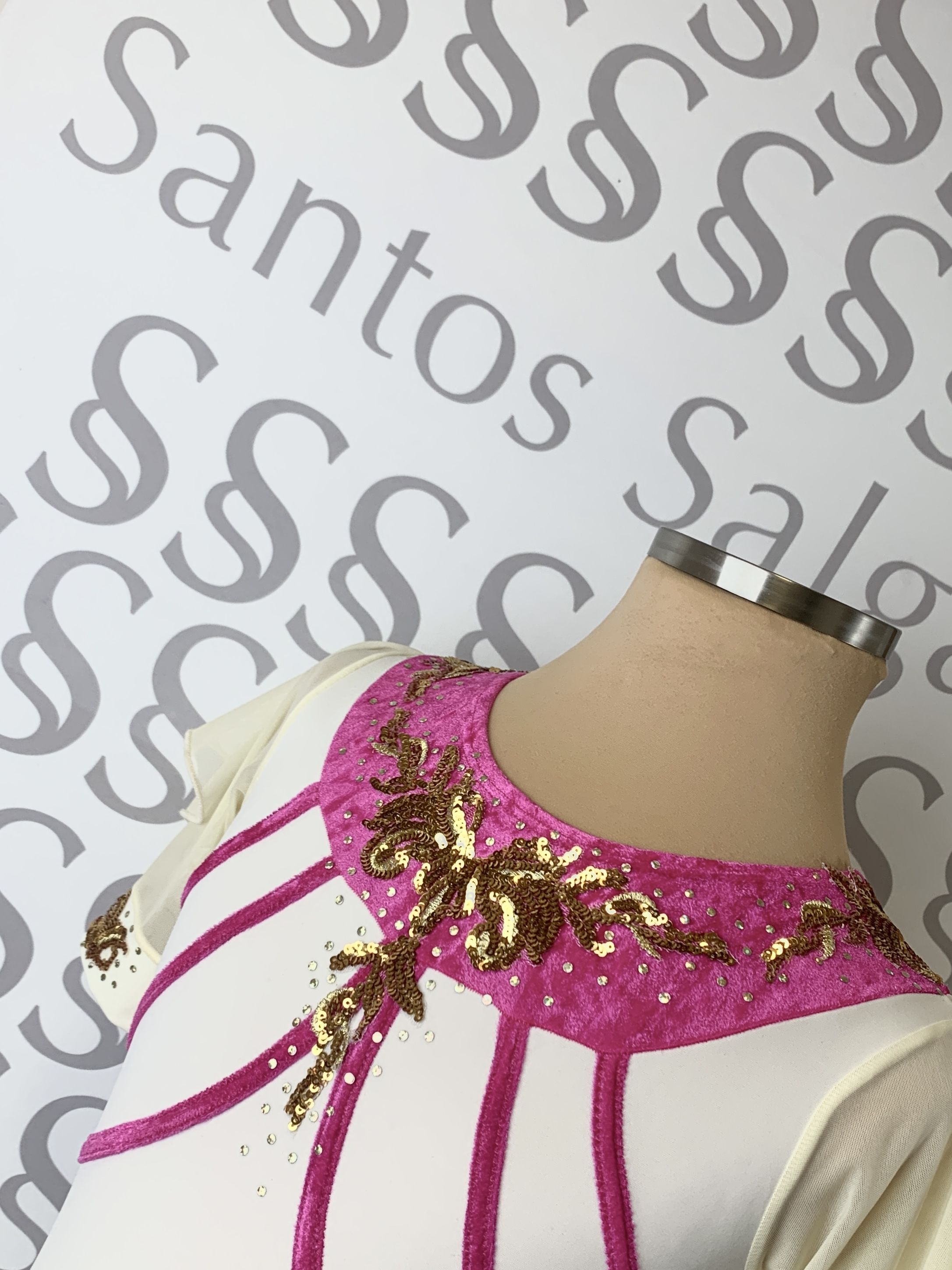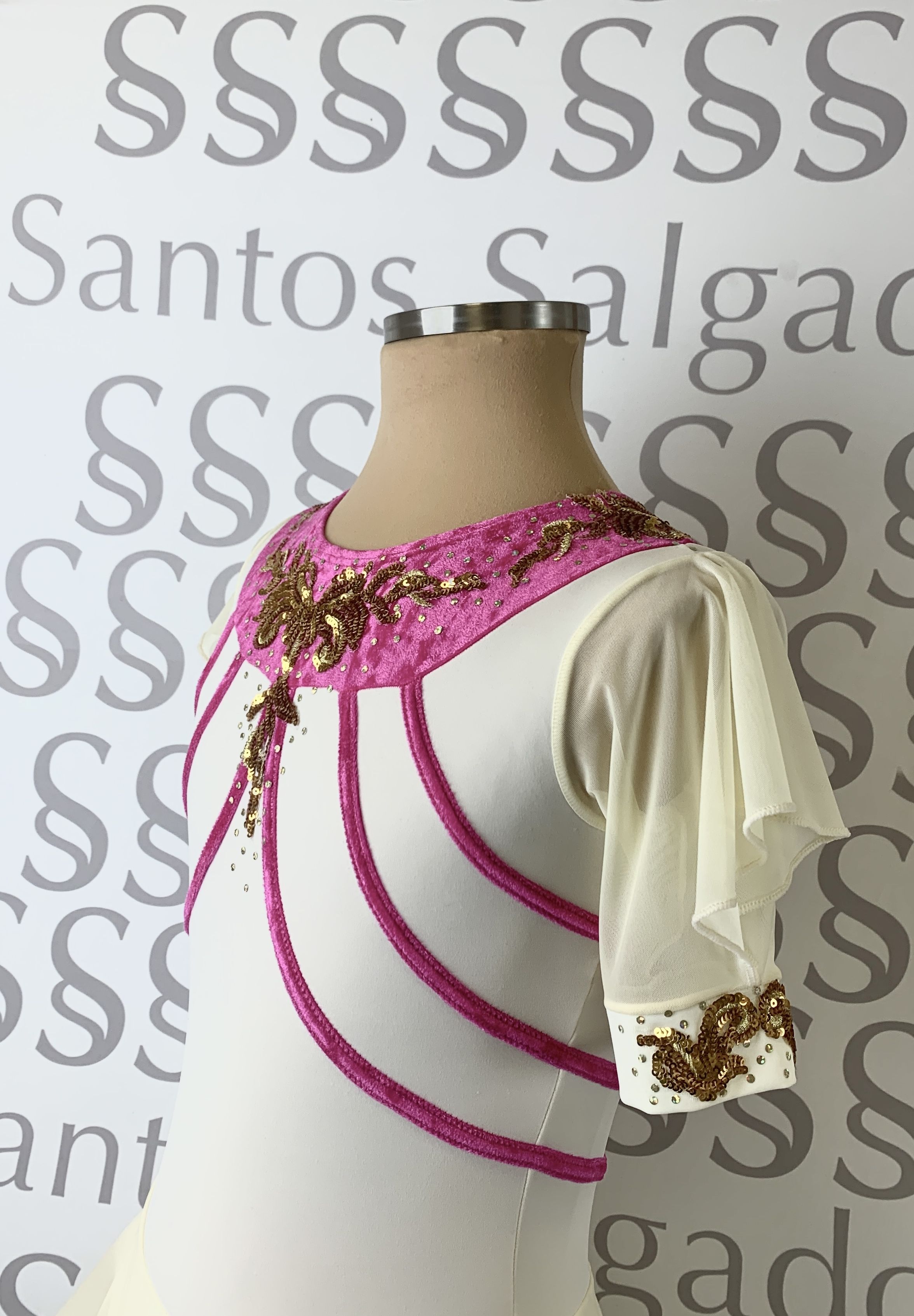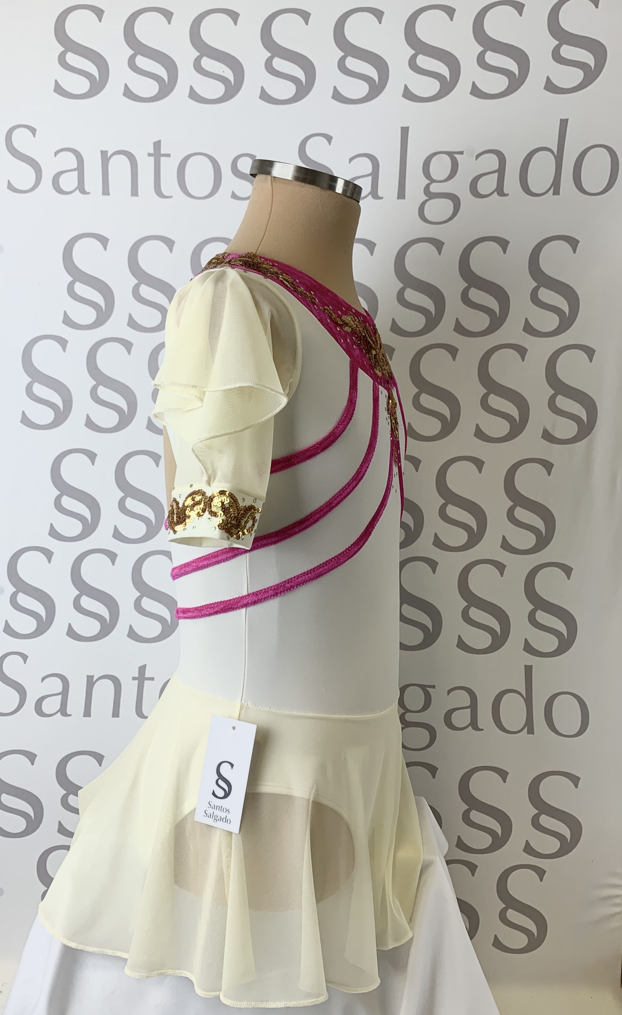 Talla 3 Maillot de falda de gasa y original manga corta con abertura y puño en color vainilla. Escote delantero en terciopelo en color fucsia con tiras a ambos lados que atraviesan la espalda, con gran escote. Detalle de aplicaciones en lentejuela doradas con lentejuela salpicada alrededor