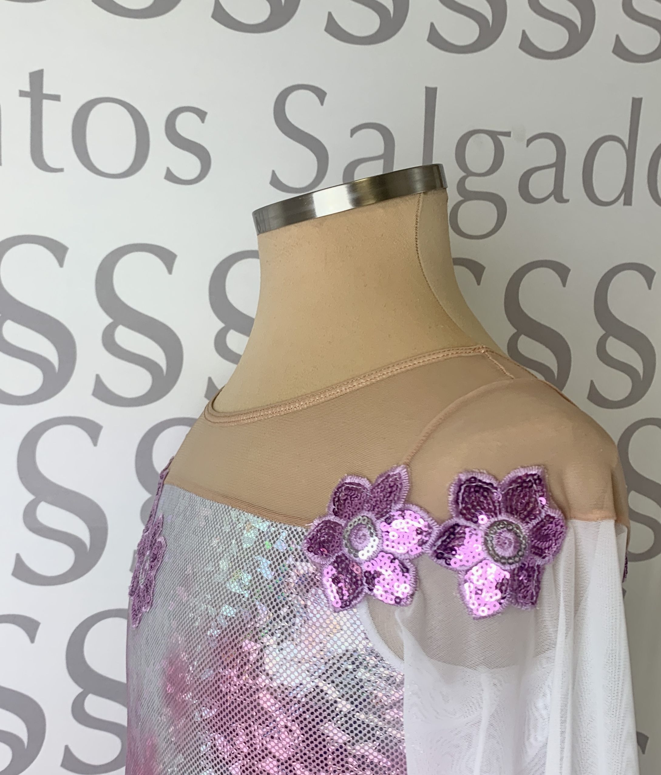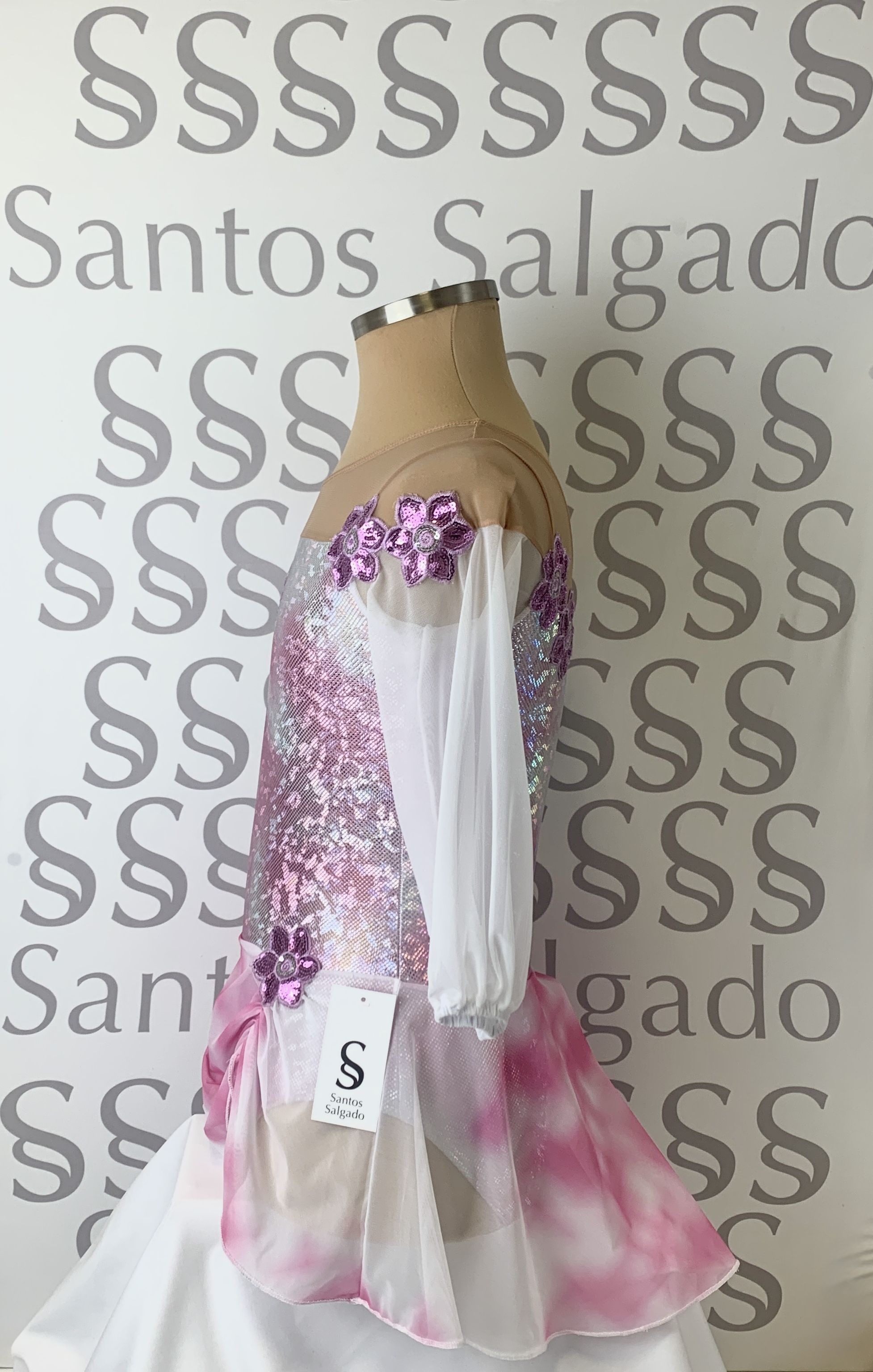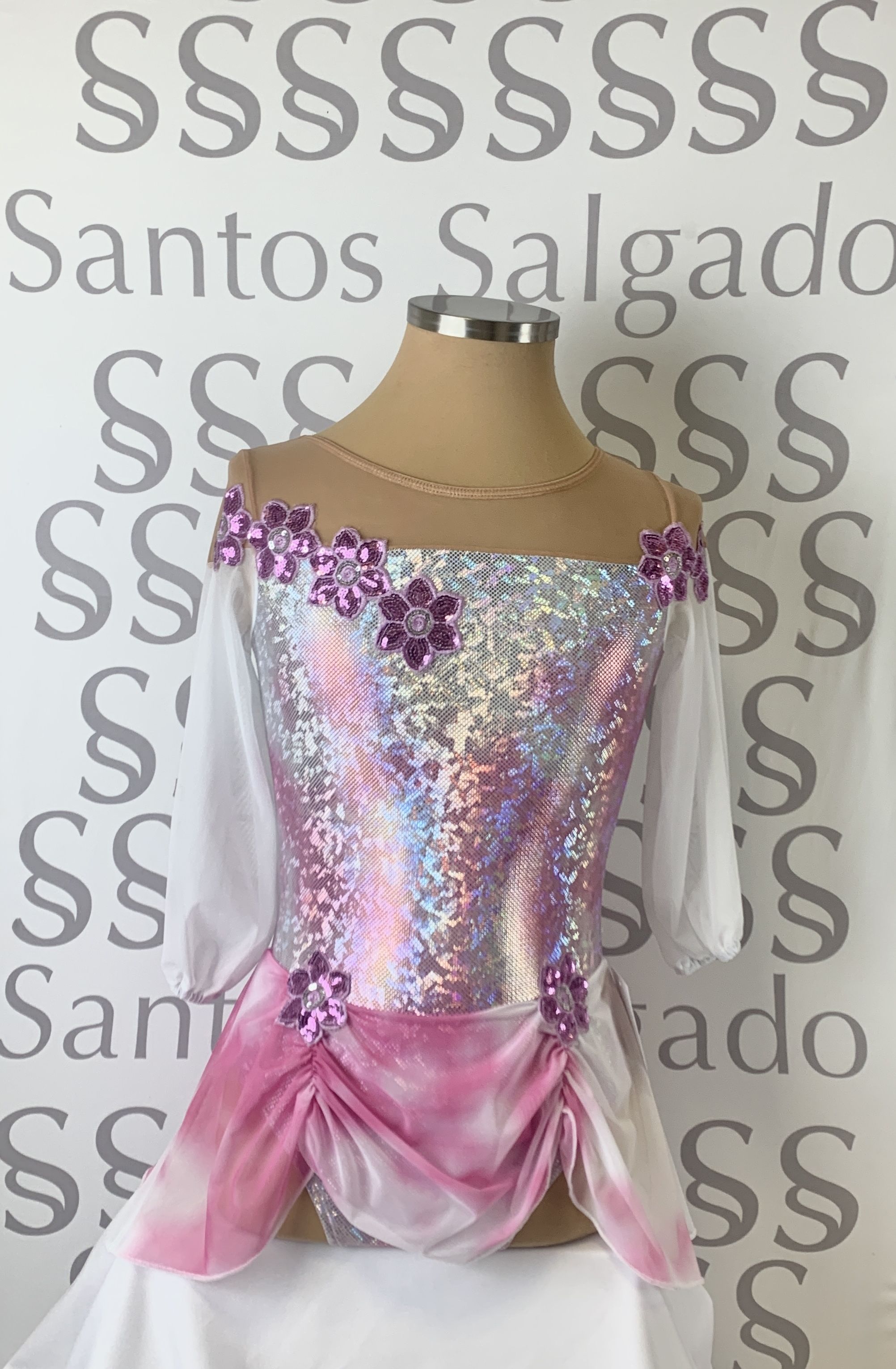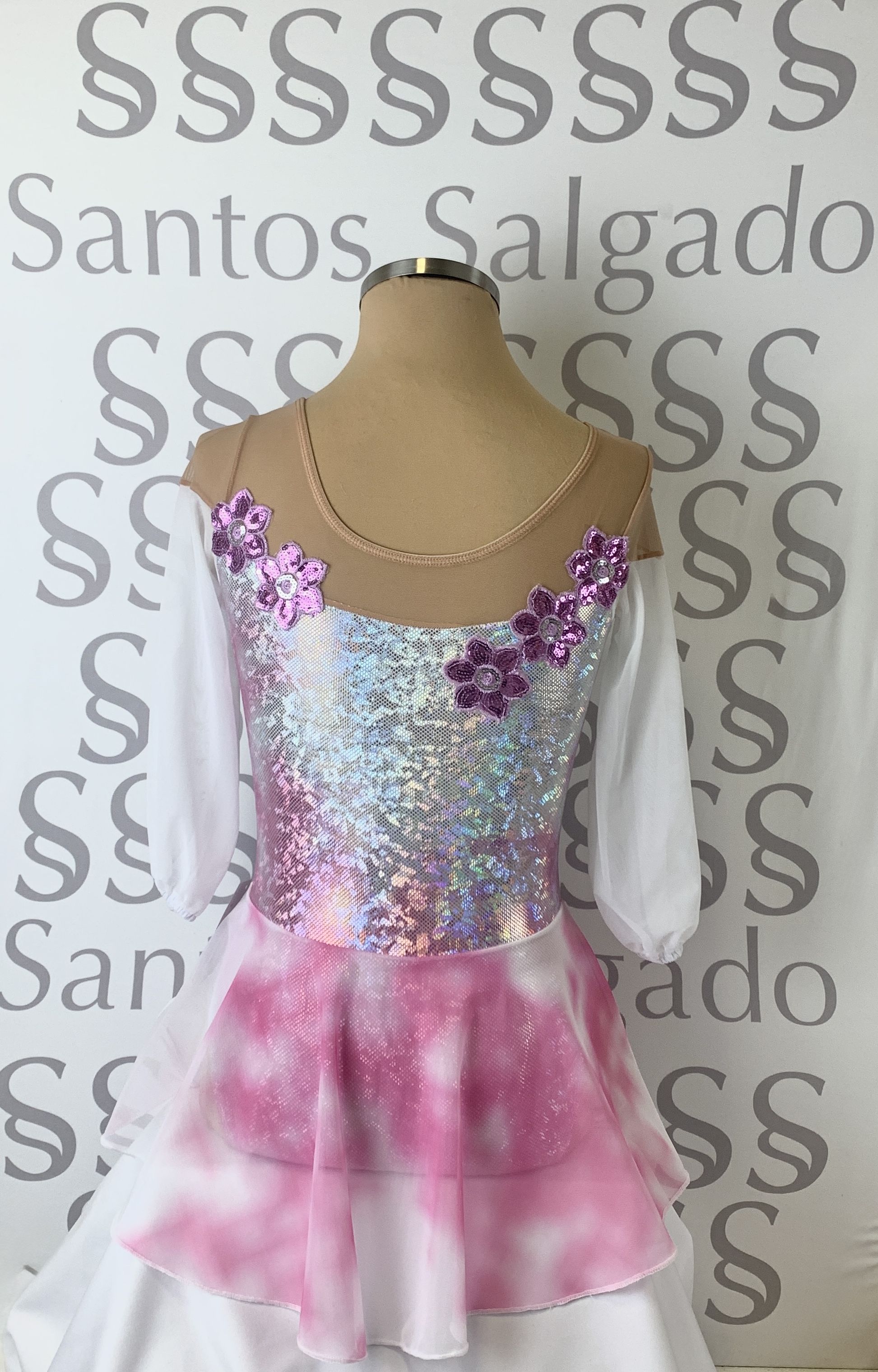 Maillot de tejido de holograma con sublimado en manchas rosas y  falda de gasa también sublimada y mangas 3/4 abullonadas con escote bañera, con gasa carne en parte de arriba.
