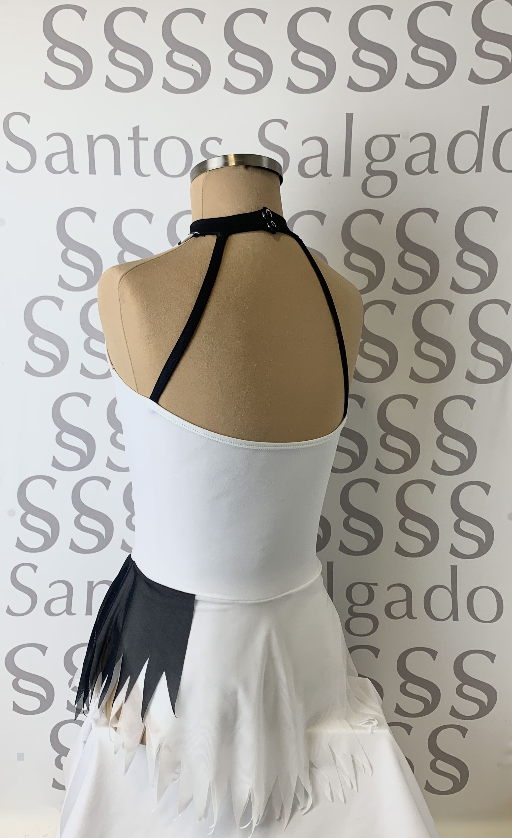 Maillot escote halter en blanco con falda de gasa en picos y detalle sublimado en escote en color negro
