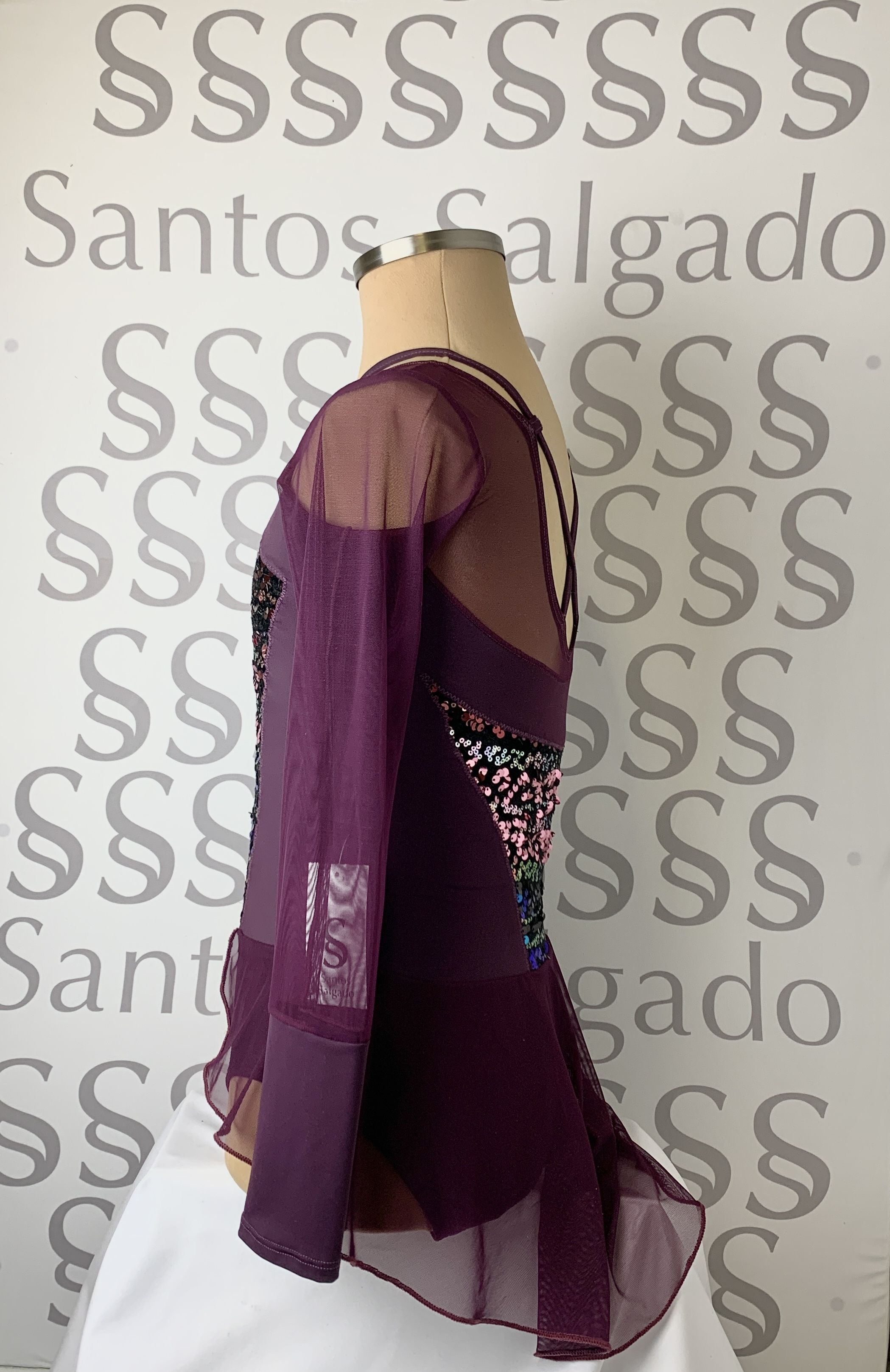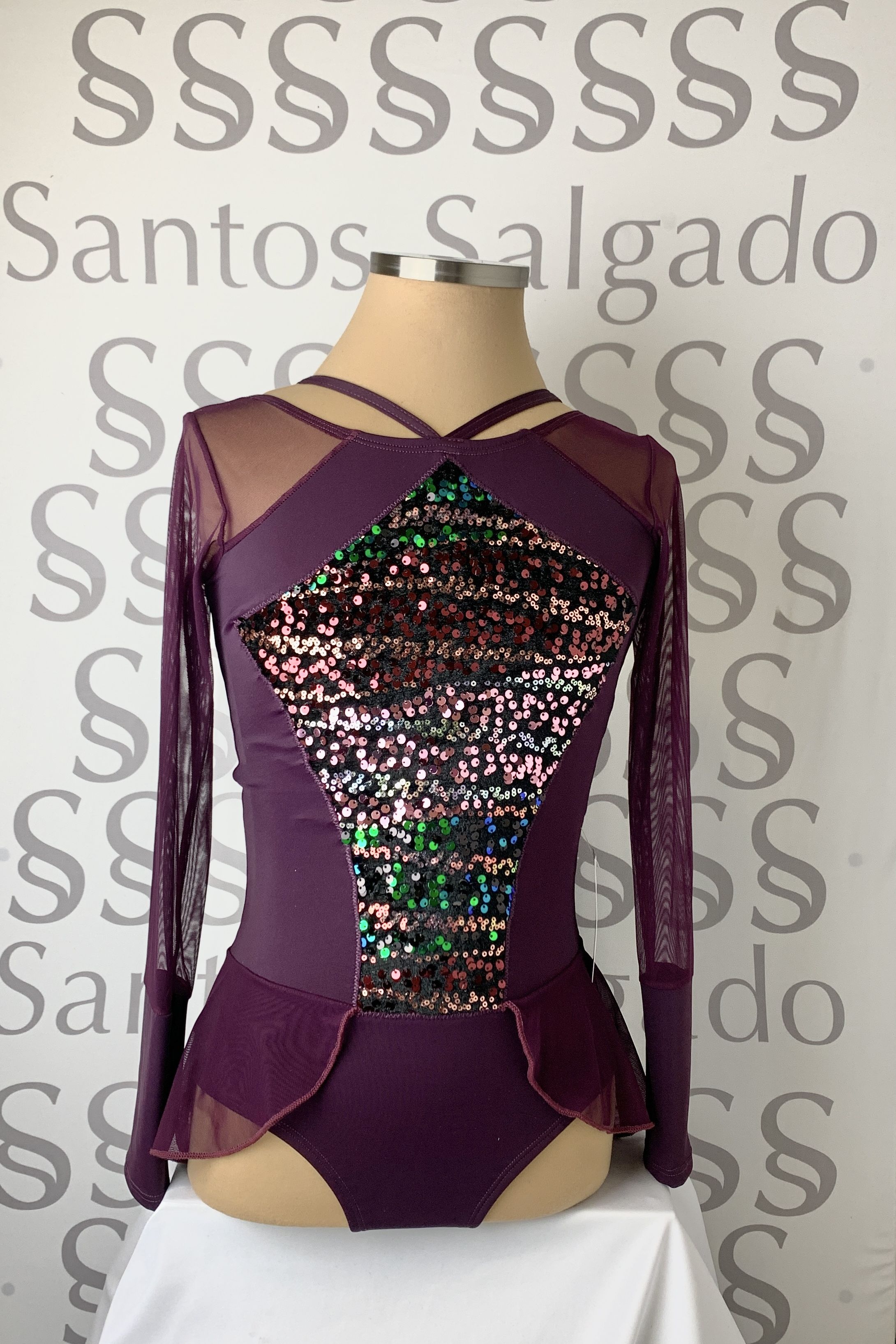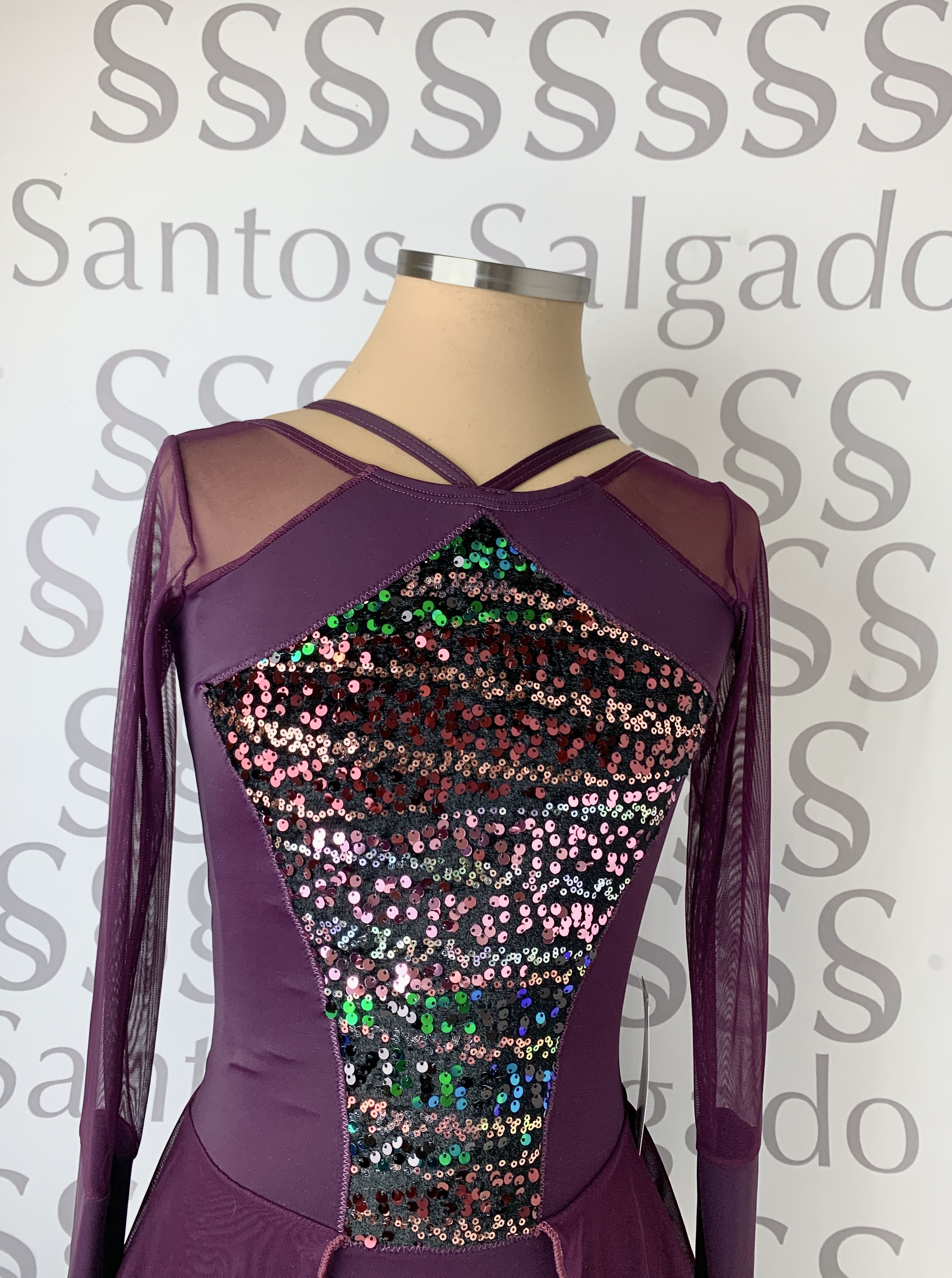 Talla 4 y Talla 5 Maillot berenjena con falda no completa en gasa y escote barco con tirante fantasía que sale del delantero, mangas de gasa con gran puño. Detalle de aplicación en delantero y parte de la espalda con terciopelo de lentejuela en varios tonos