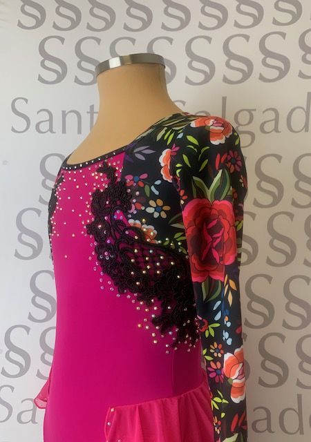 Maillot con aires flamencos en tono rosa subido y estampado simulando dibujos de mantón de manila. Manga terminada en volante de gasa y falda no completa con volantes de gasa. Adornado con apliques negros en el pecho y todo ello con cristales SS16 a tono