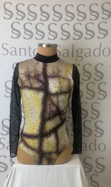 Body manga larga de gasa brillo y cuello alto y amplia lágrima en espalda. Adornado con cristales SS16 a tono con el estampado.