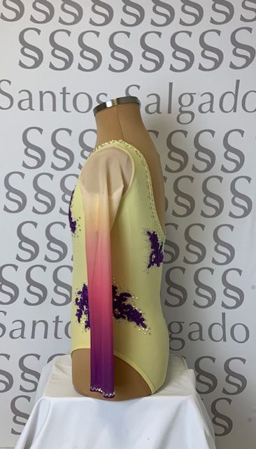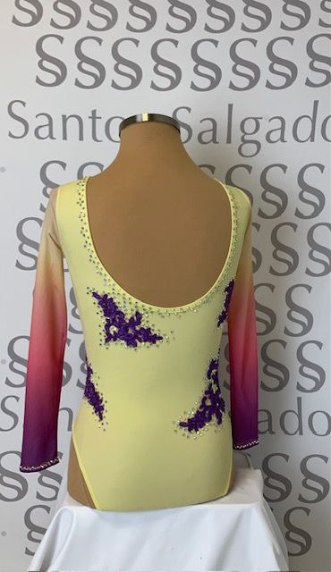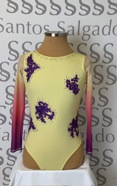 Body en amarillo pastel con mangas degradadas en varios tonos. Cuerpo salpicado con piezas de encaje en tono malva clarito. Todo ello adornado con cristales AB SS16