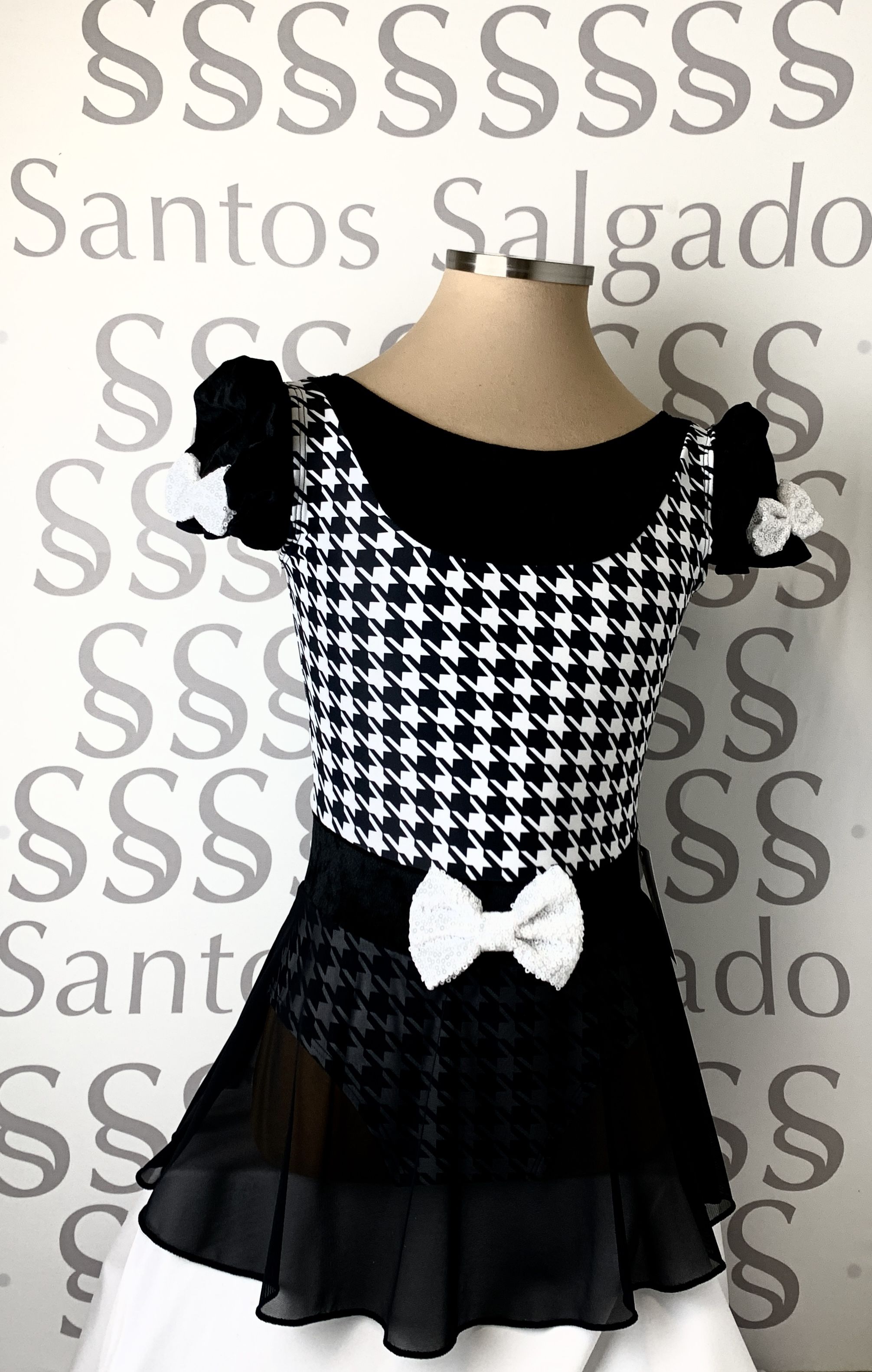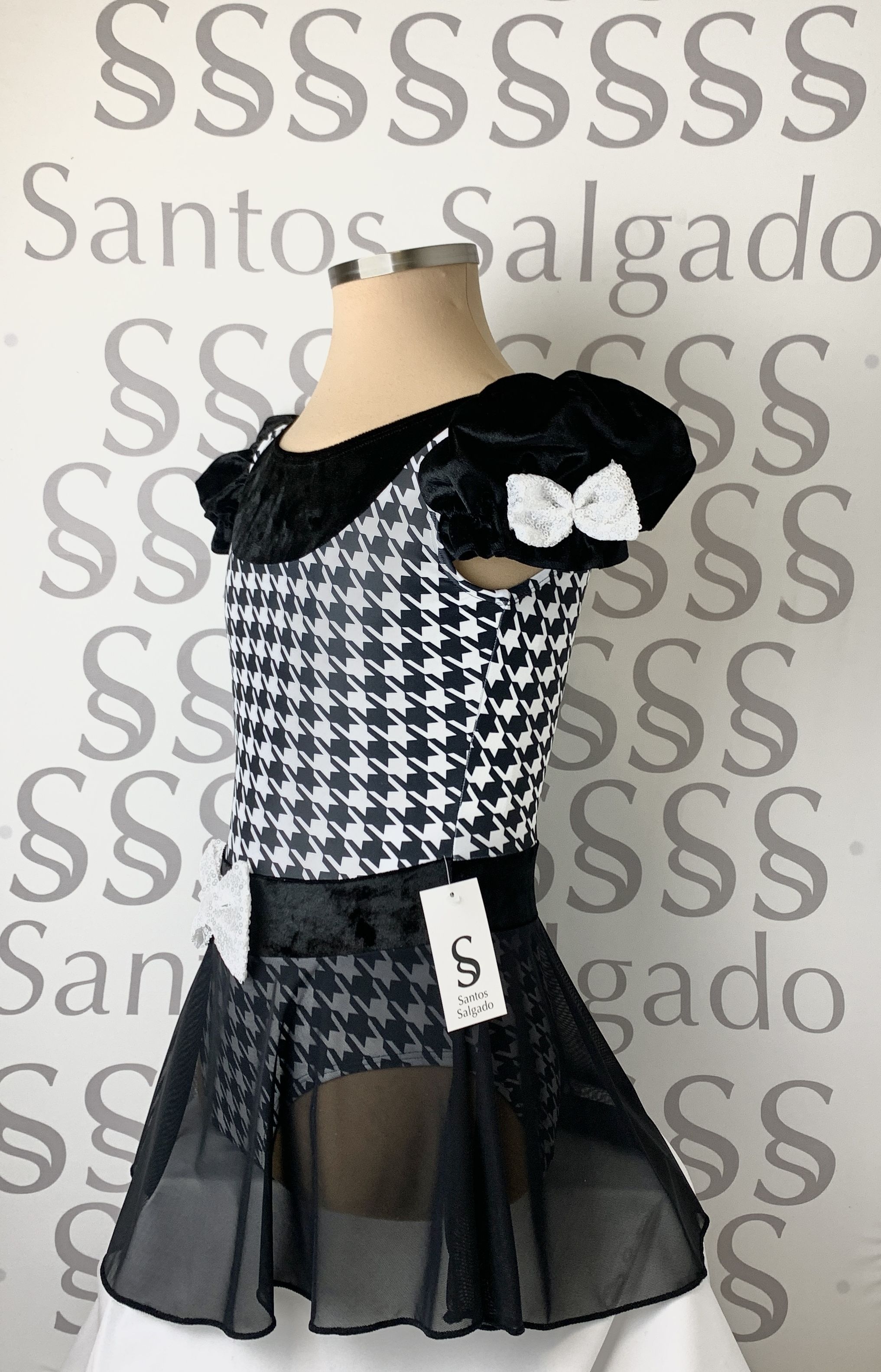 Talla 4 Maillot en pata de gallo con falda de gasa negra con terciopelo negro en cinturón, escote y manguitas tipo farol. Detalle de lazos blancos en lentejuela en mangas y cintura