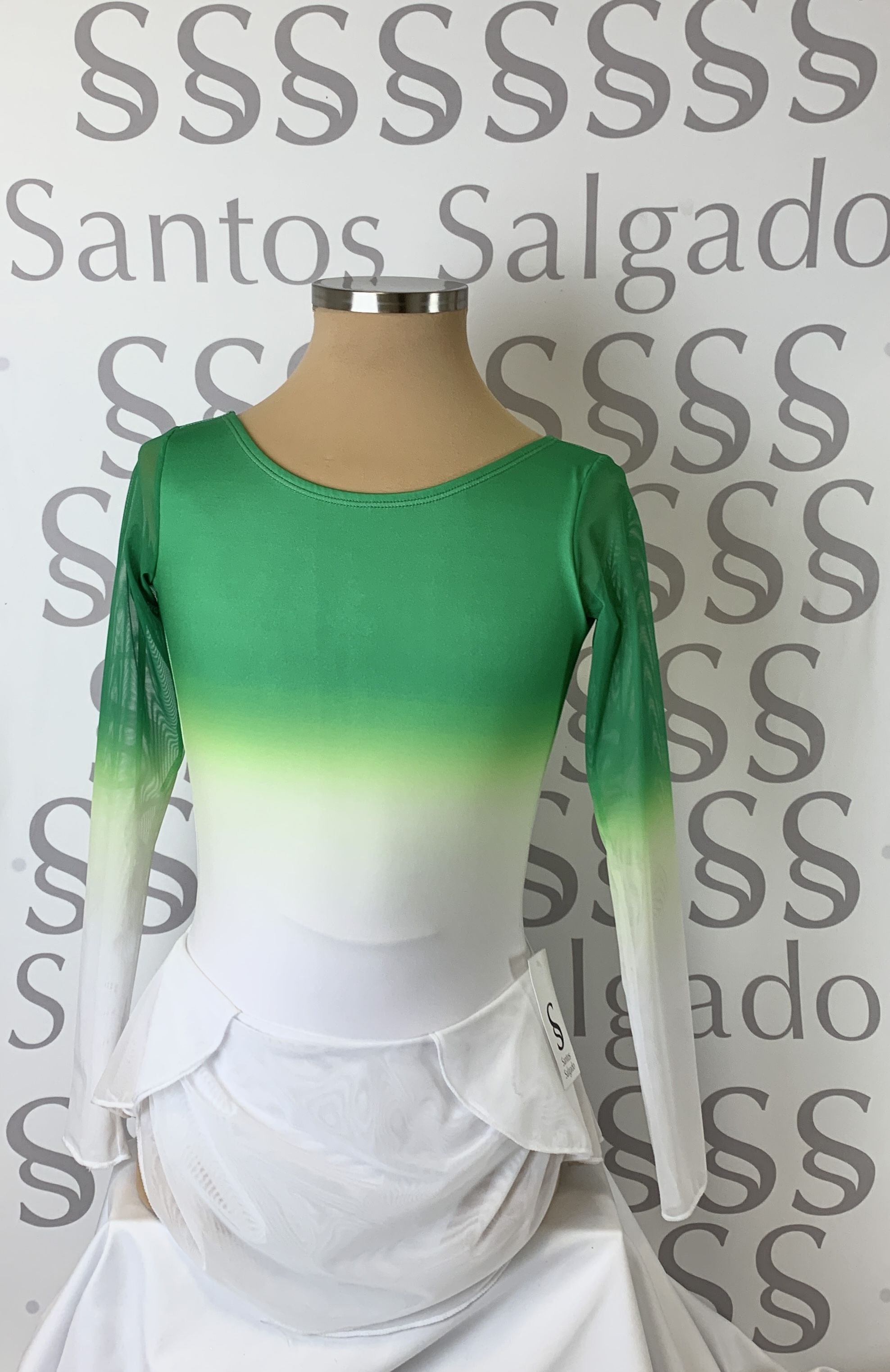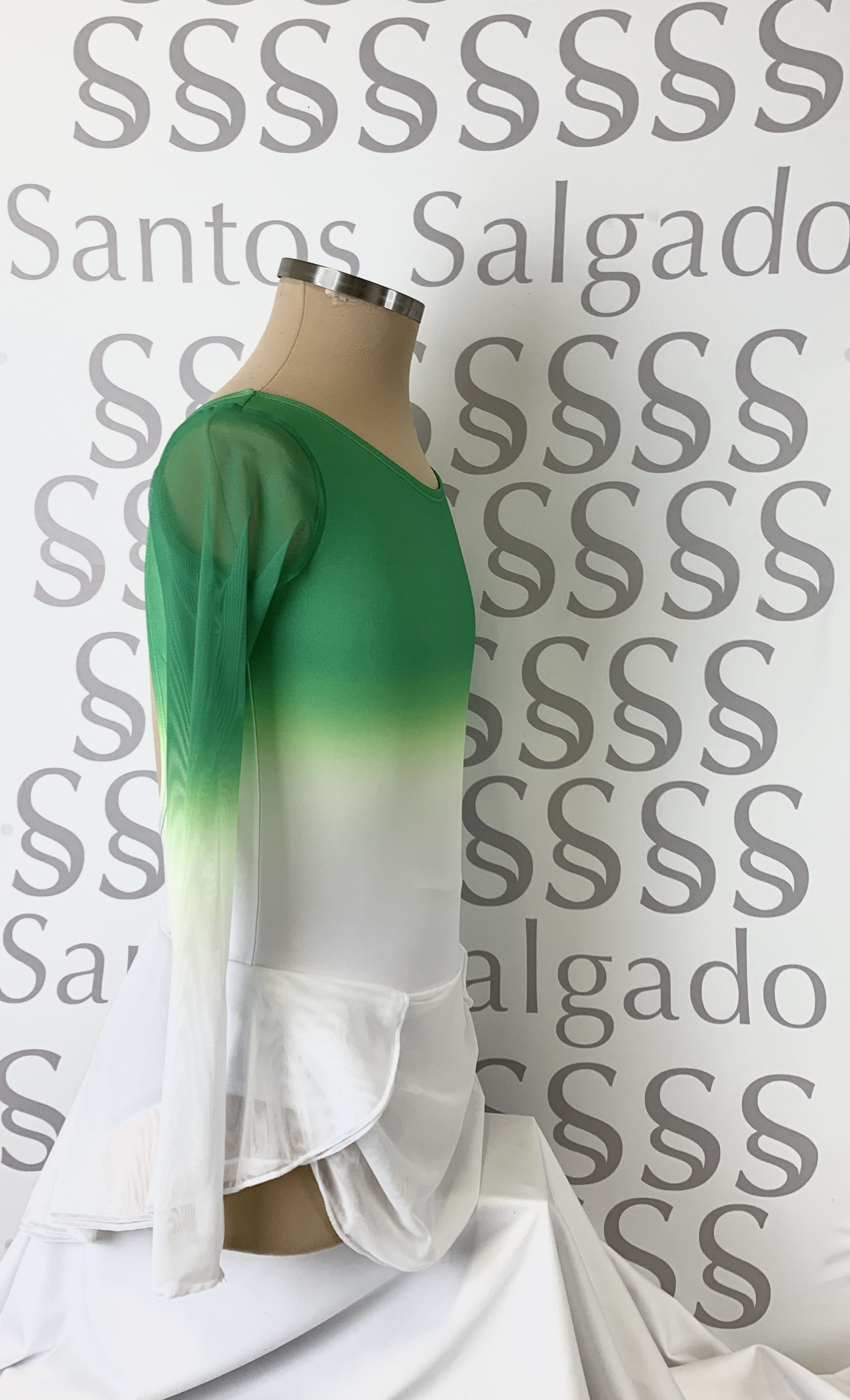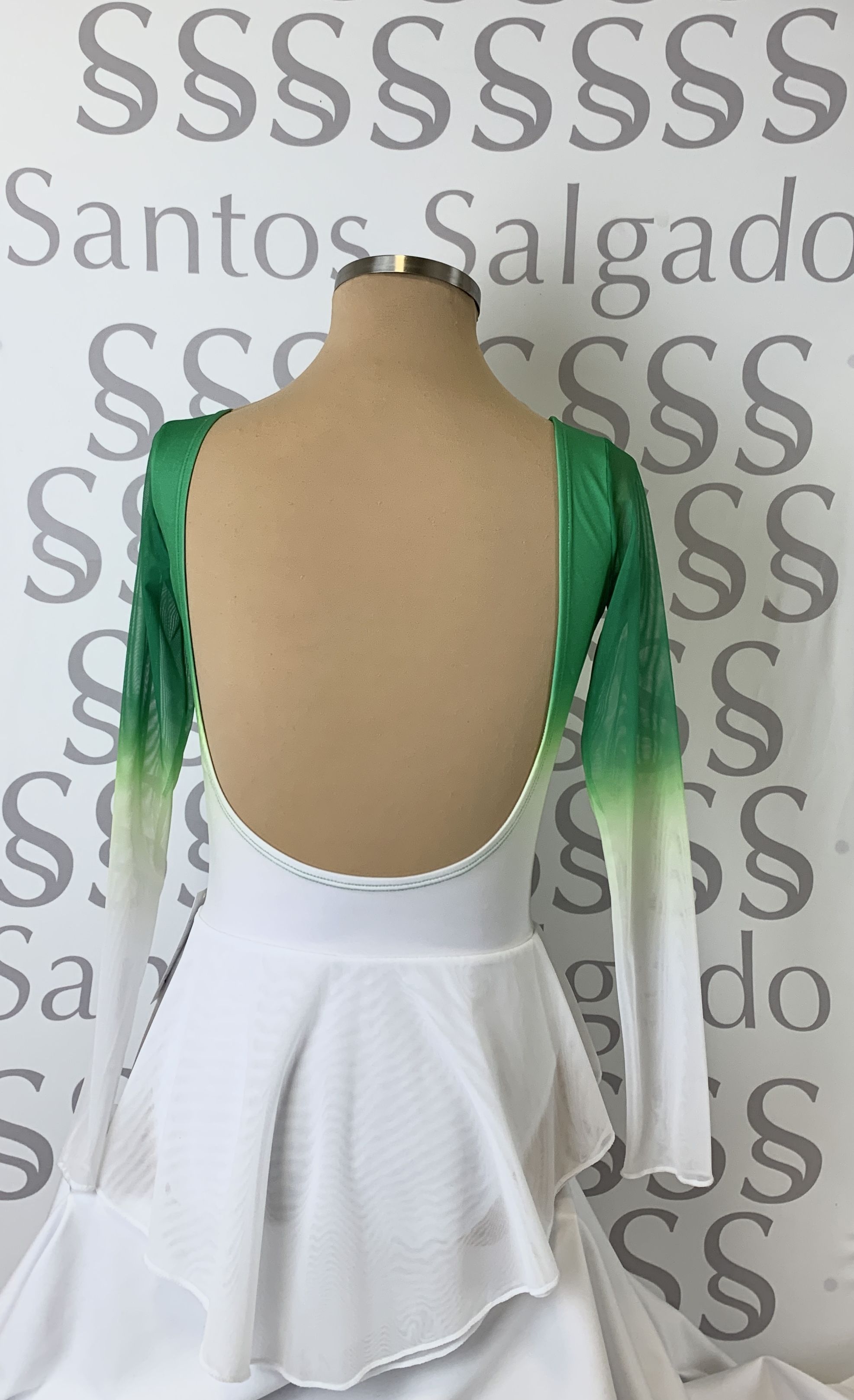 Maillot con escote barco deltante y gran escote detrás. Manga larga de gasa y falda de gasa doble