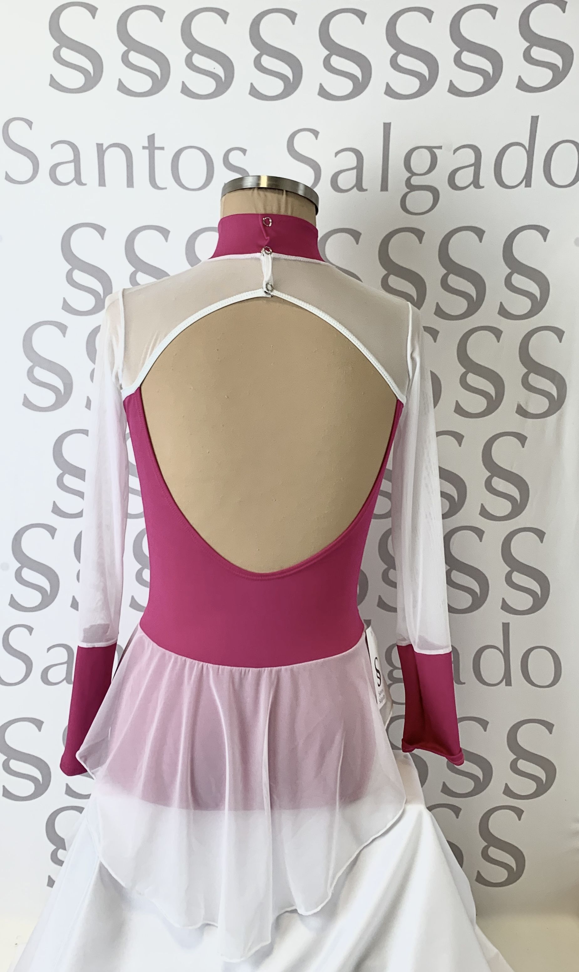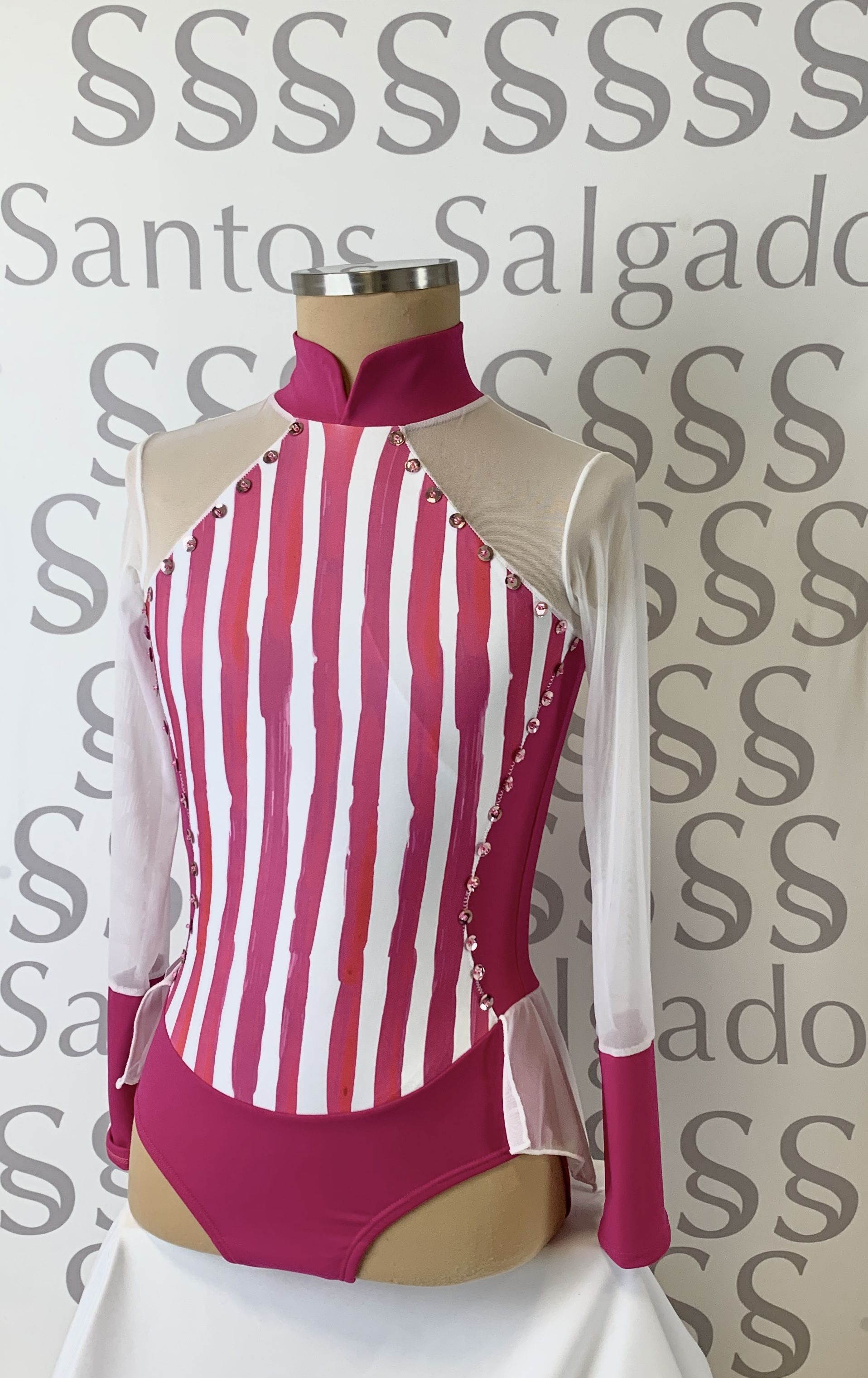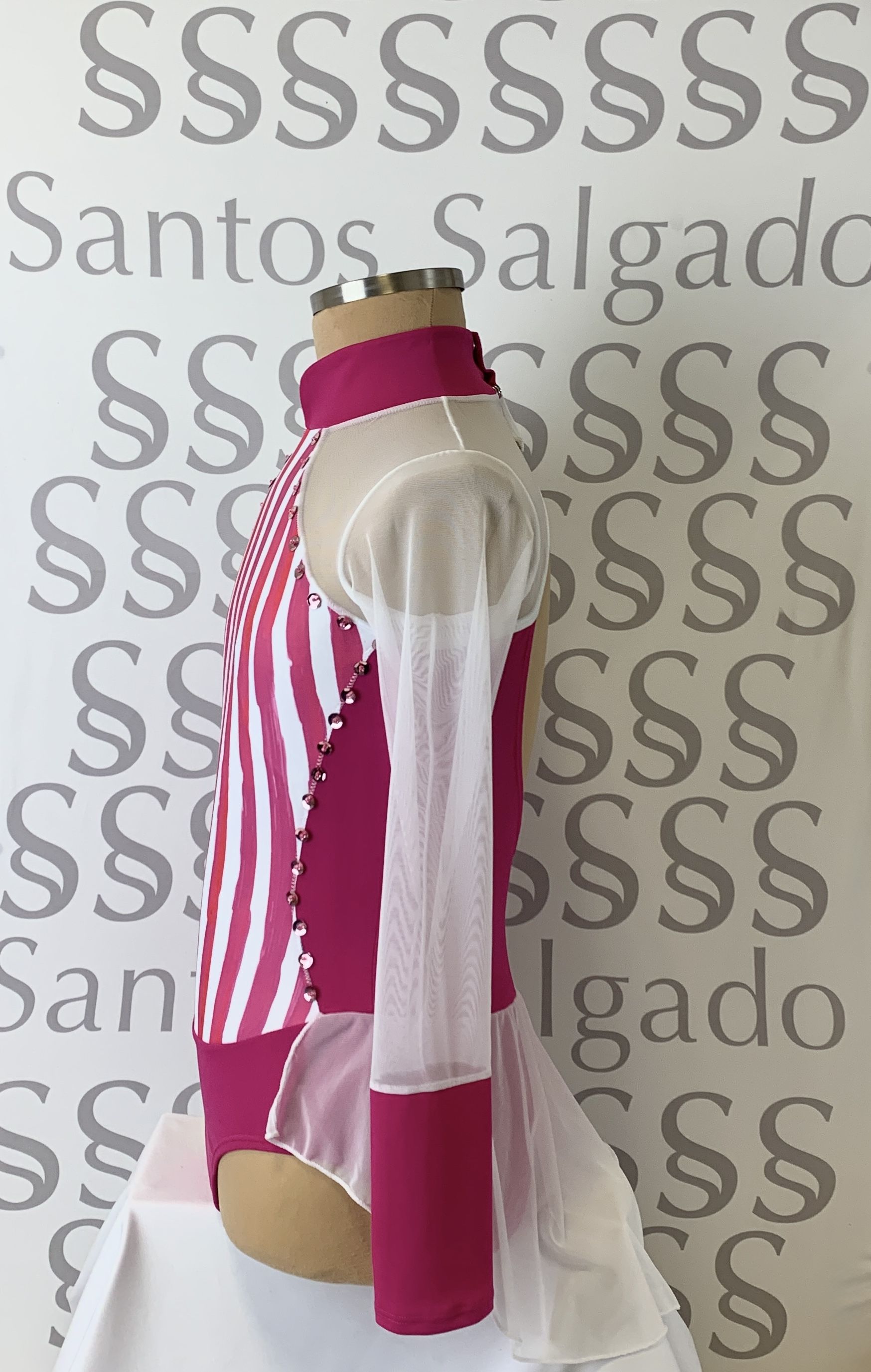 Talla 4 Maillot de cuello alto en tonos rosa y blanco con falda no completa en gasa blanca y manga larga con gran puño. Detalle de pechera en rayas verticales y lentejuelas cosidas alrededor