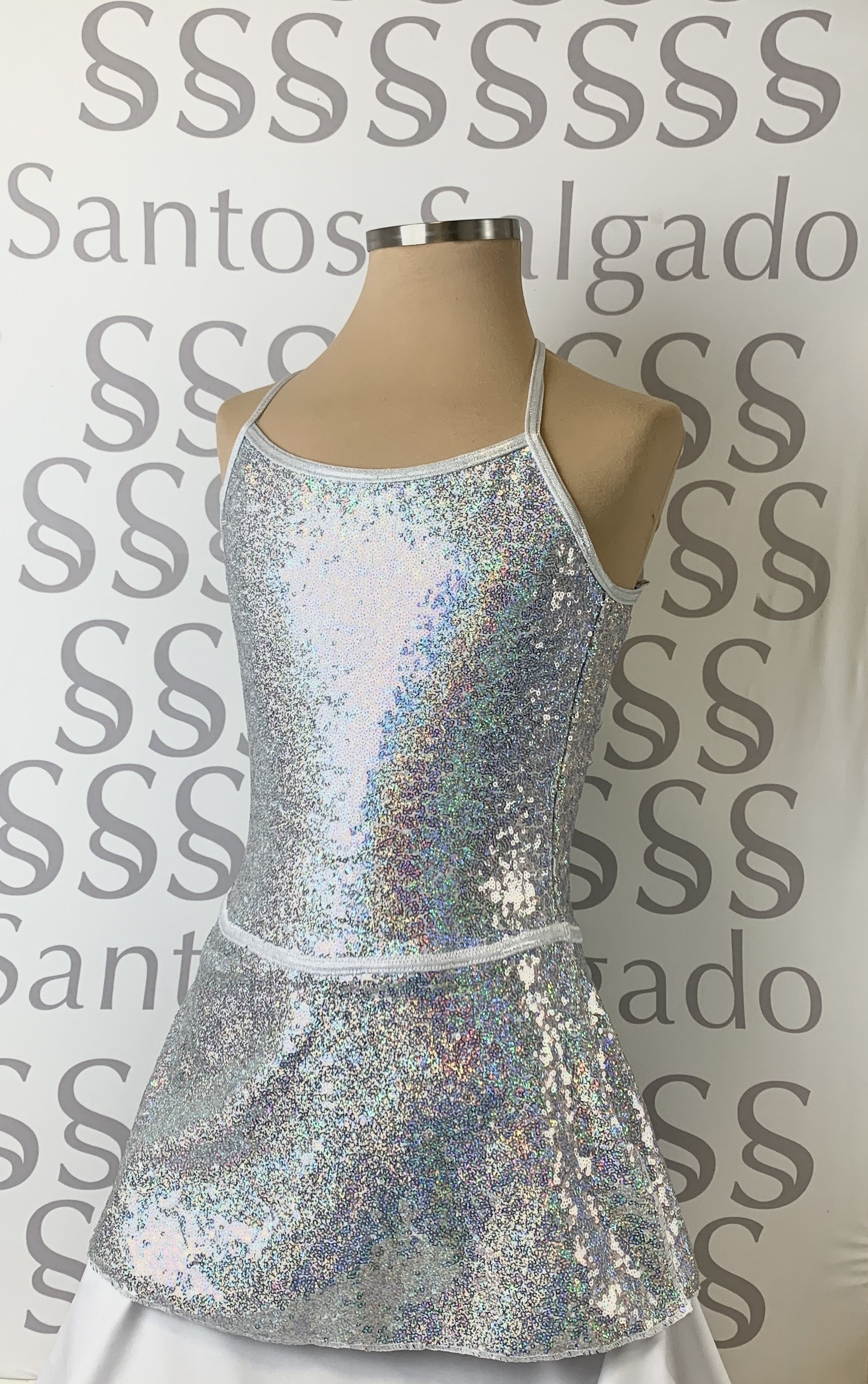Maillot en lentejuelas simulando vestido con tirantes cruzados en espalda y detalle tapacosturas donde va la falda