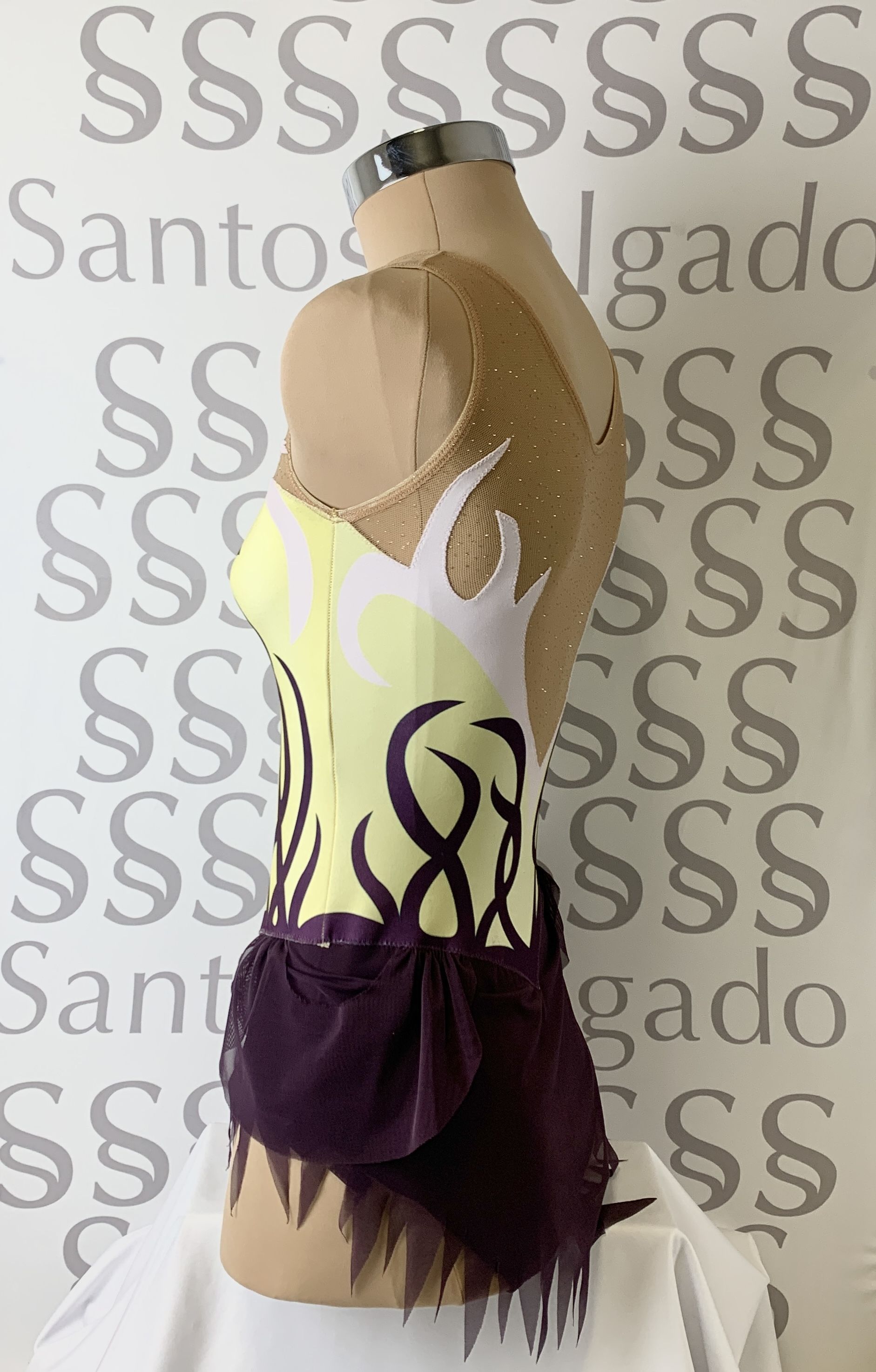 Maillot de escote barco de sisas y con falda no completa de gasa con picos. Cuerpo sublimado con terminación en picos