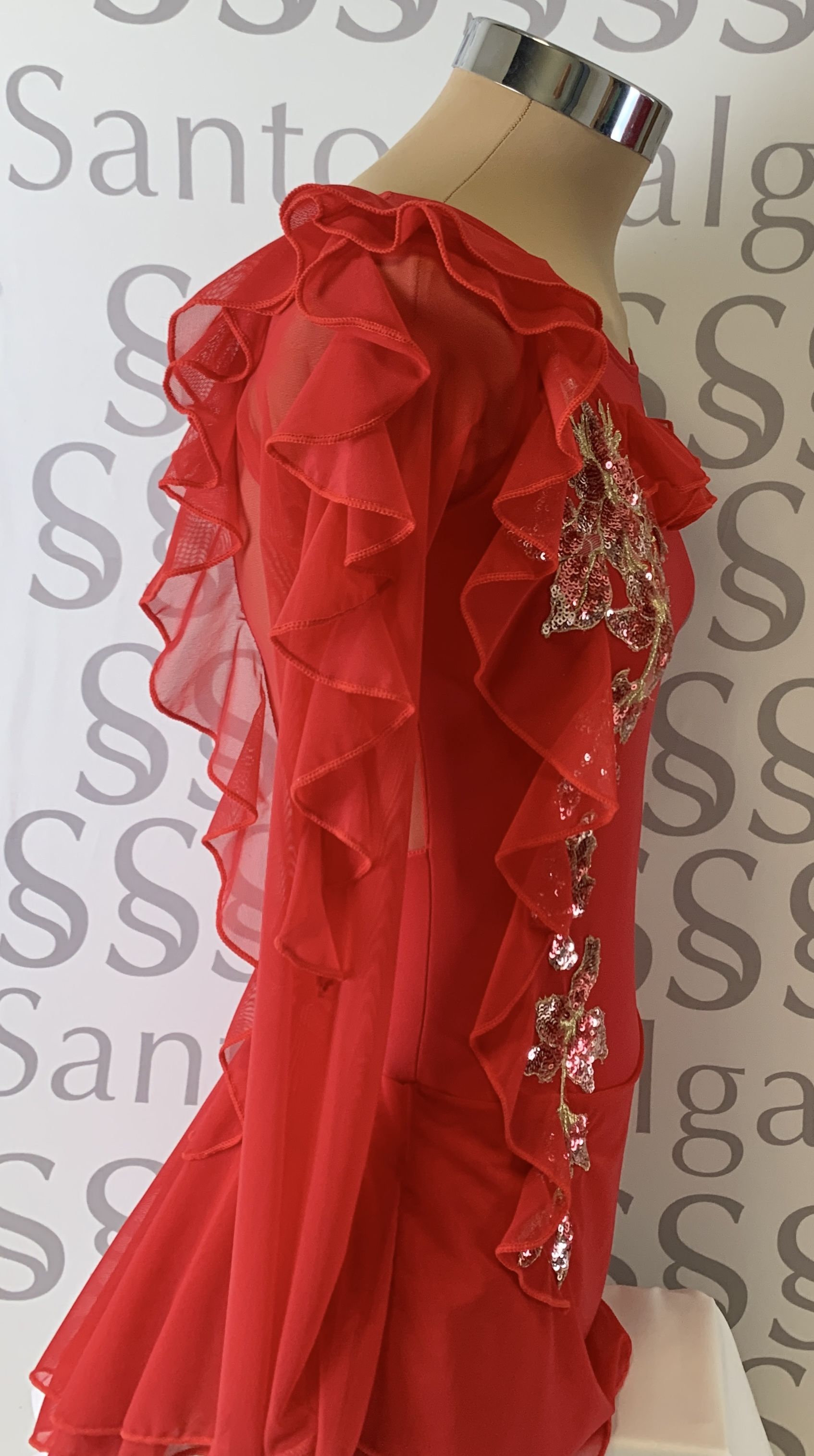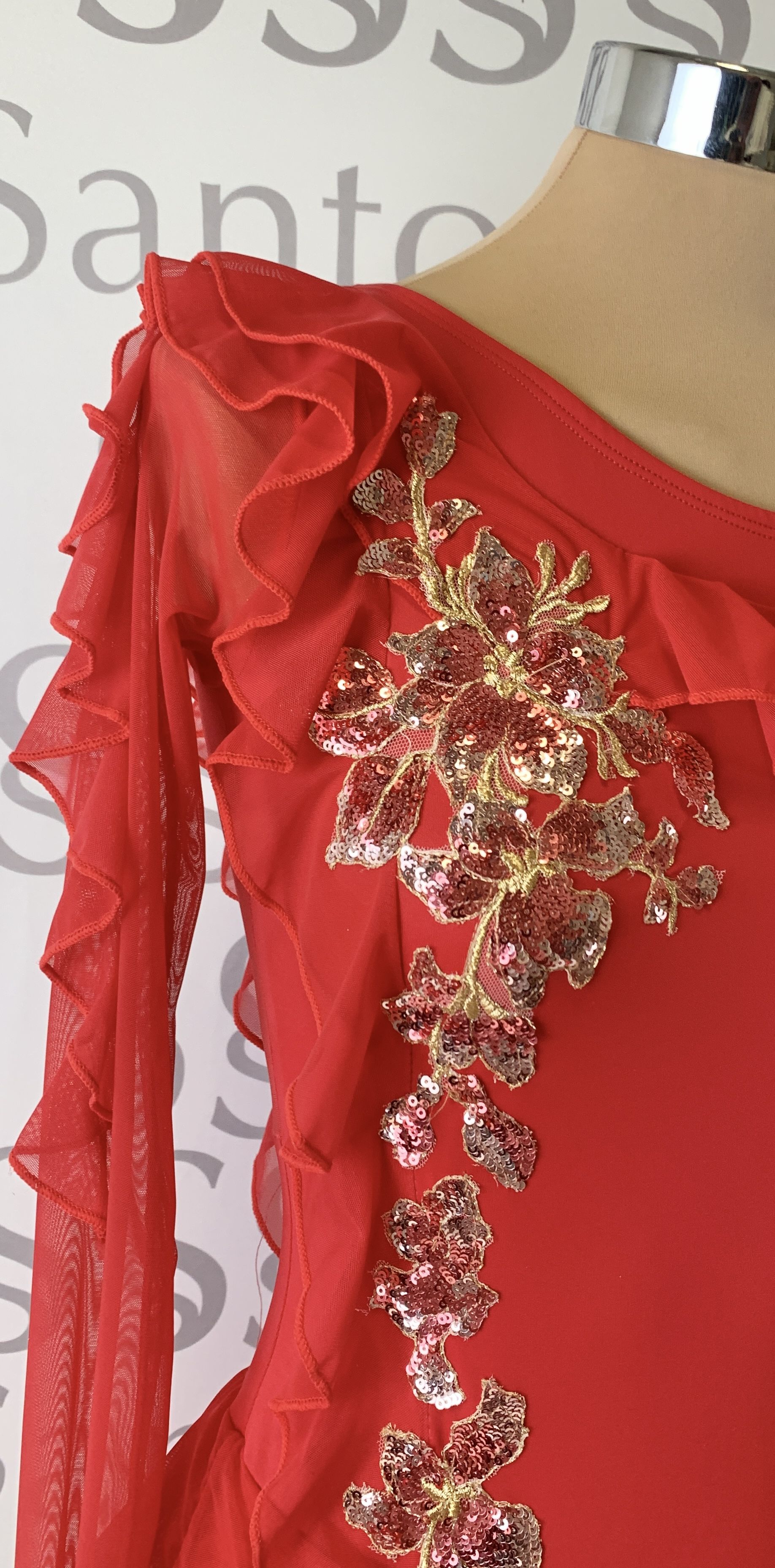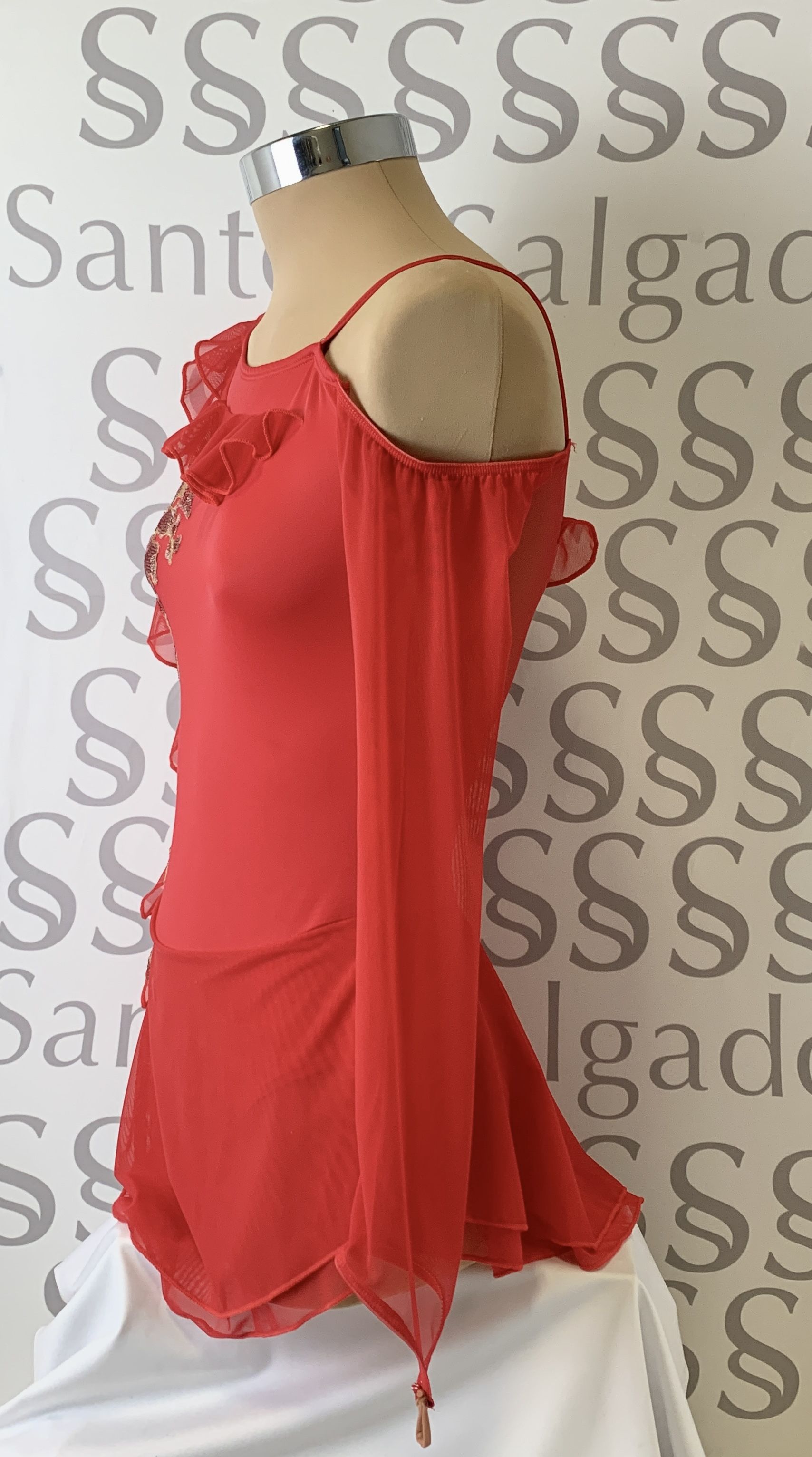 Talla 5 Maillot con hombro al aire, mangas de gasa al dedo y doble falda de gasa. Detalle de tres volantes que salen del hombro al lateral, al medio y a la manga Adornado con aplique de lentejuela en varios tonos y dorado