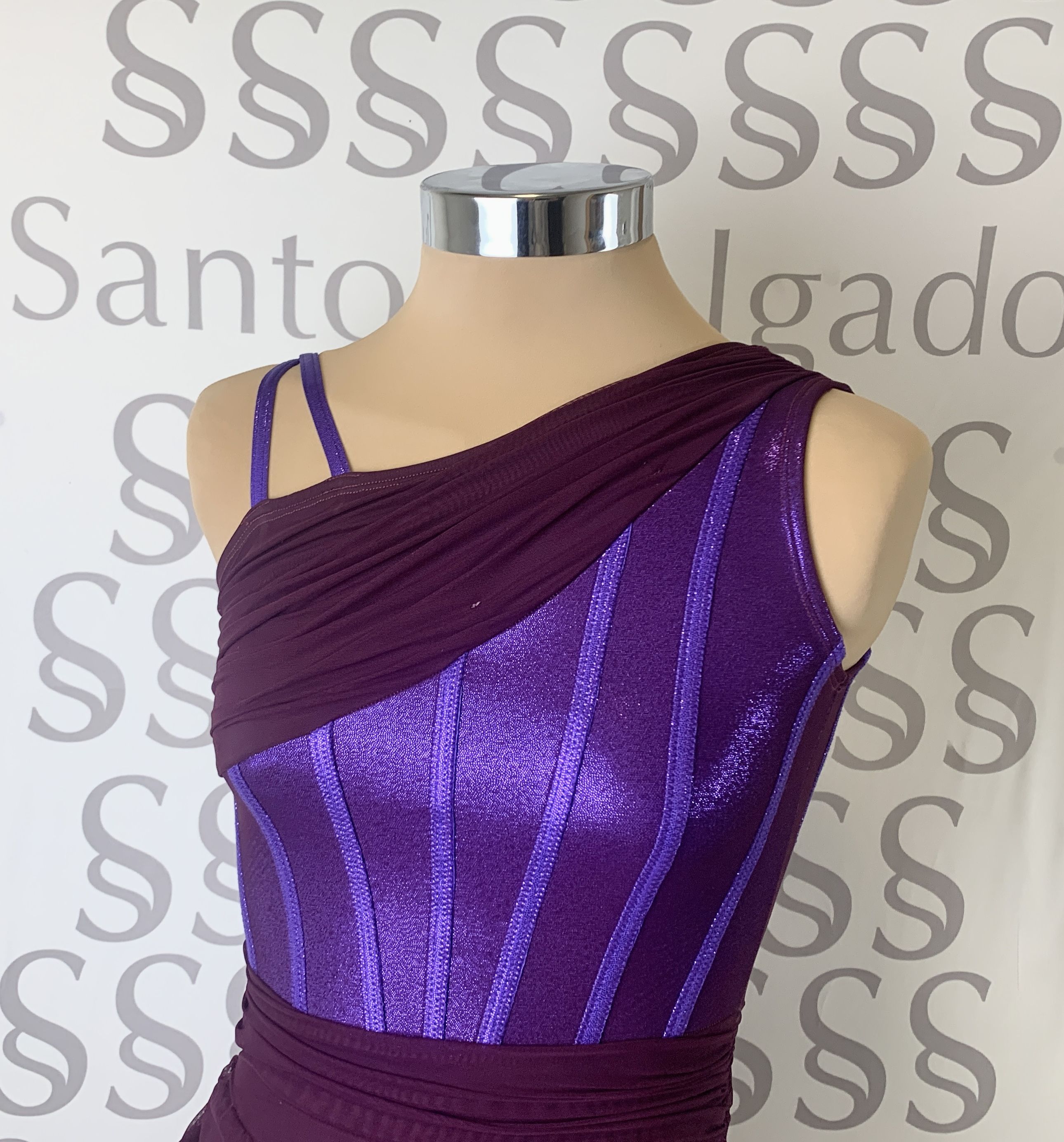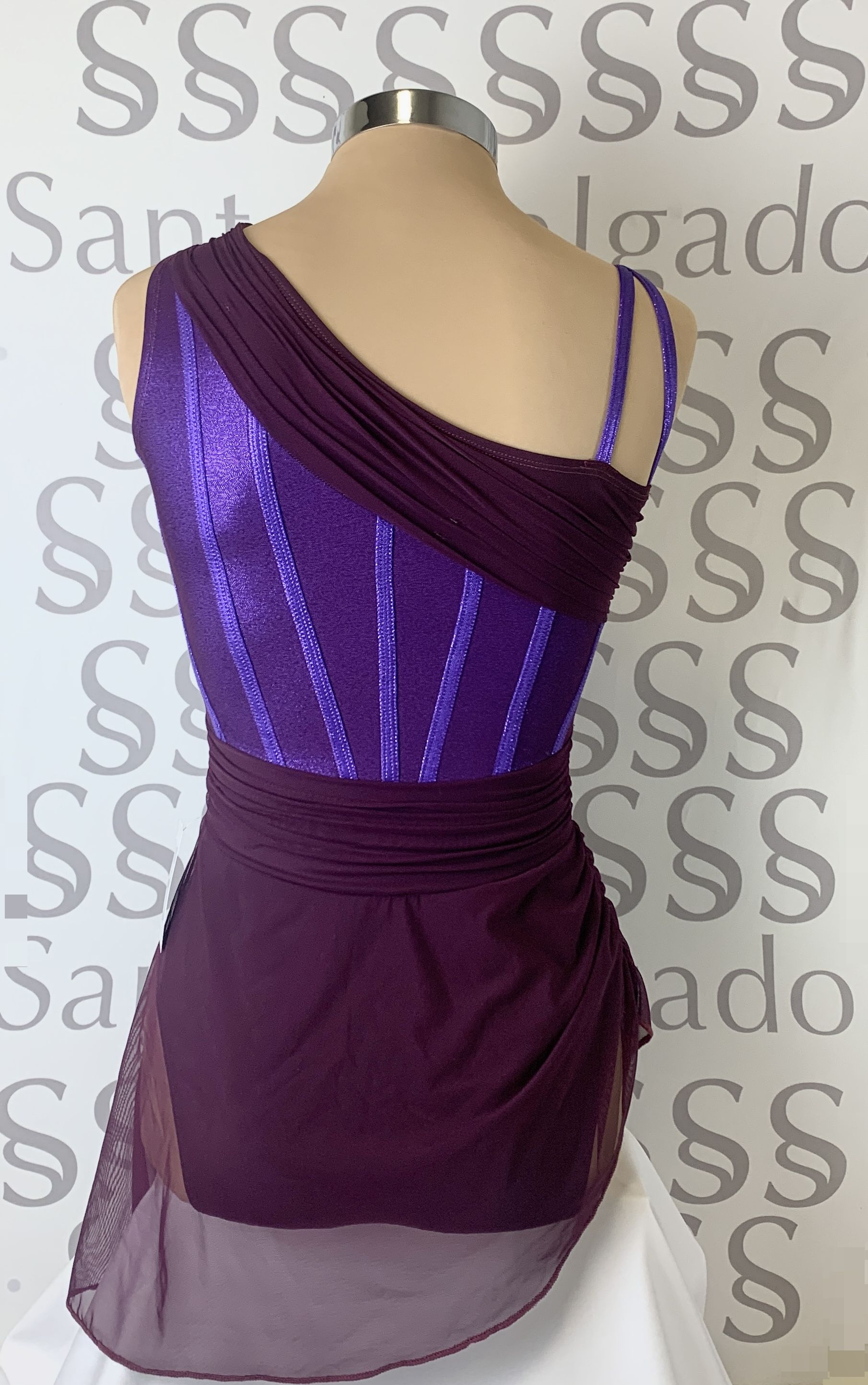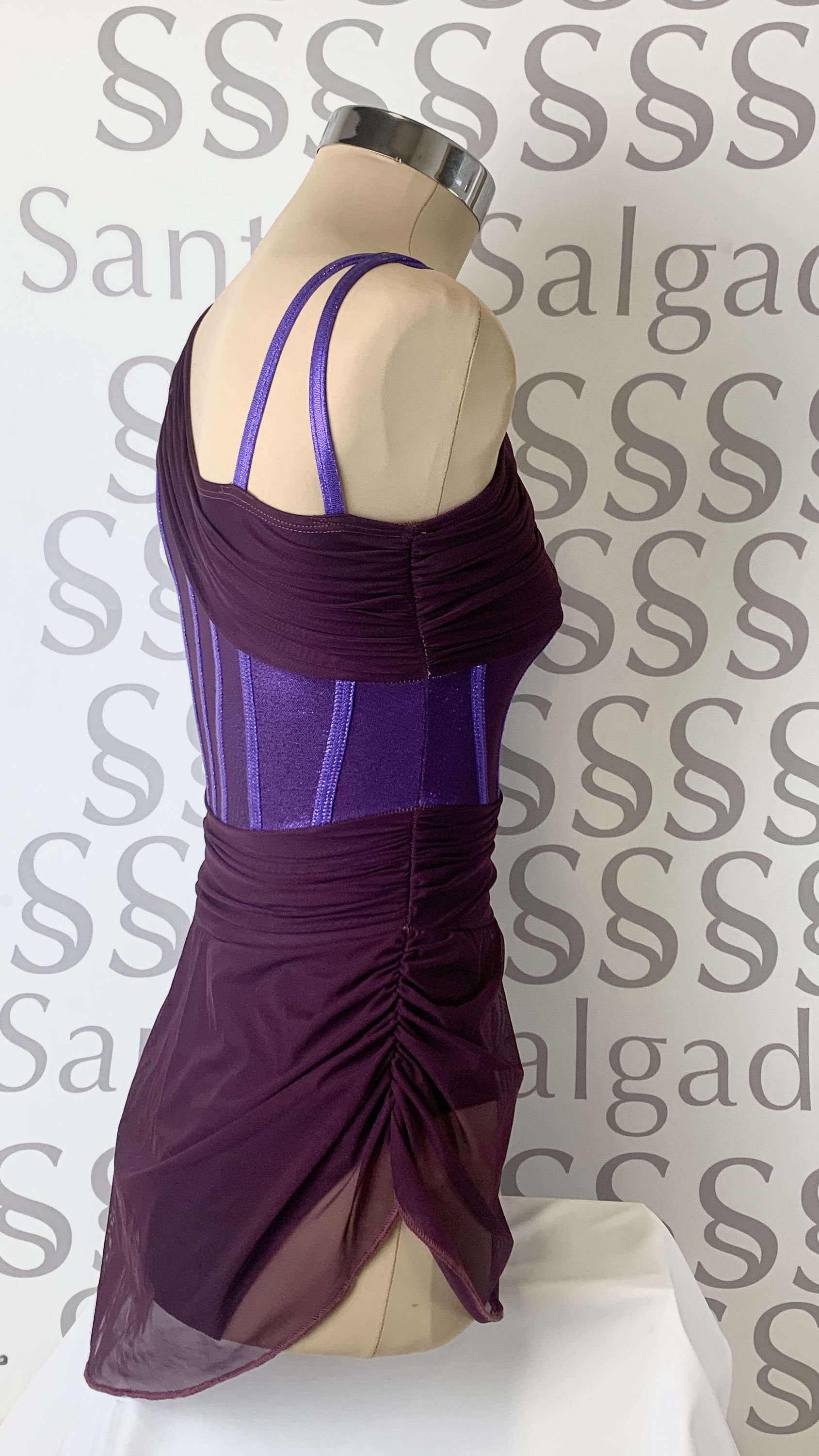 Maillot asimétrico con un lateral drapeado y el otro con tiras simulando un corset. Fajín y gran falda asimétrica drapeados de gasa