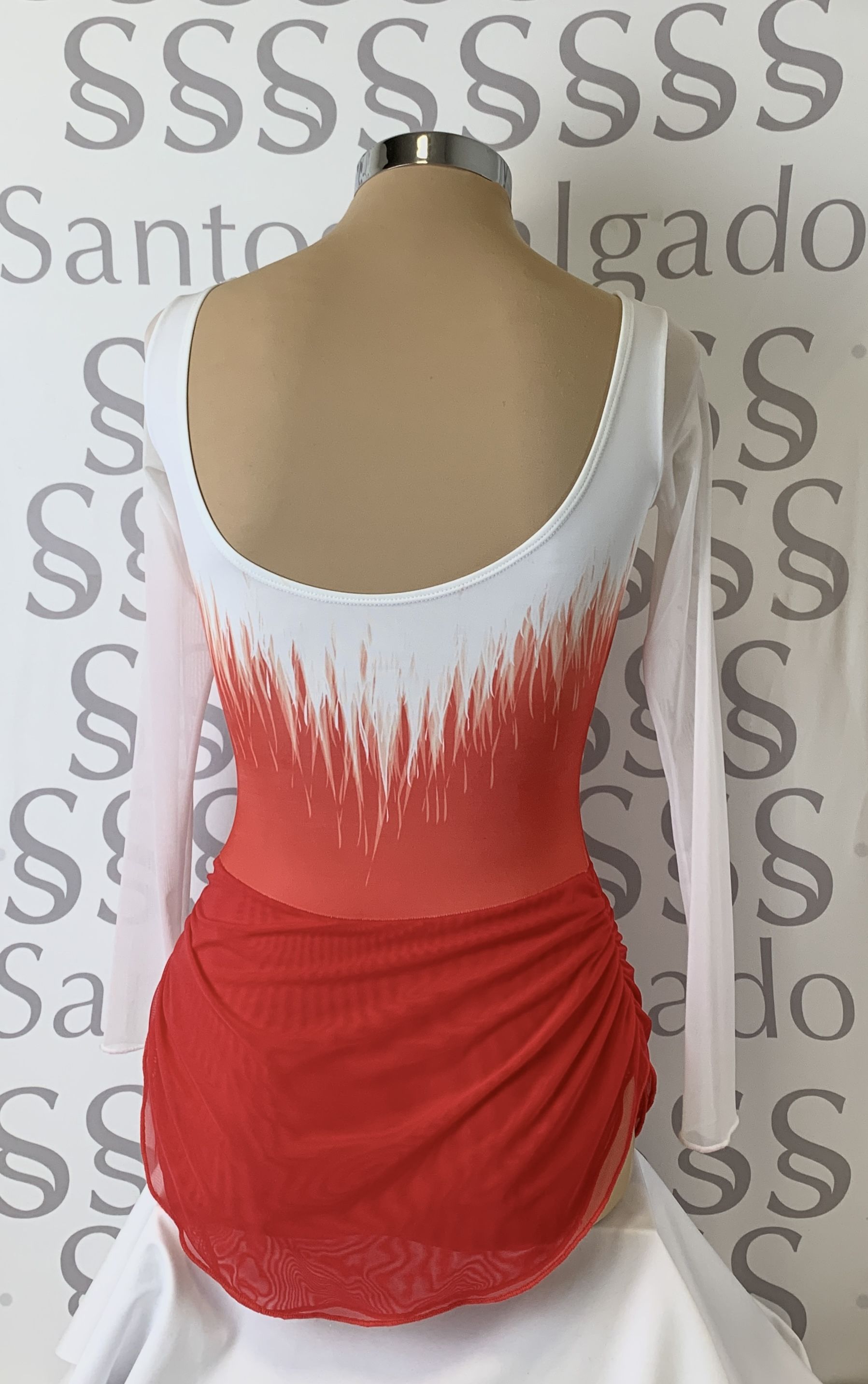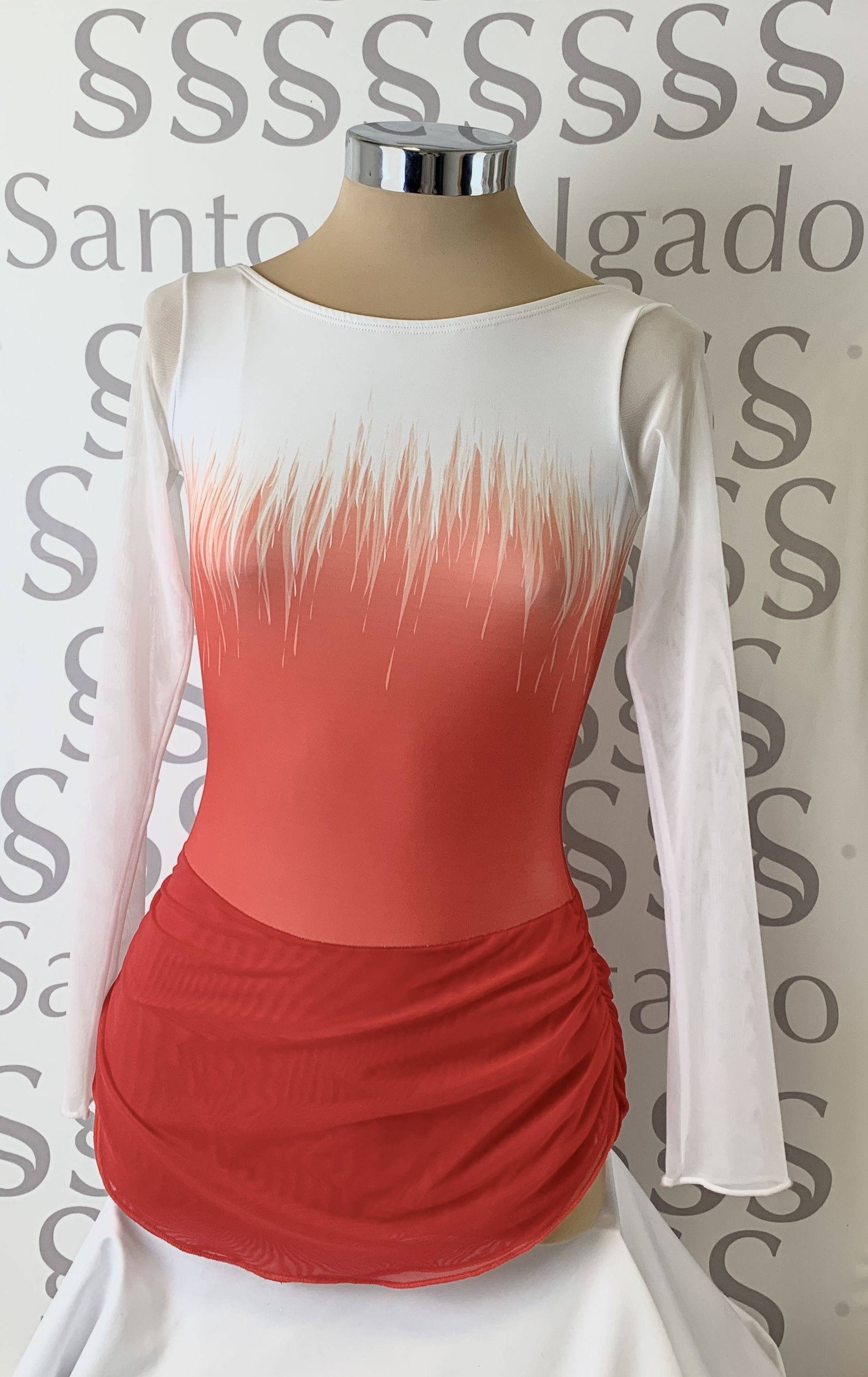 Maillot bicolor,  escote barco de manga larga de gasa y falda doble de gasa drapeada.