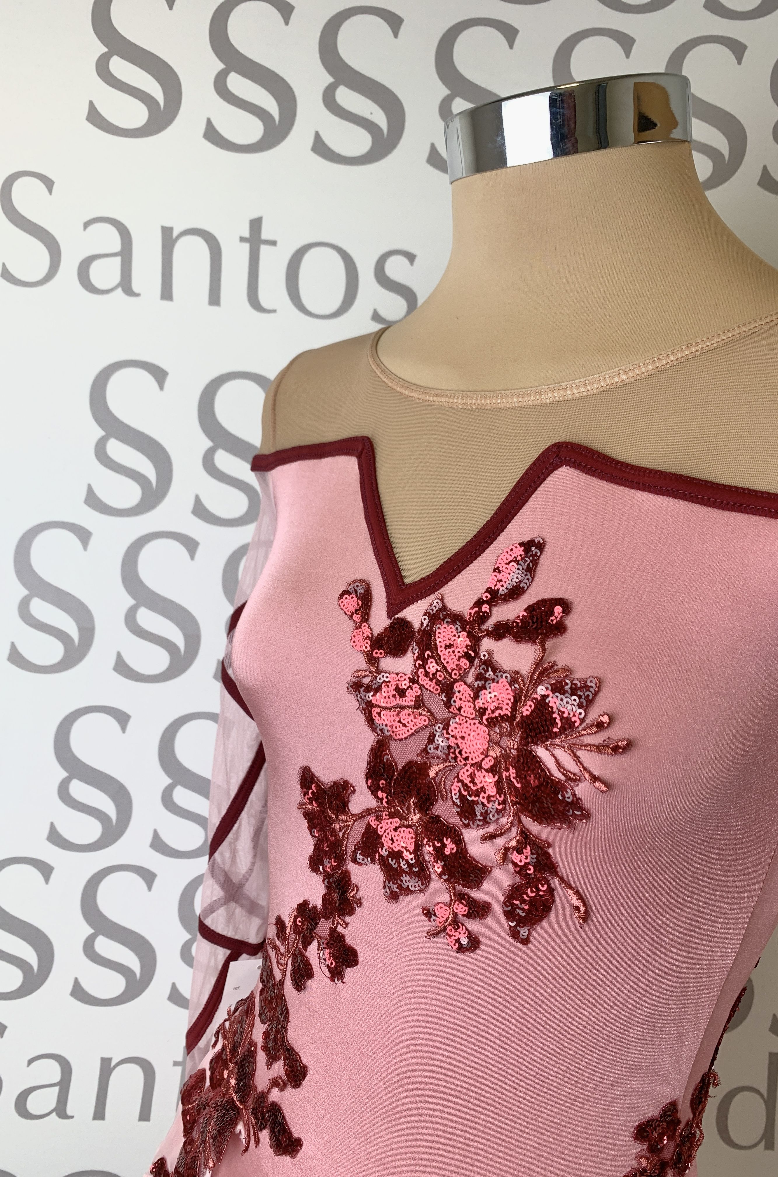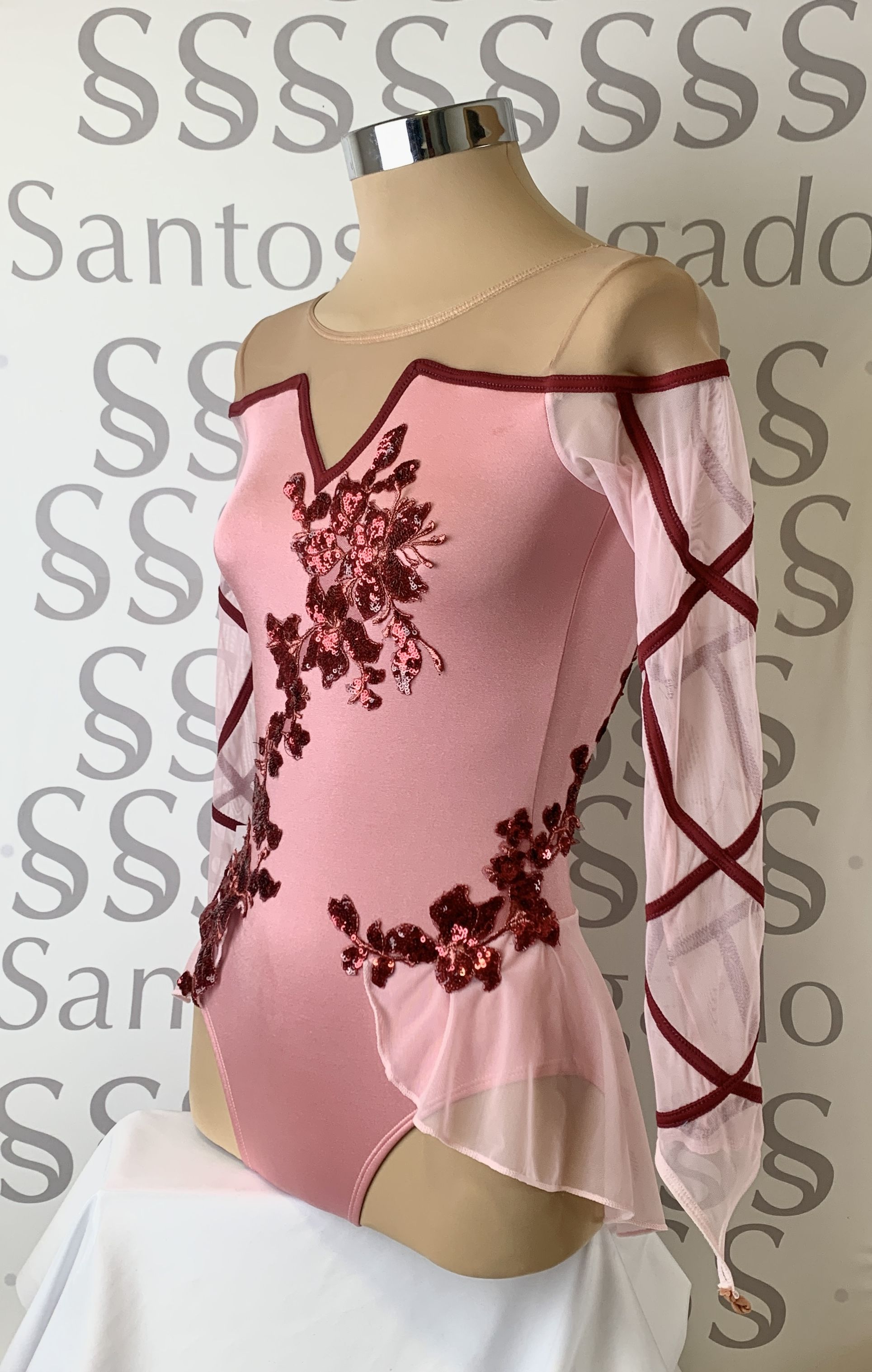 Talla 5 Maillot con falda no completa y manga larga de gasa. Escote en V, delante y atrás con parte de arriba en gasa carne. Detalle de vivos en color granate por toda la manga larga ribeteando escote y a tono con gran aplicación de lentejuela en delantero y espalda