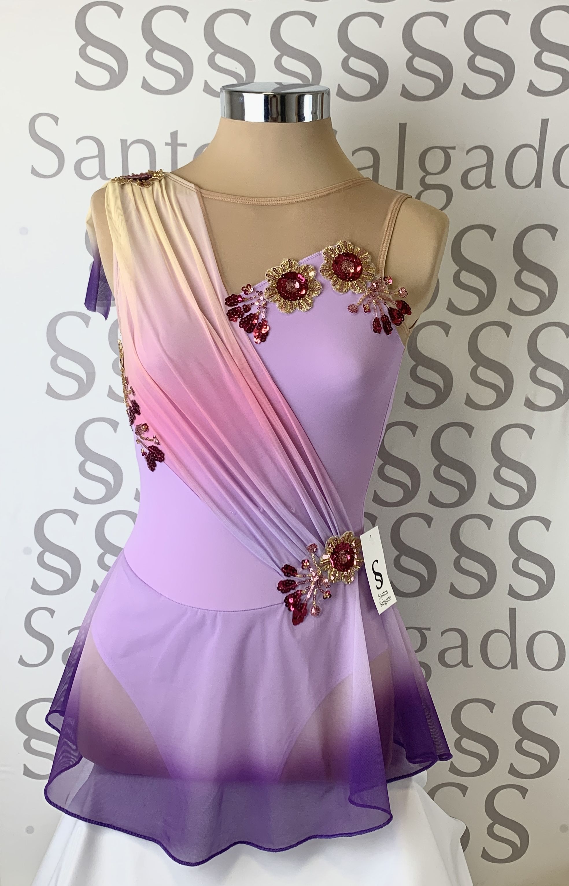 Talla 5 Maillot con falda de gasa sublimado bajo a tono con el cuerpo. Franja drapeada de hombro a cadera en distintos tonos en el delantero y espalda libre Detalle de flores a tono