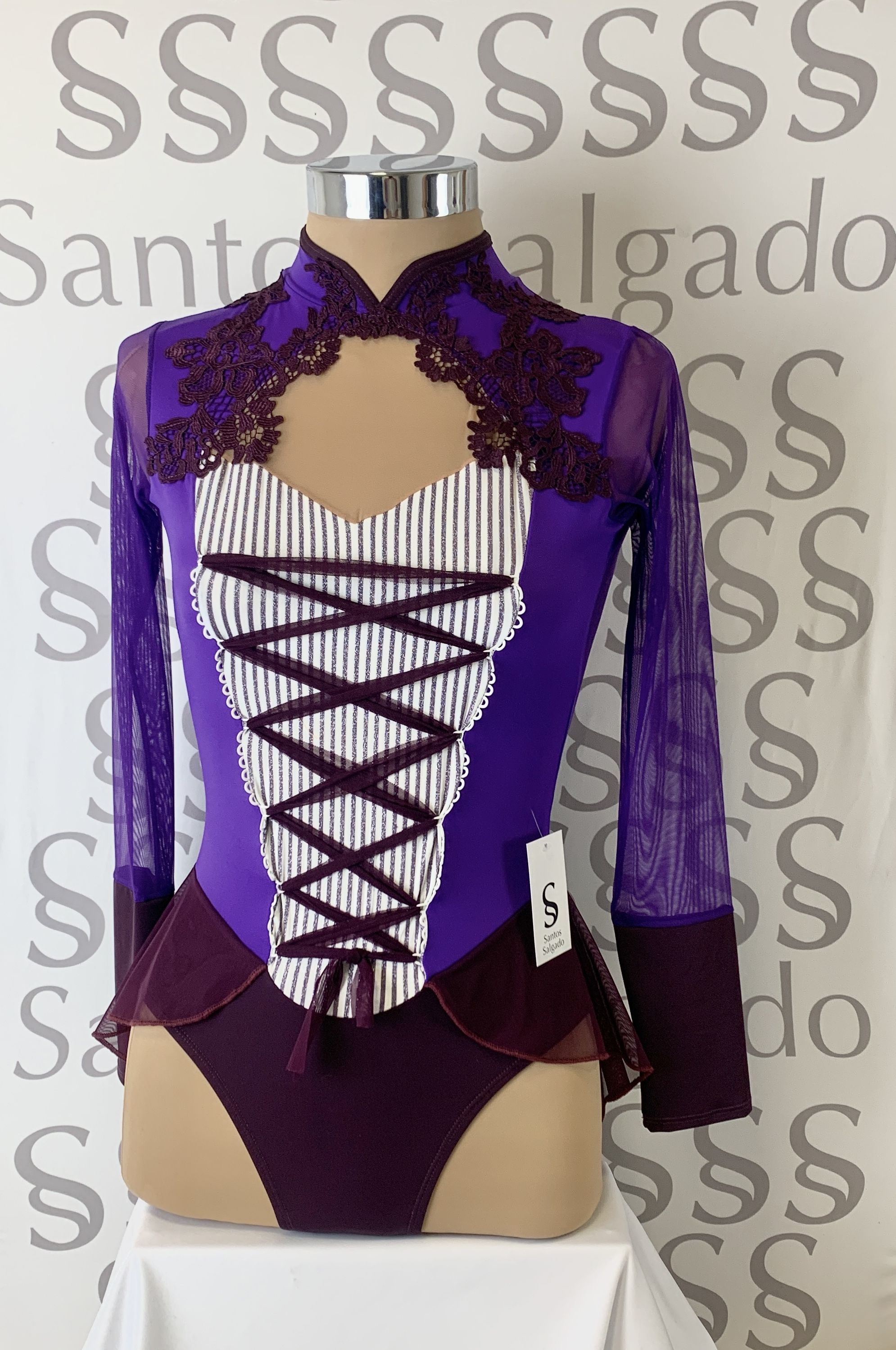 Talla 5 Maillot con falda no completa en tonos morados con clara inspiración barroca / circense. Detalles de apliques de encaje en berenjena y cruzado delante sobre pechera rayada con gasa a tono y en espalda gran escote.