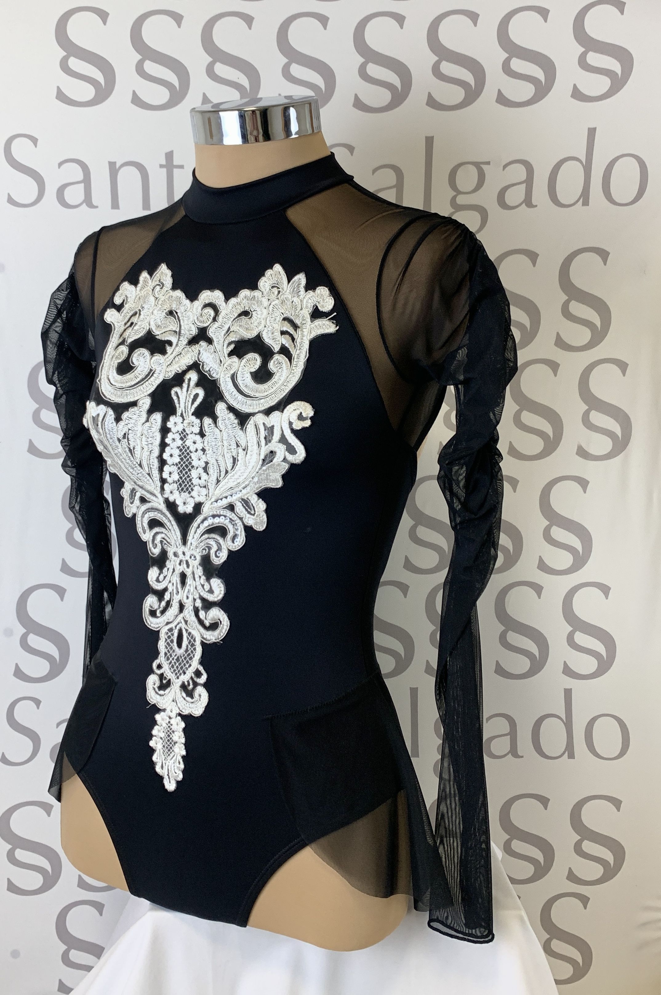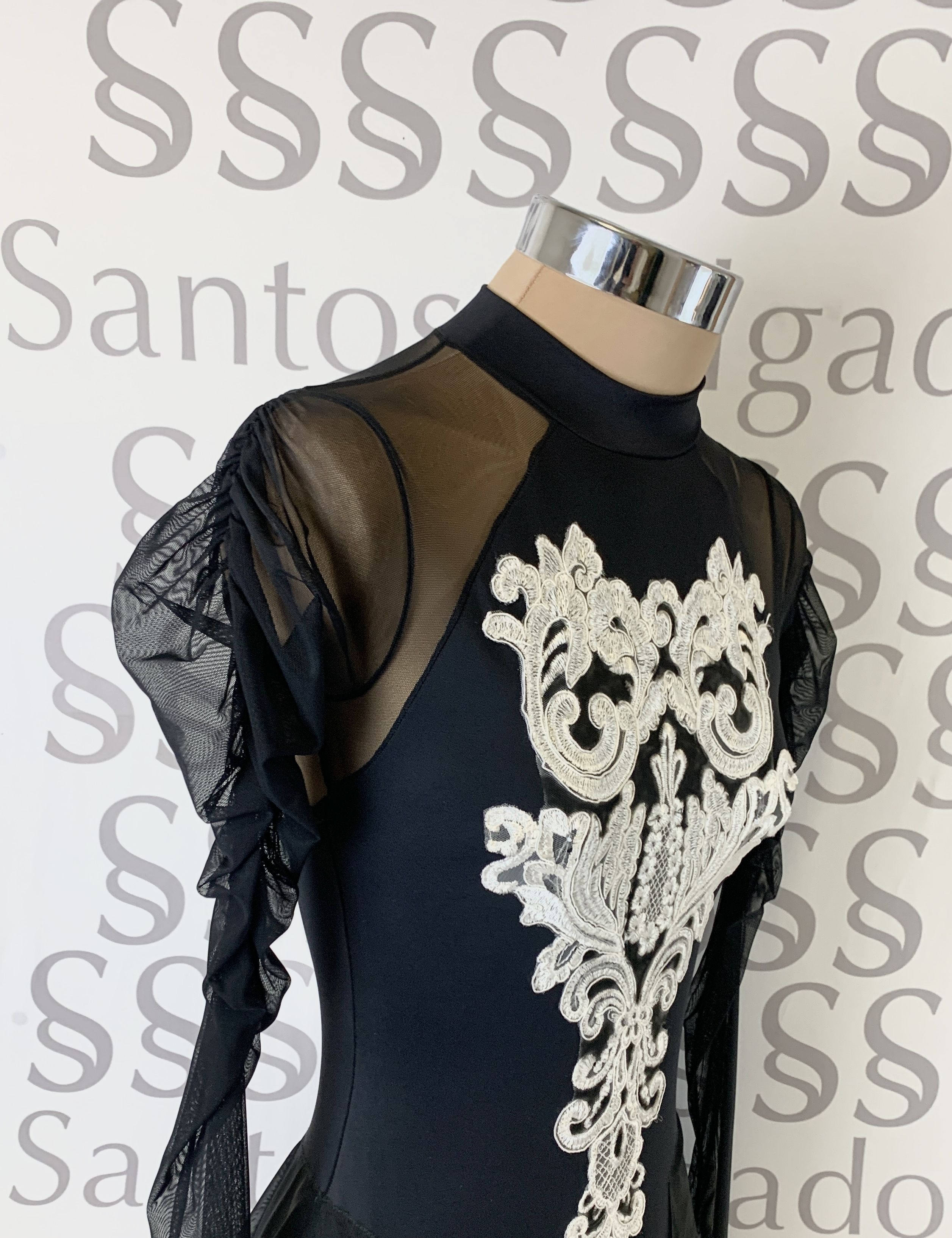 Maillot con cuello subido, falda no completa de gasa y preciosas mangas largas de gasa drapeadas.