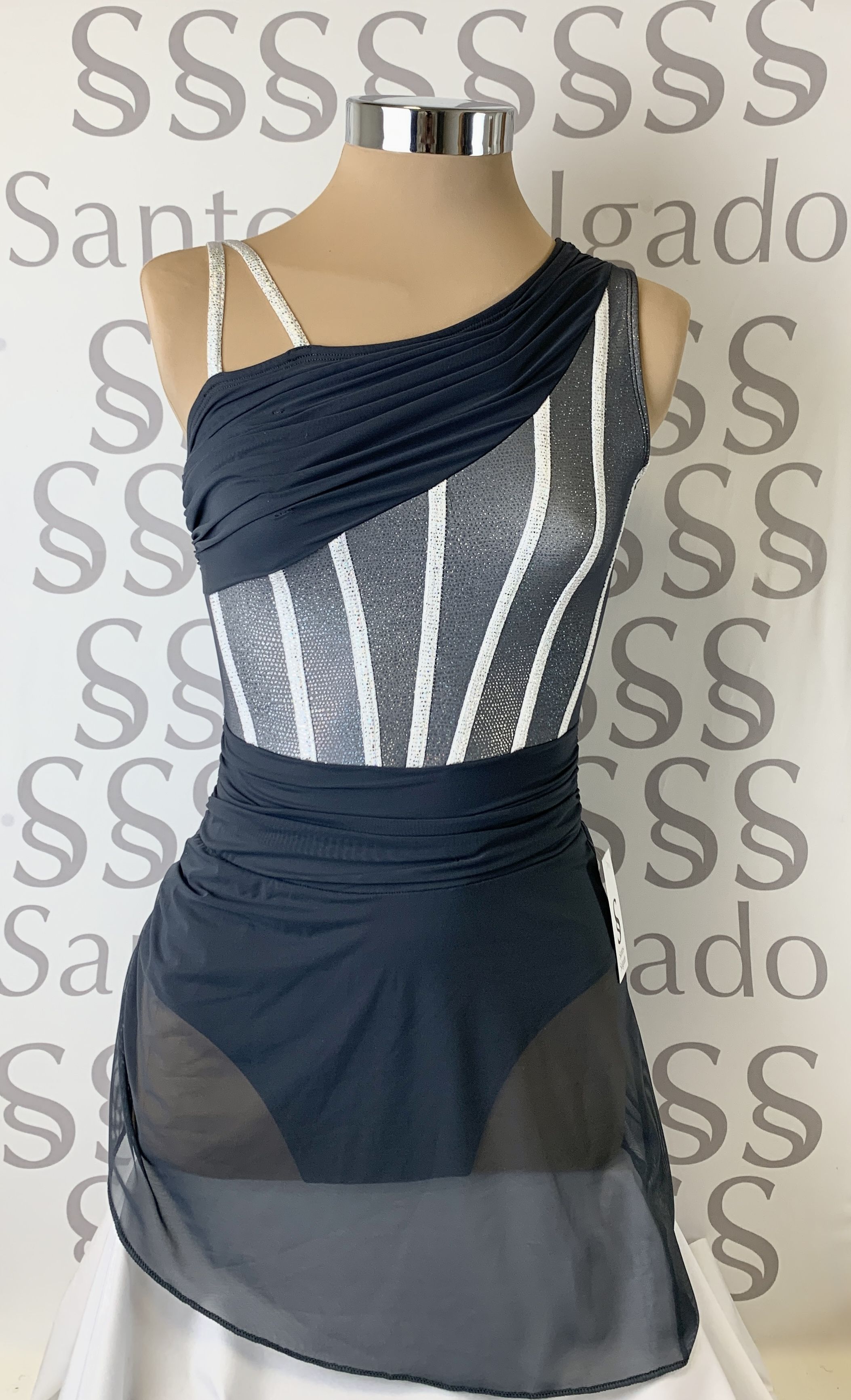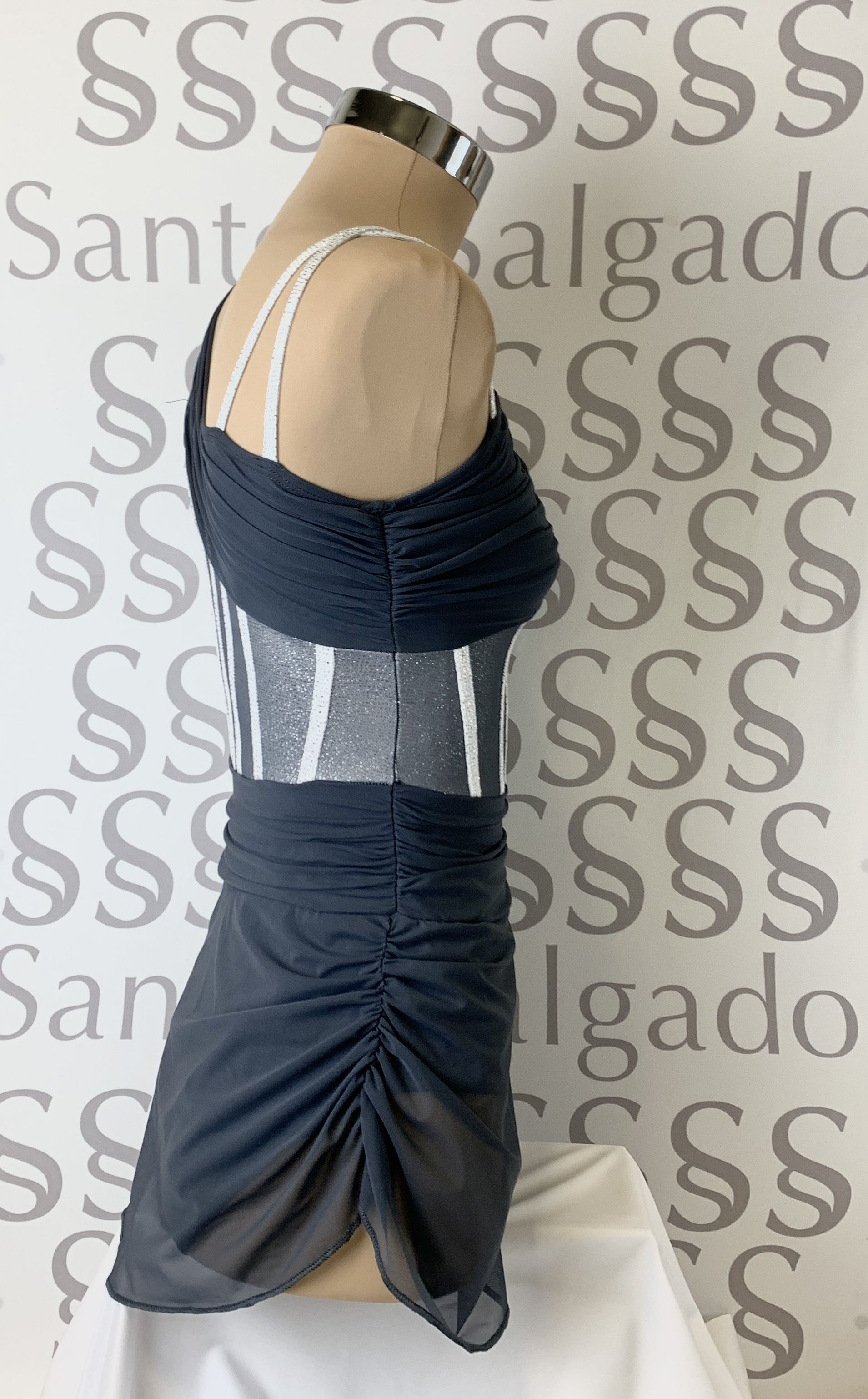 Maillot asimétrico con un lateral drapeado y el otro con tiras simulando un corset. Fajín y gran falda asimétrica drapeados de gasa