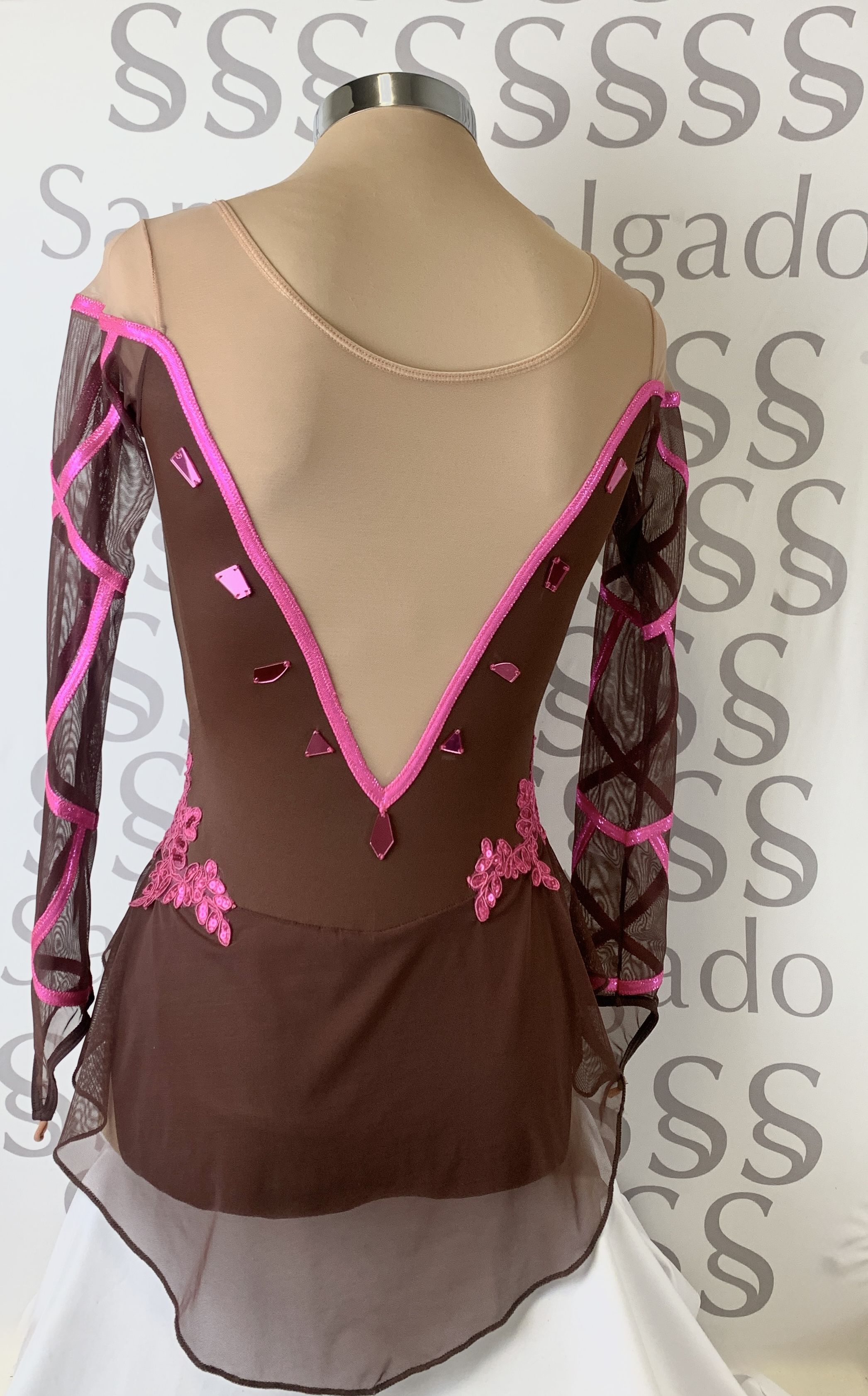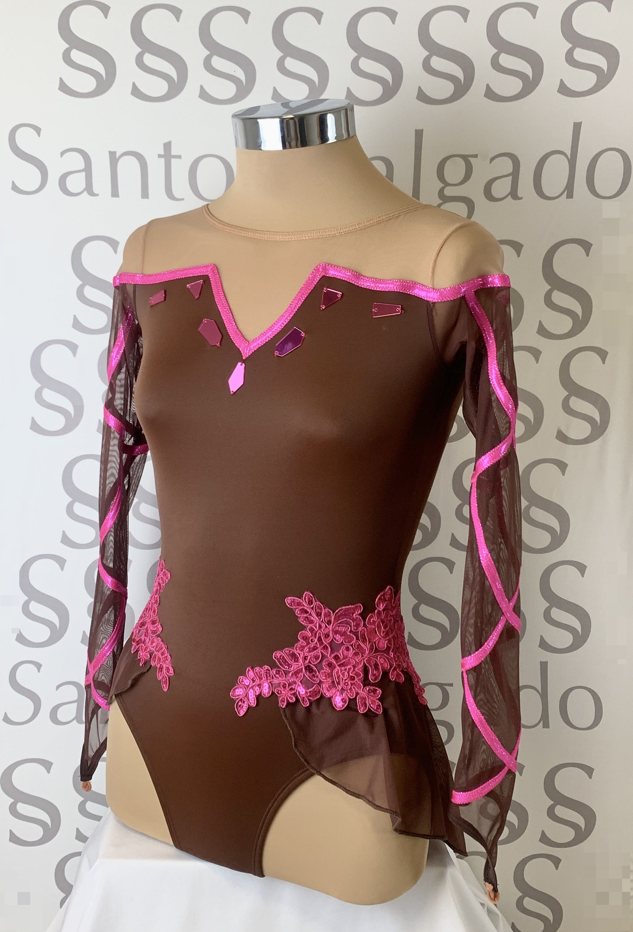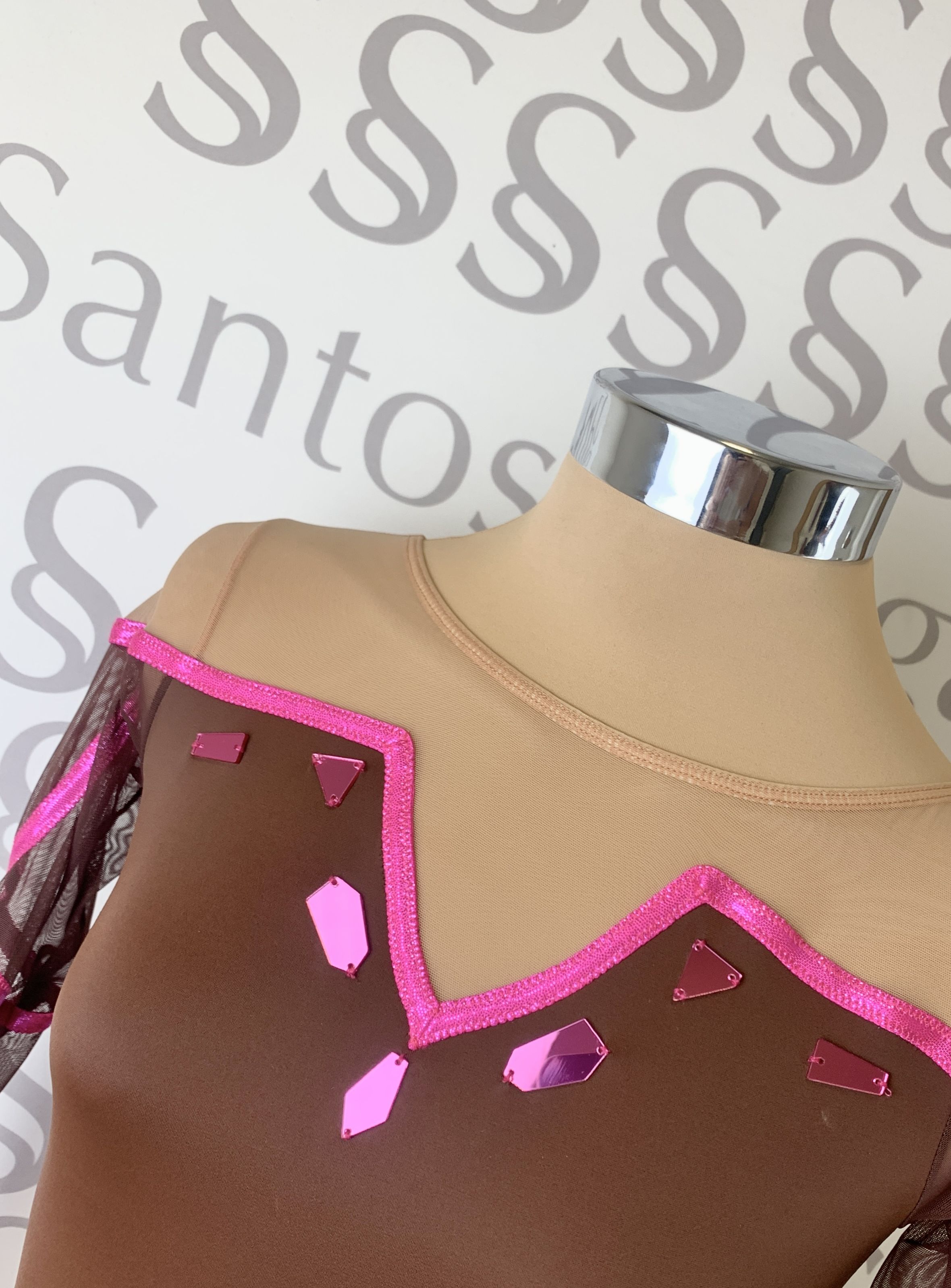 Detalle de vivos en color rosa brillante, espejos, aplicaciones de encaje con lentejuelas.
