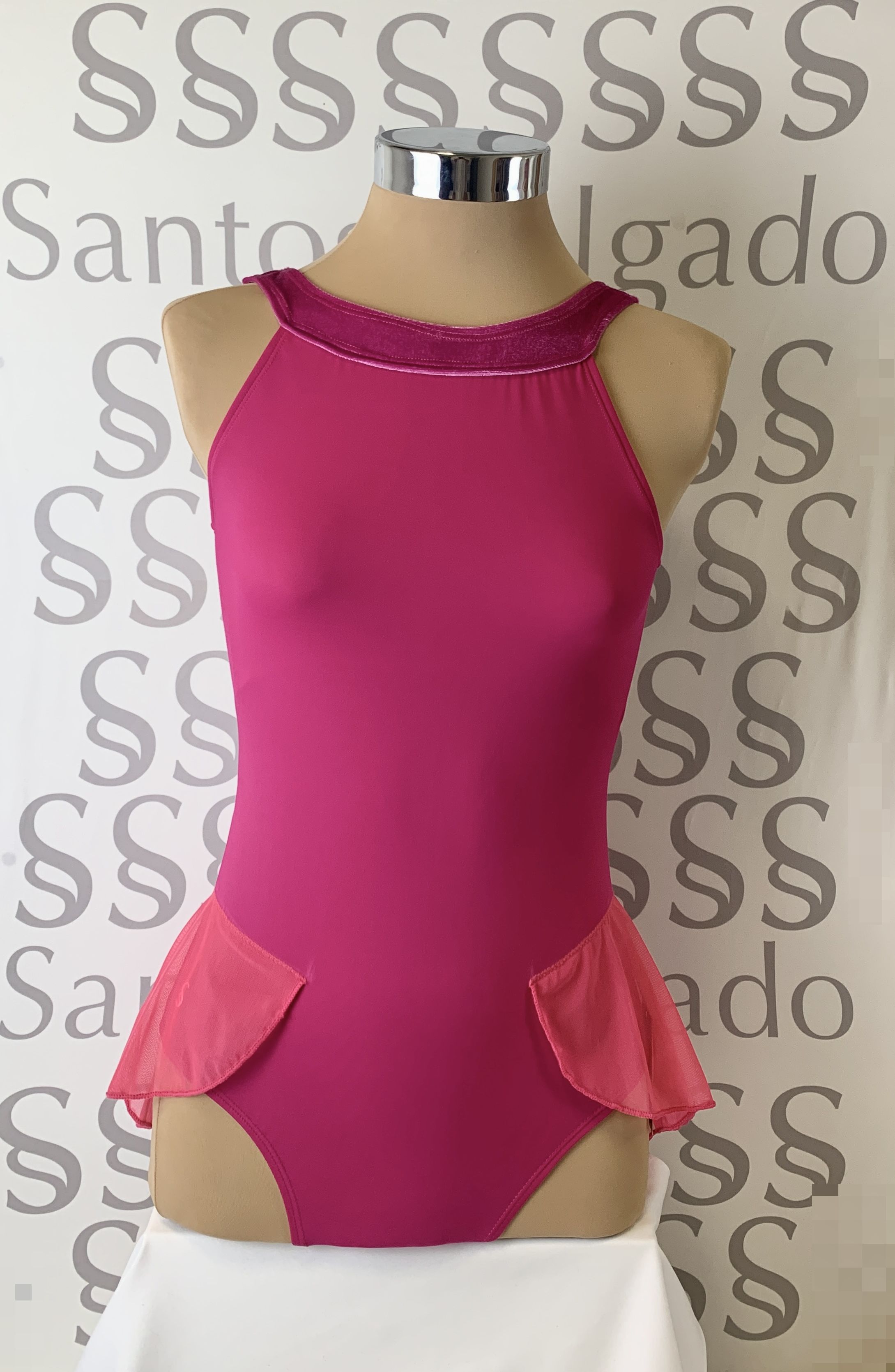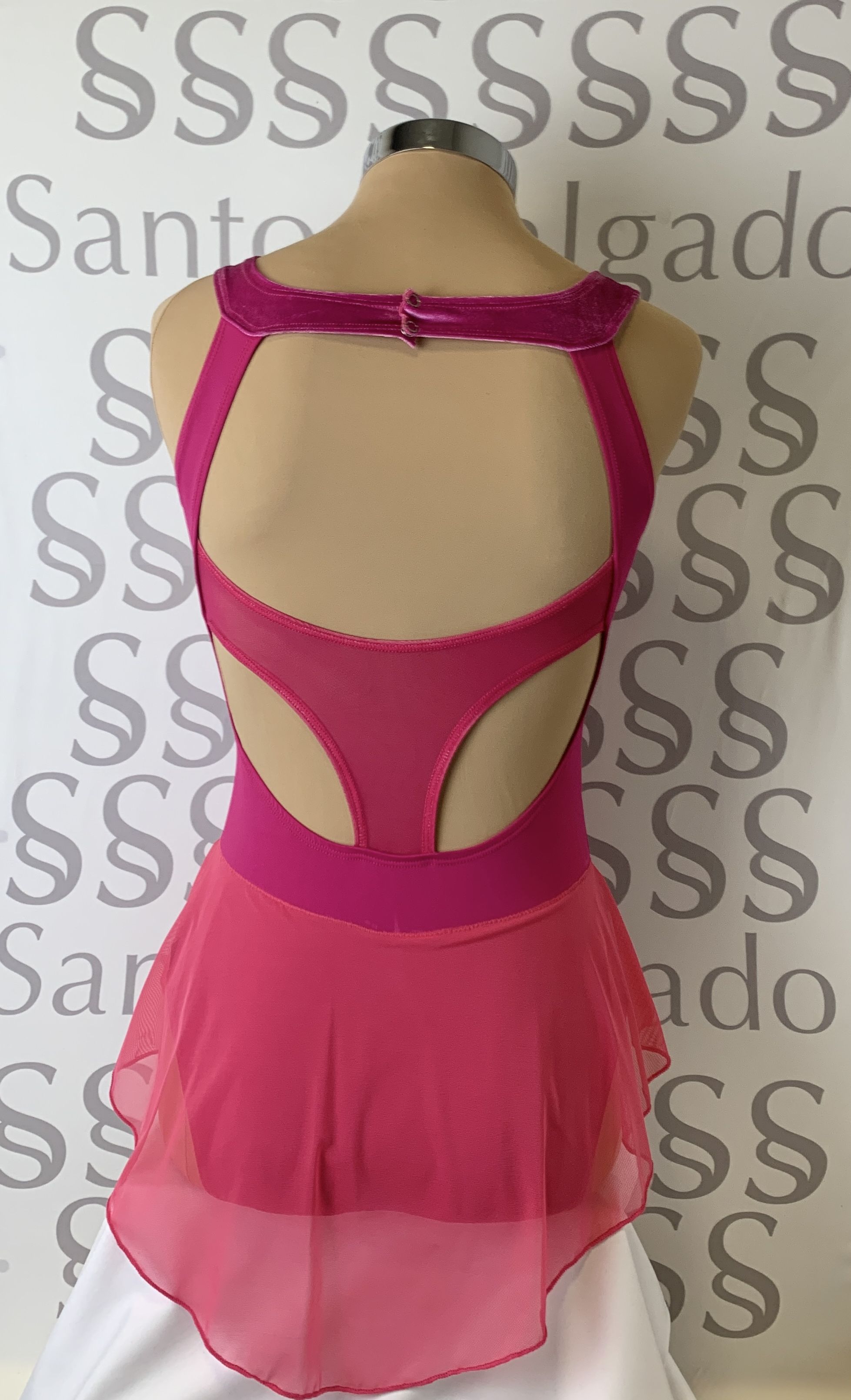 Maillot en tonos rosas con falda no completa de gasa con cuello de terciopelo y gran escote en la espalda con detalle en gasa