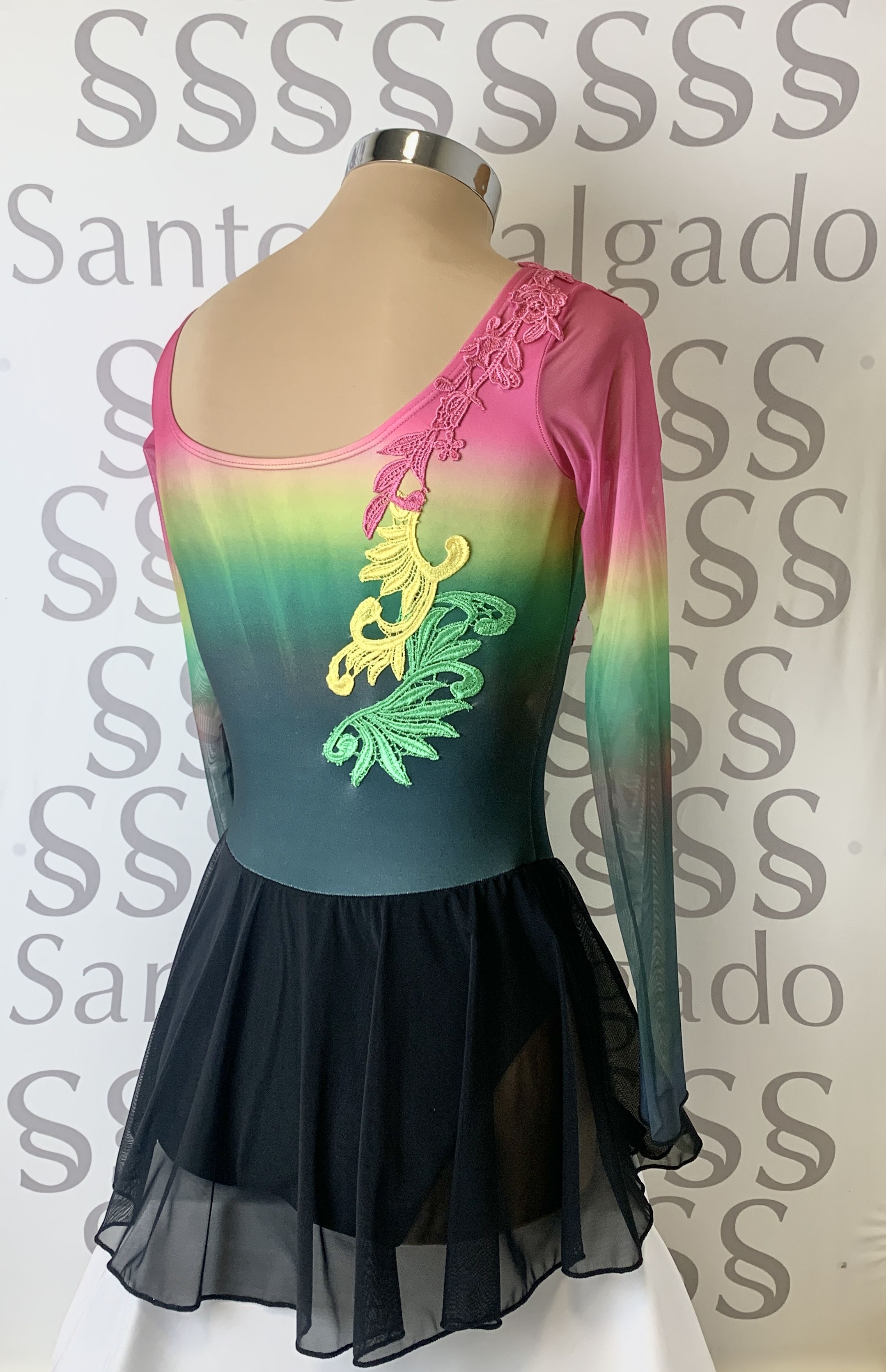 Maillot de escote barco con falda de gasa y manga larga. Parte de arriba sublimada en varios colores y con detalle de encajes en mismos tonos