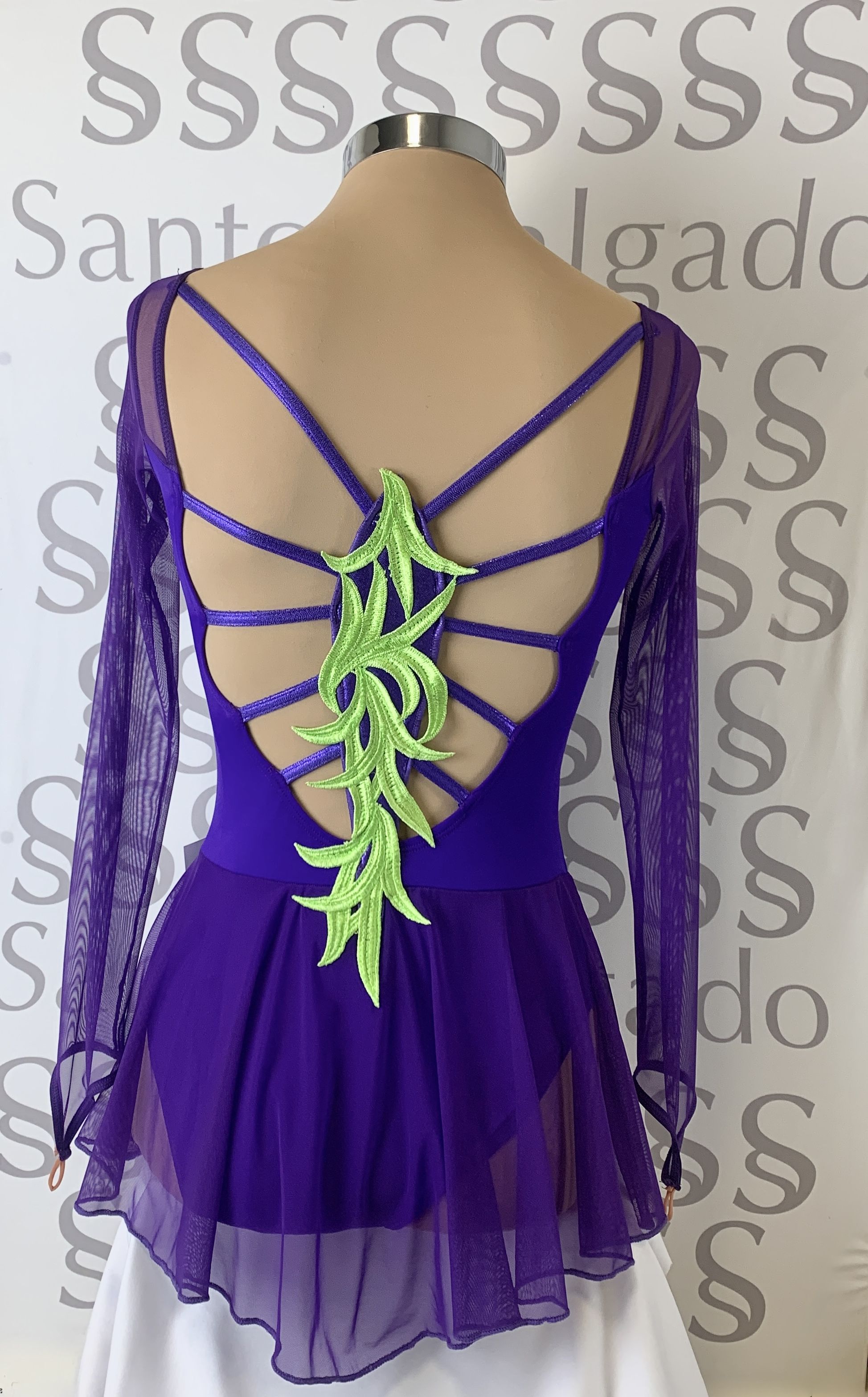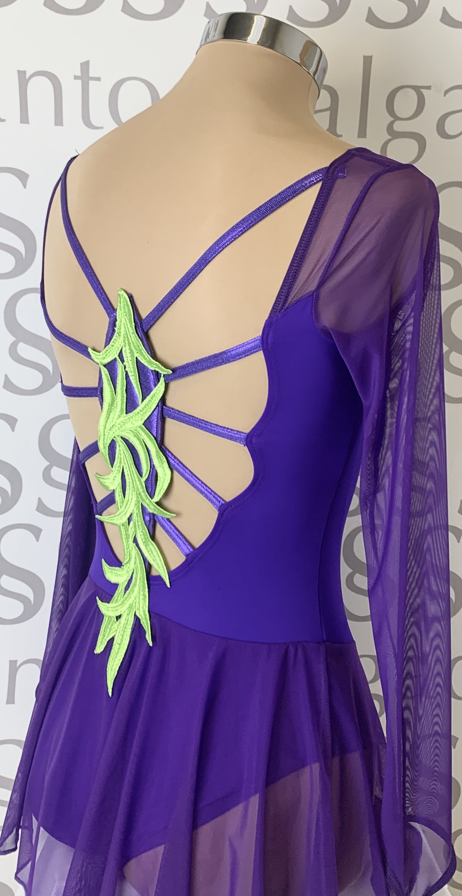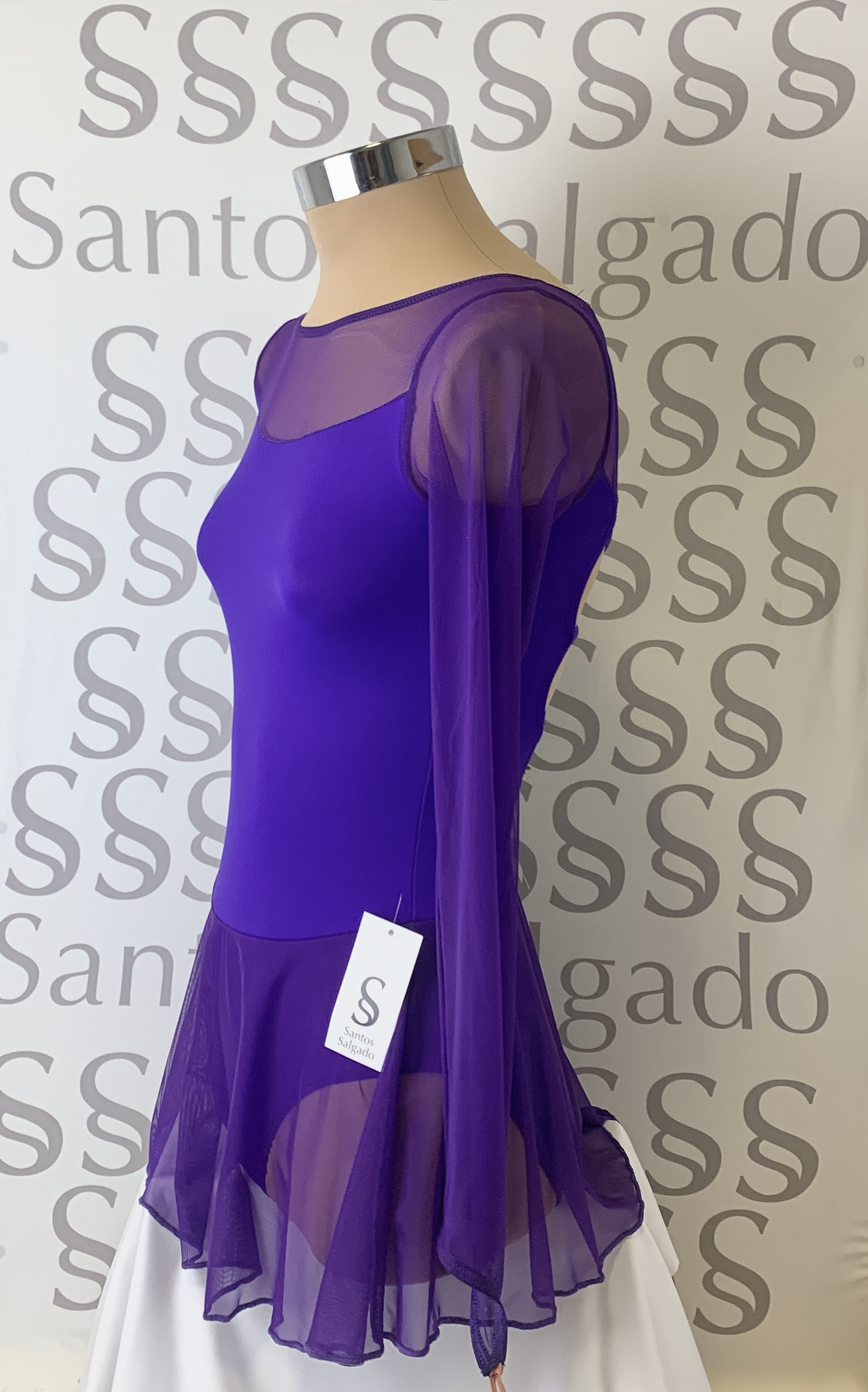 Maillot lila de manga larga y falda de gasa. Canesú transparente y preciosa espalda con detalle en verde pistacho