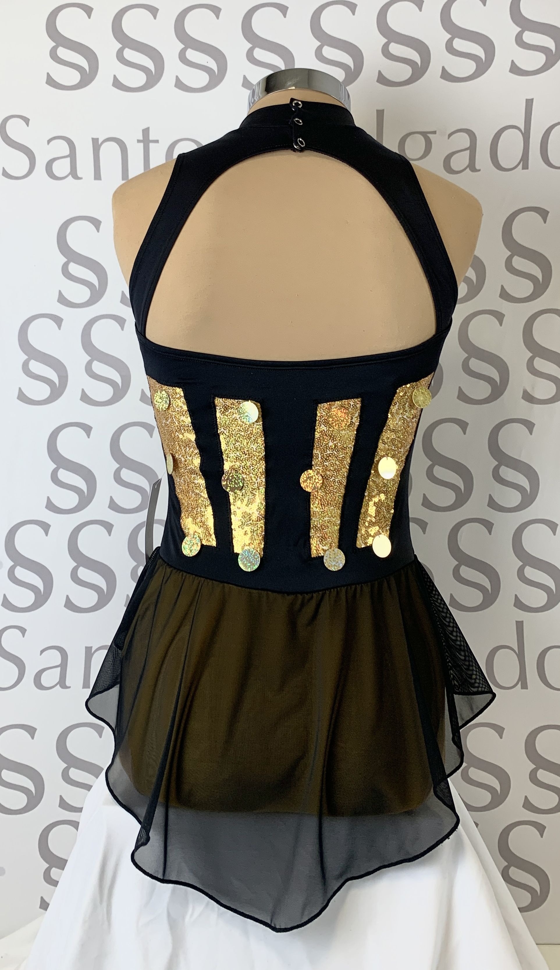 Talla 6 Maillot con falda no completa en gasa negra, cuello subido y gran escote en espalda. Detalle de tejido de lentejuela oro en parte superior y con lentejuelas disco.