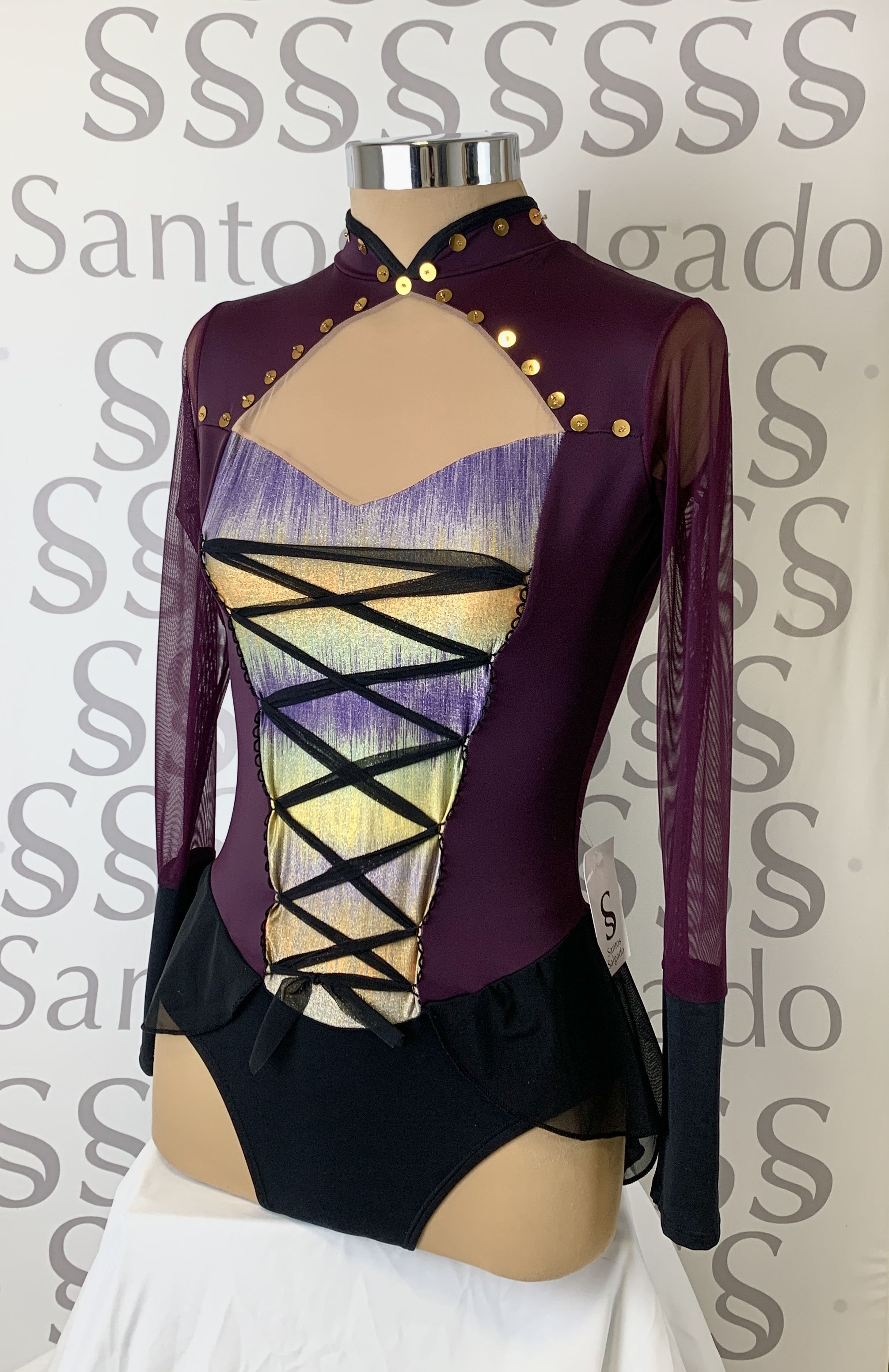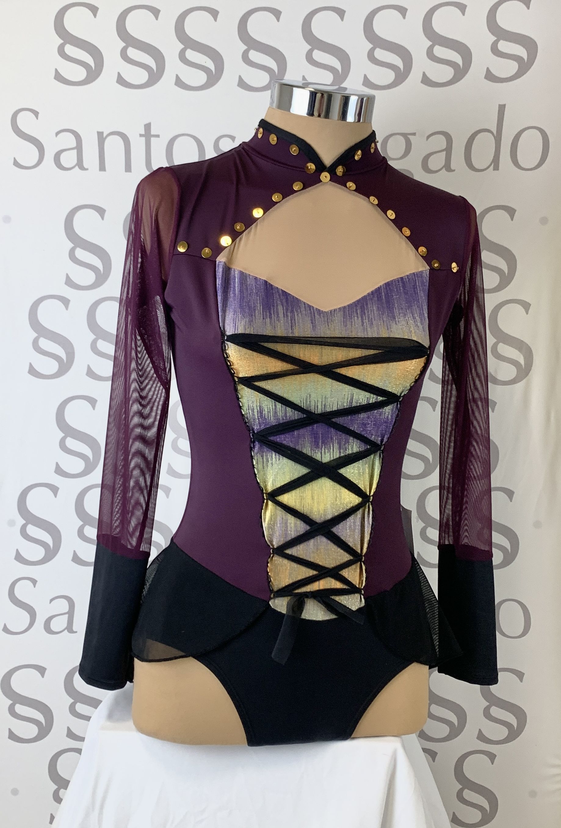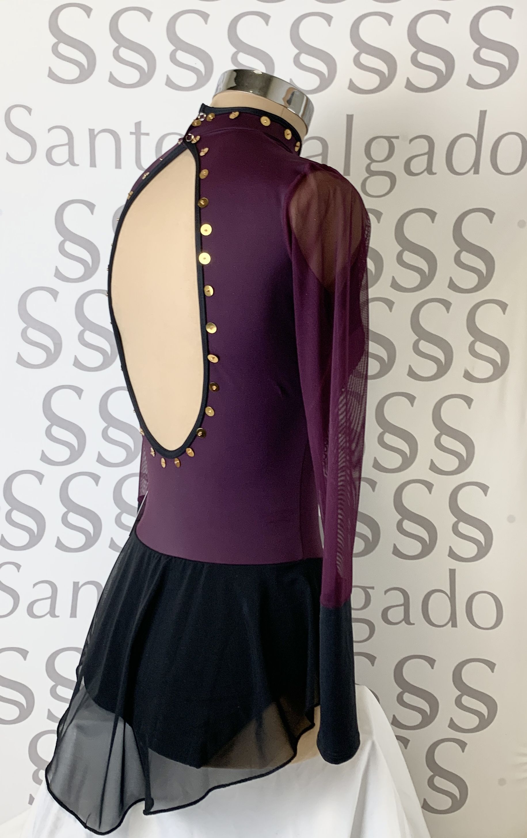 Talla 6 Maillot con falda no completa en tonos morados y negros con manga larga con gran puño y gran escote en la espalda Detalles de tejido de lurex de distintos tonos en pechera y cruzado con gasa. Lentejuelas cosidas en cuello y delantero