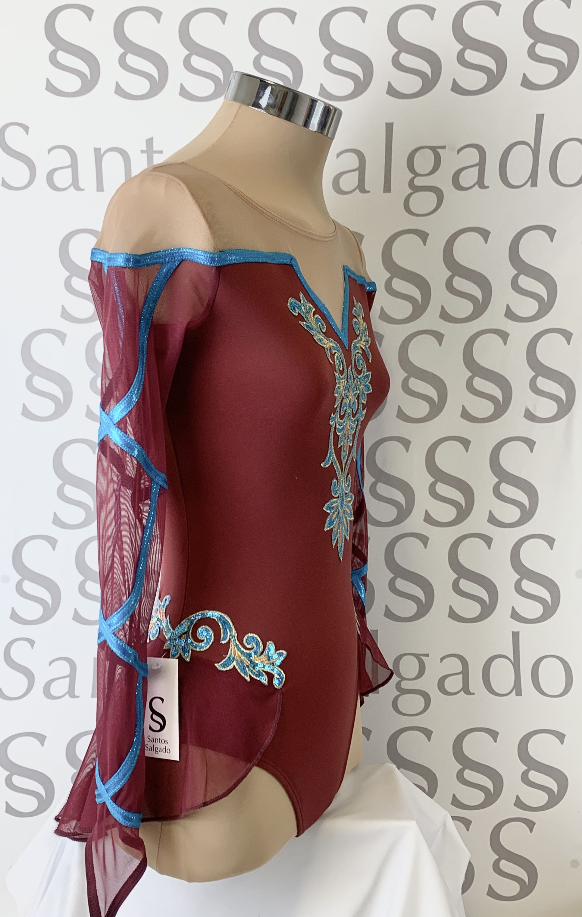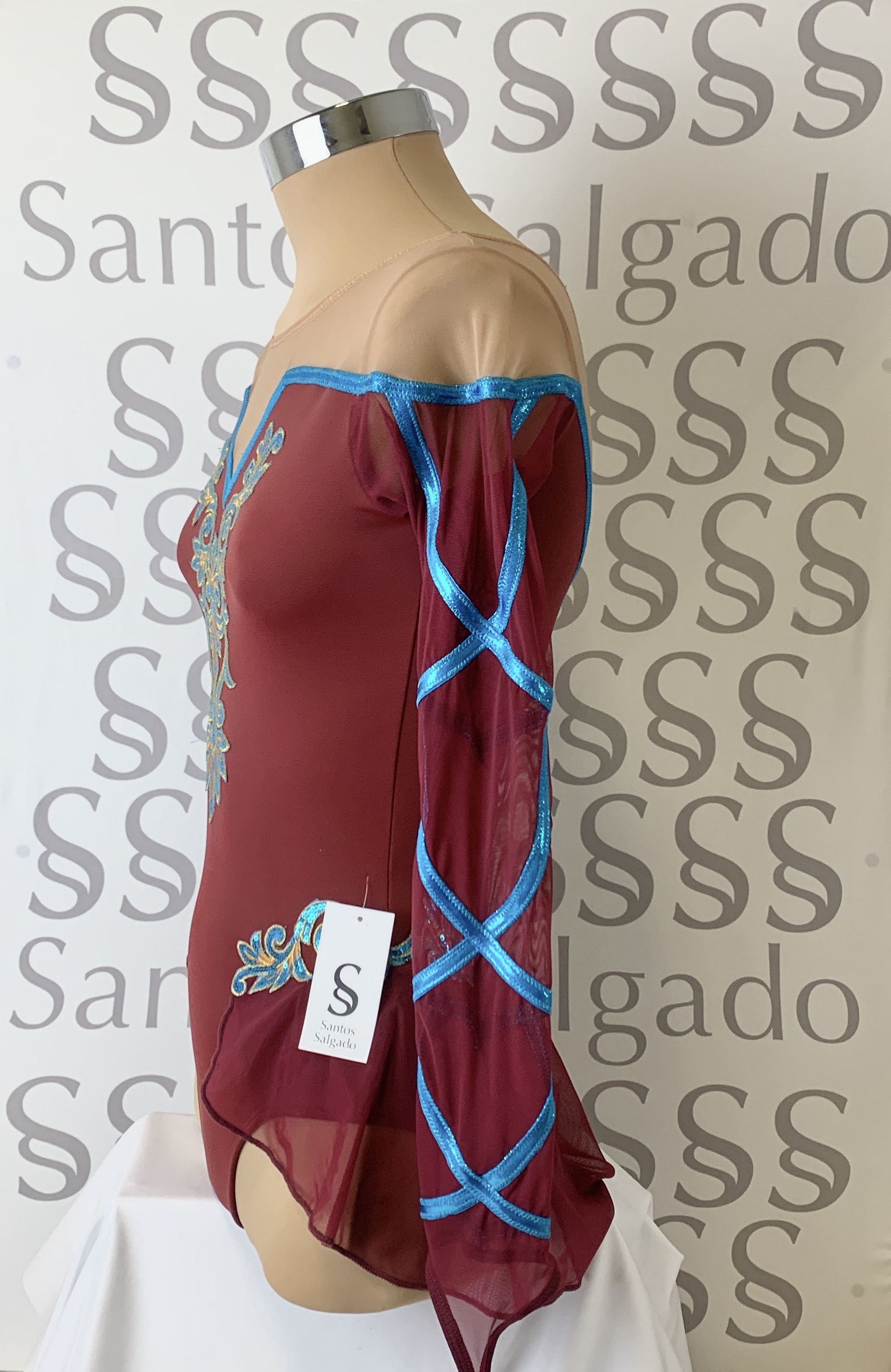 Talla 6 Maillot con falda no completa y manga larga de gasa. Escote en V, delante y atrás con parte de arriba en gasa carne. Detalle de vivos en color azul turquesa brillante y aplicación de lentejuelas a tono